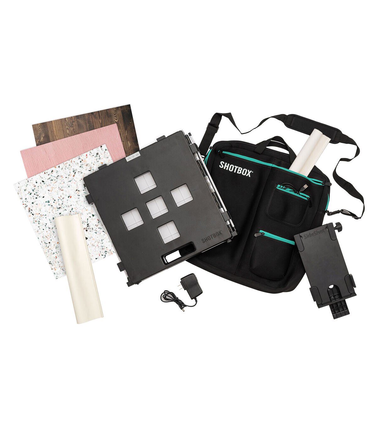 Create professional level content at home with the Shotbox by We R Memory Keepers! Keep your Shotbox and accessories safe in this premium storage bag. It's perfect for on-the-go sessions. It is made from waterproof fabric, and features an adjustable shoulder strap and multiple pockets. This package includes 1 premium storage bag.