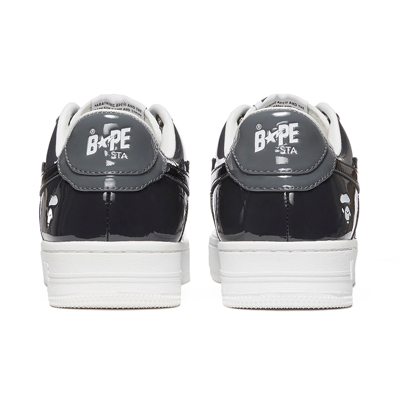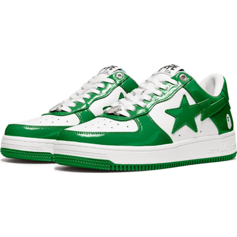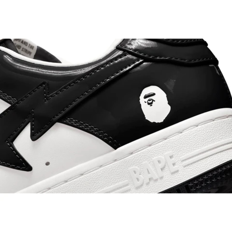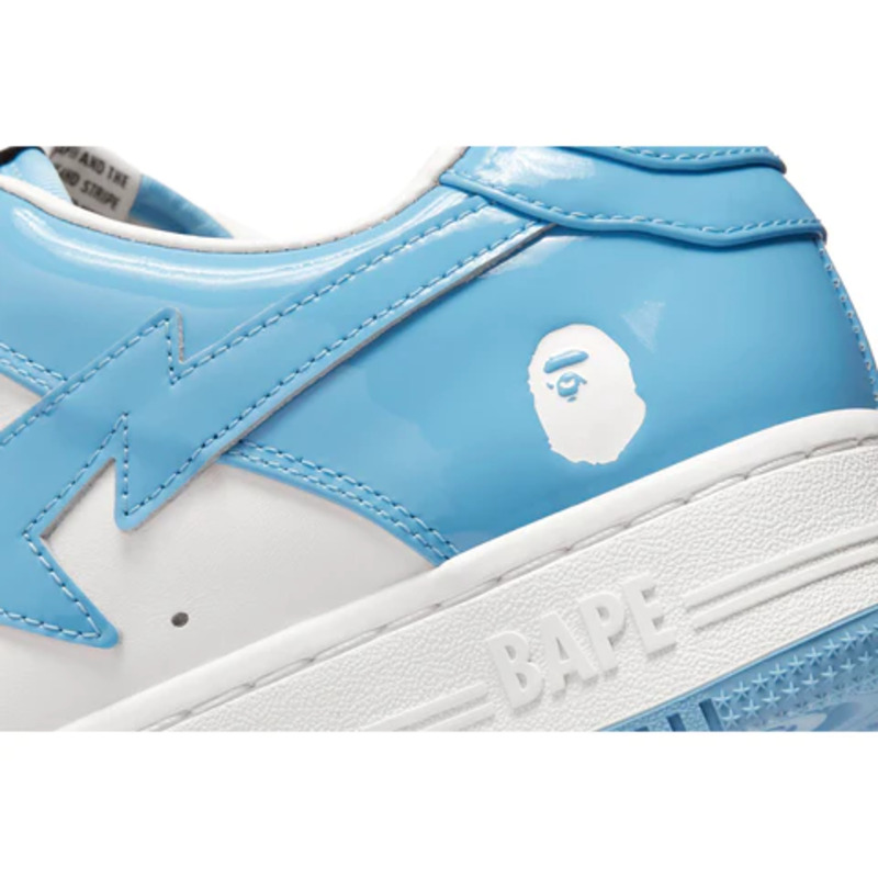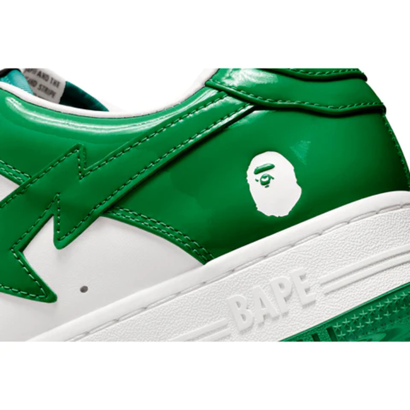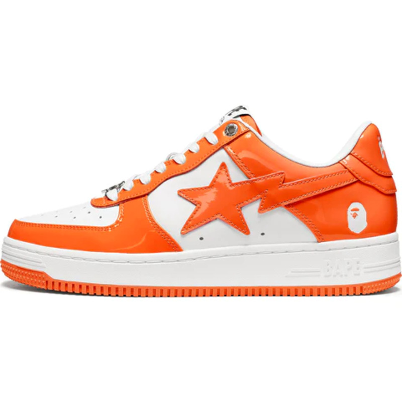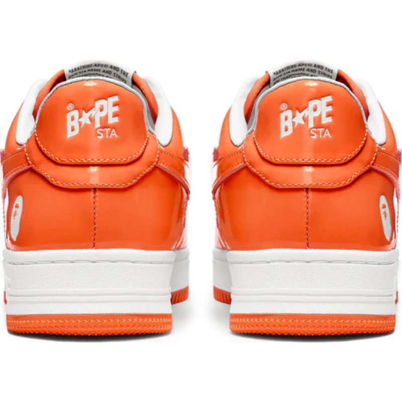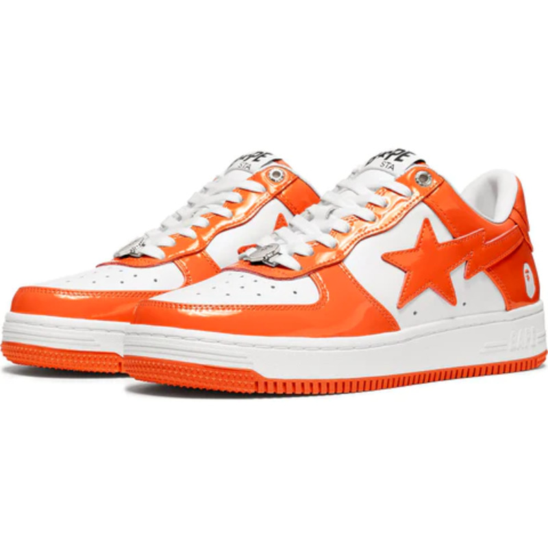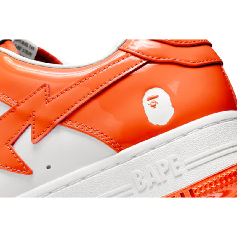 The BAPE STA Low is a lifestyle shoe from the Japanese streetwear brand. The BAPE STA's design is based on retro basketball shoes from the 1980s. The "Syracuse" features a white leather base and a contrasting patent leather color overlay. BAPE's "STA" logo appears on the patent leather on the sides of the shoe. Embroidered BAPE logo on the outside of the heel. The classic "BAPE STA" detail is printed on the heel and tongue label. BAPE lace accents accent the vamp. The shoe features a white rubber midsole and an orange outsole.