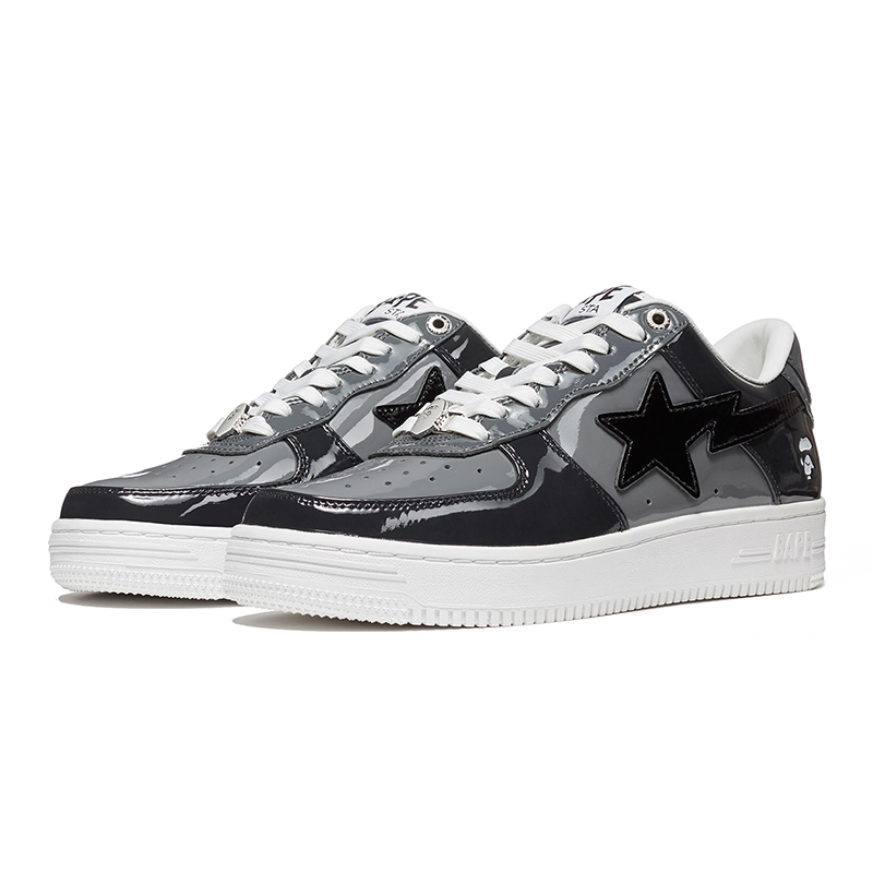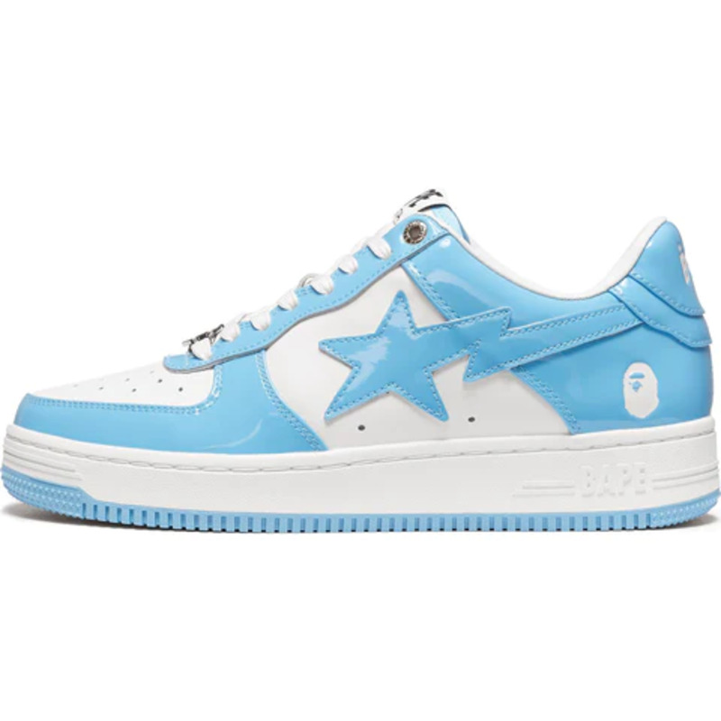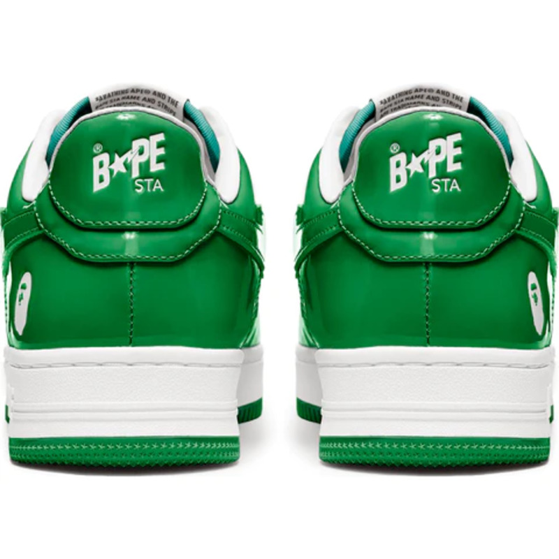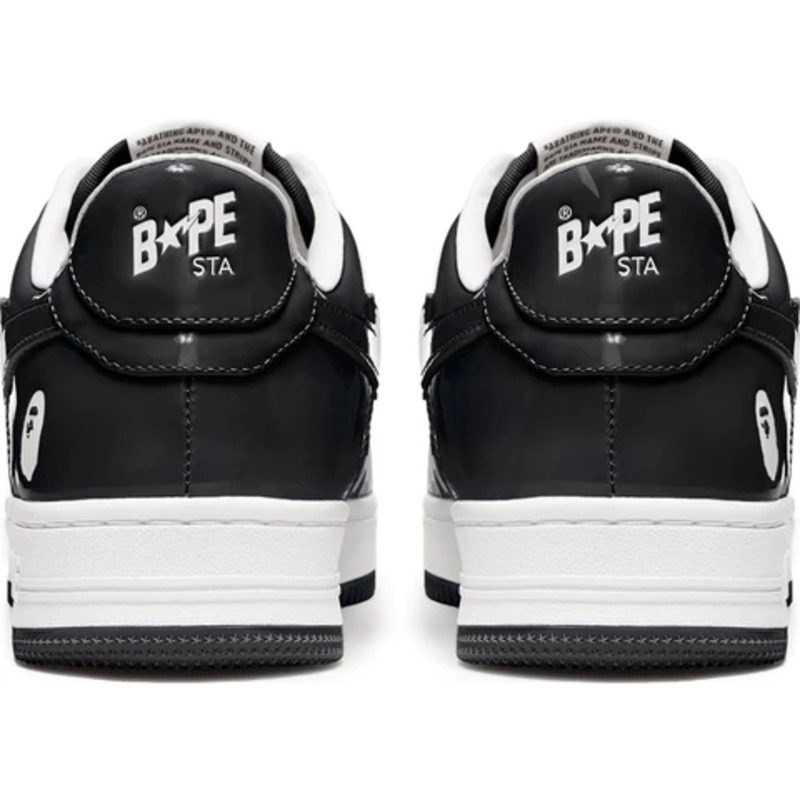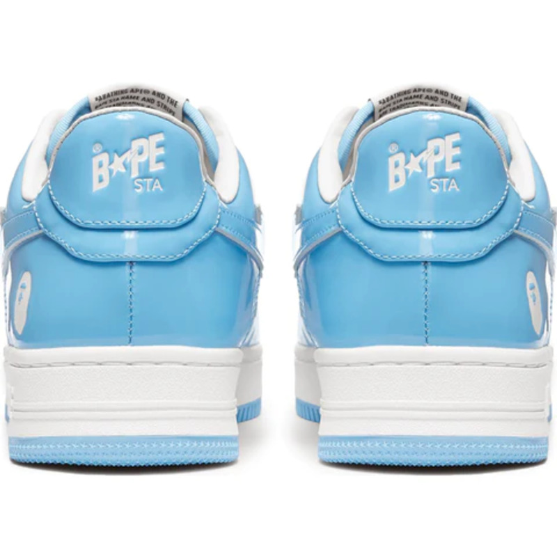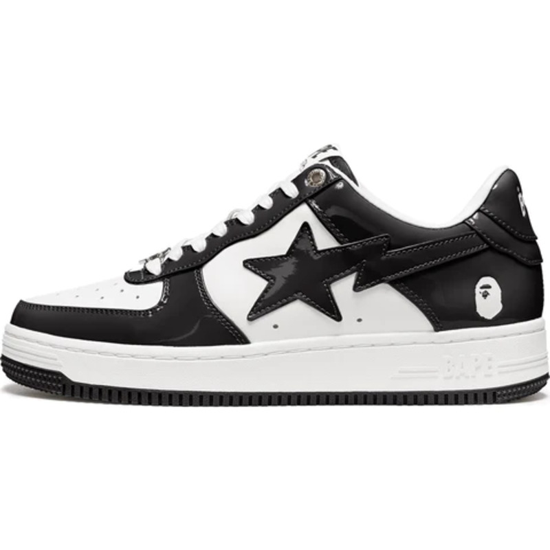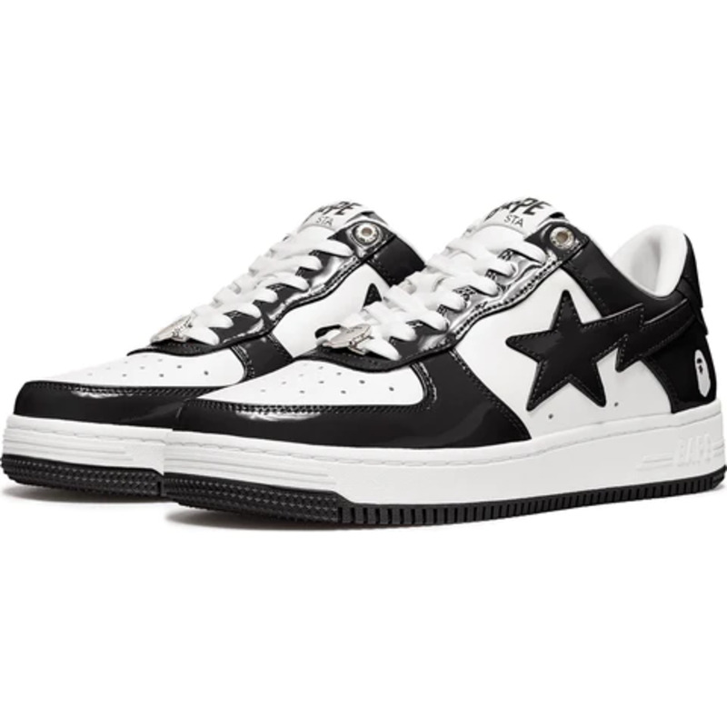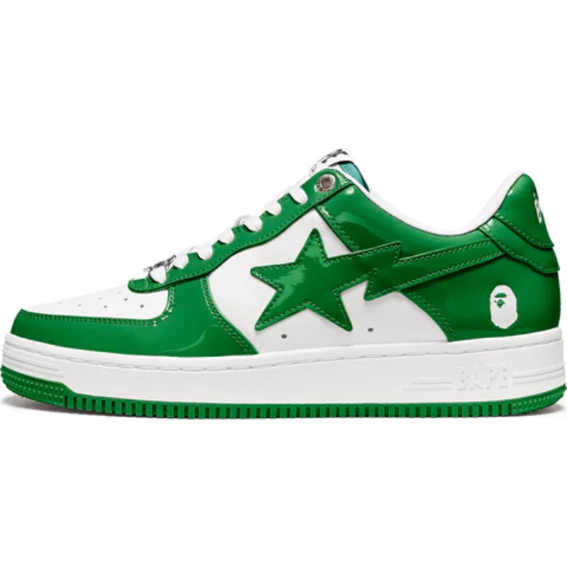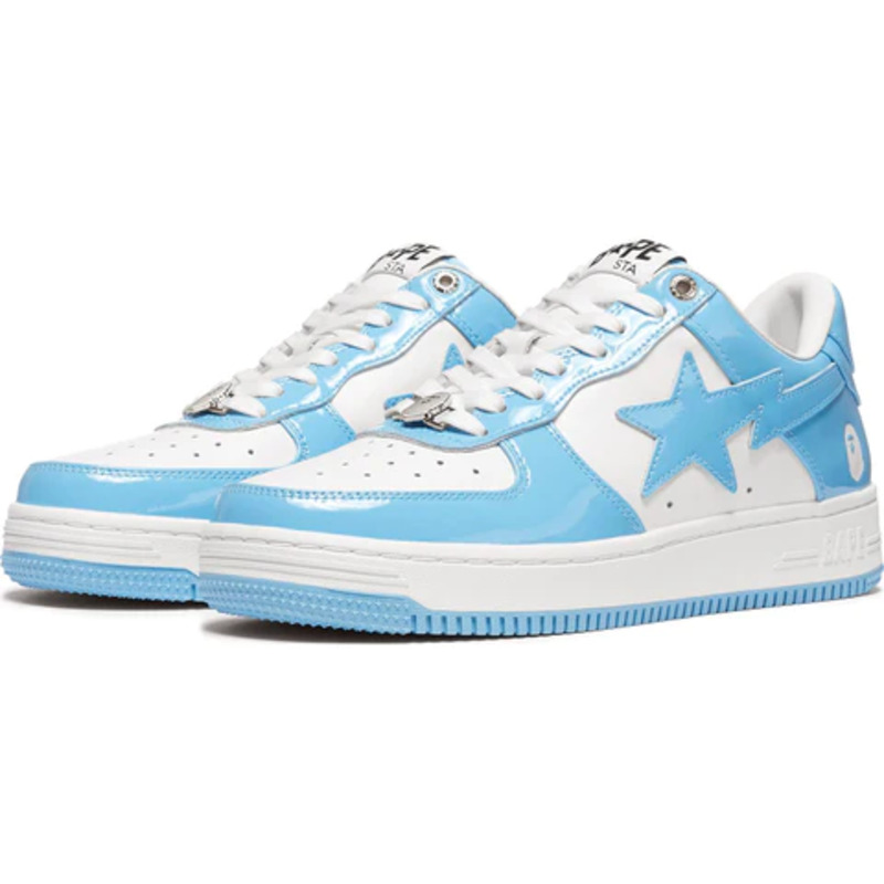 The BAPE STA Low is a lifestyle shoe from the Japanese streetwear brand. The BAPE STA's design is based on retro basketball shoes from the 1980s. The "Syracuse" features a white leather base and a contrasting patent leather color overlay. BAPE's "STA" logo appears on the patent leather on the sides of the shoe. Embroidered BAPE logo on the outside of the heel. The classic "BAPE STA" detail is printed on the heel and tongue label. BAPE lace accents accent the vamp. The shoe features a white rubber midsole and an orange outsole.