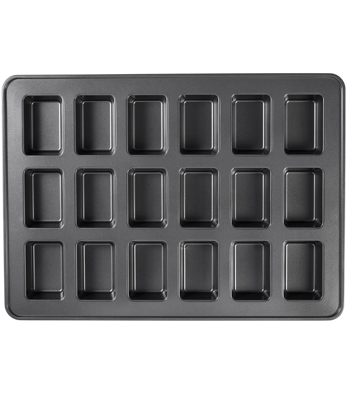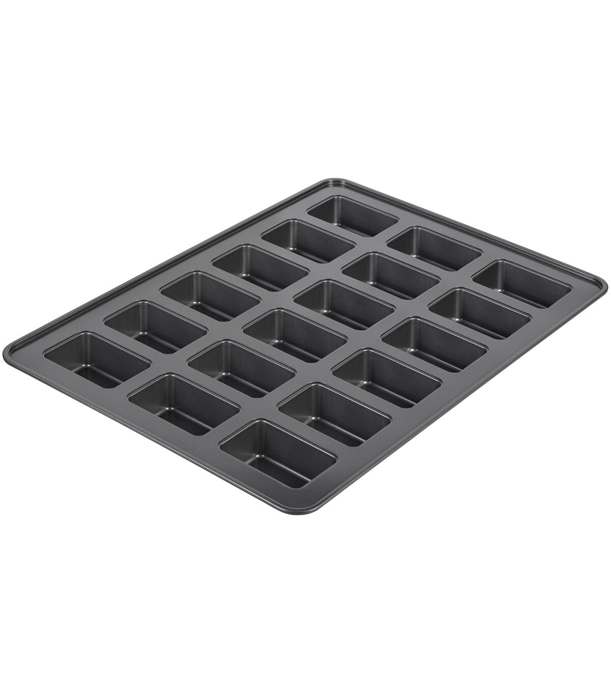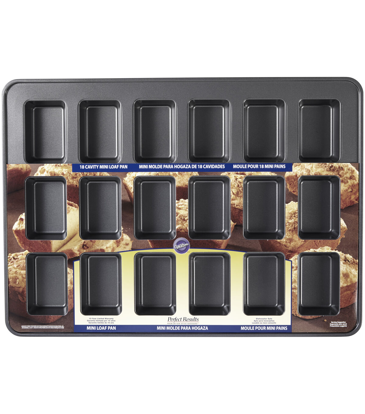 Wilton-Perfect Results Mega Mini Loaf Pan. Bake small and delicious treats using this pan! Pan has a quick release. This package contains one 15-3/8x21x3/8x1-1/4 inch non-stick mega mini loaf pan with eighteen separate cavities measuring approximately 3-3/4x2- 1/4x1-1/4 inches each. Dishwasher safe. Imported.This product contains: Steel (Iron, Aluminum, Zinc, Manganese, Phosphorus). For more information about the chemicals in this product, visit/Para más informacíon sobre los químicos en este producto visite https://wilton.com/california-ab-1200/.