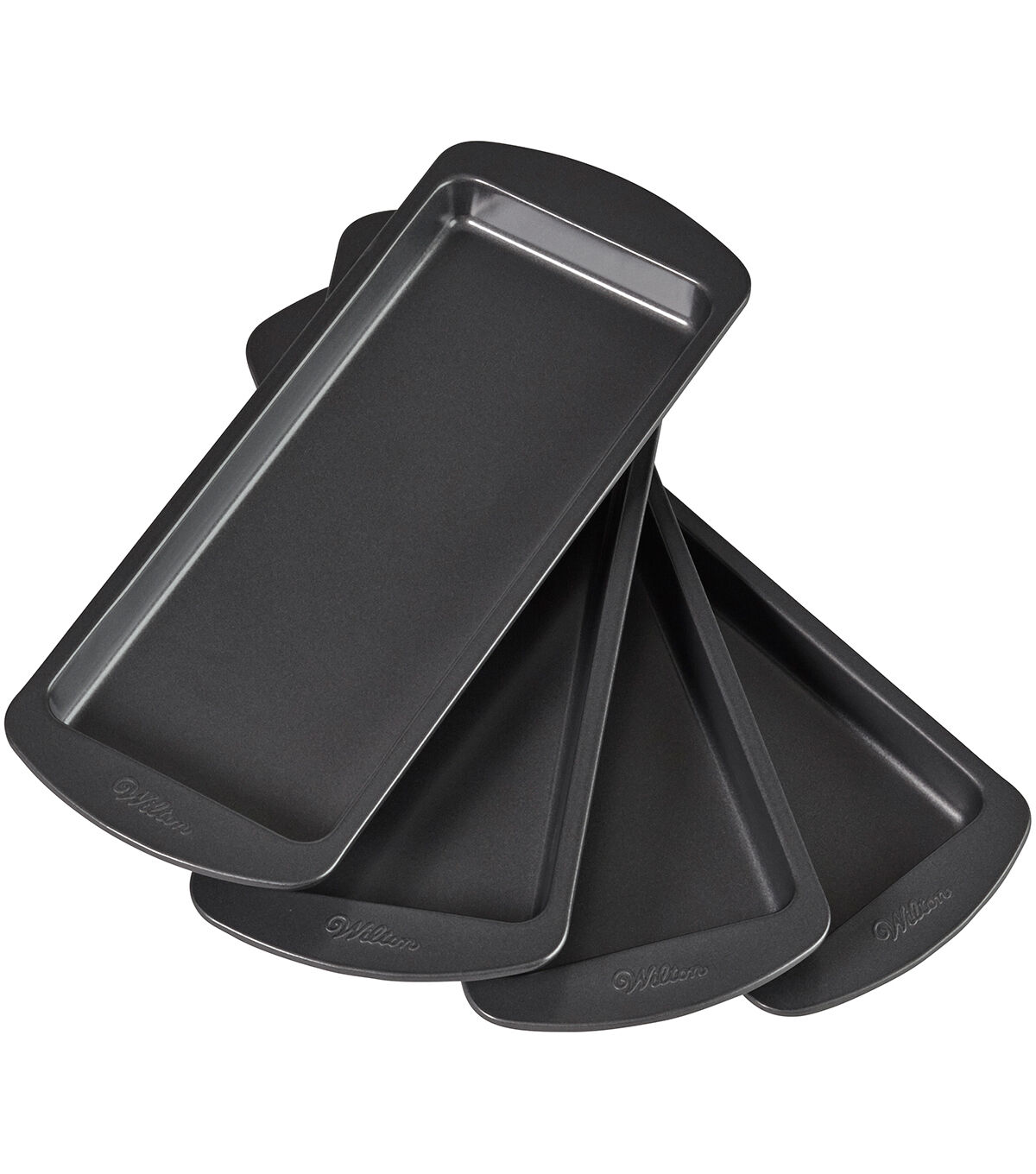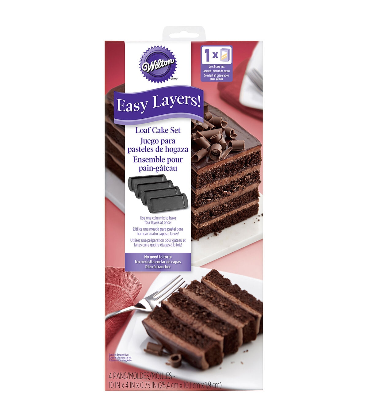 Wilton-Easy Layers Loaf Pan Set. Baking layer cakes is easier than ever with this pan set! One cake mix makes four perfect layers, ready to stack and fill. The possibilities are endless! This package contains four 3/4x10x4 inch cake pans. Dishwasher safe. Imported.This product contains: Steel (Iron, Aluminum, Zinc, Manganese, Phosphorus). For more information about the chemicals in this product, visit/Para más informacíon sobre los químicos en este producto visite https://wilton.com/california-ab-1200/.