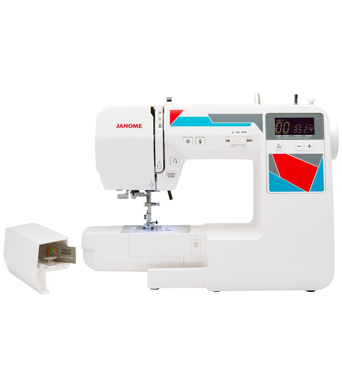 - Easy convenience buttons: Right by the needle, you’ll find a start/stop button for sewing without the foot control and a reverse button. There is also a locking stitch button and needle up/down button by the LCD display.