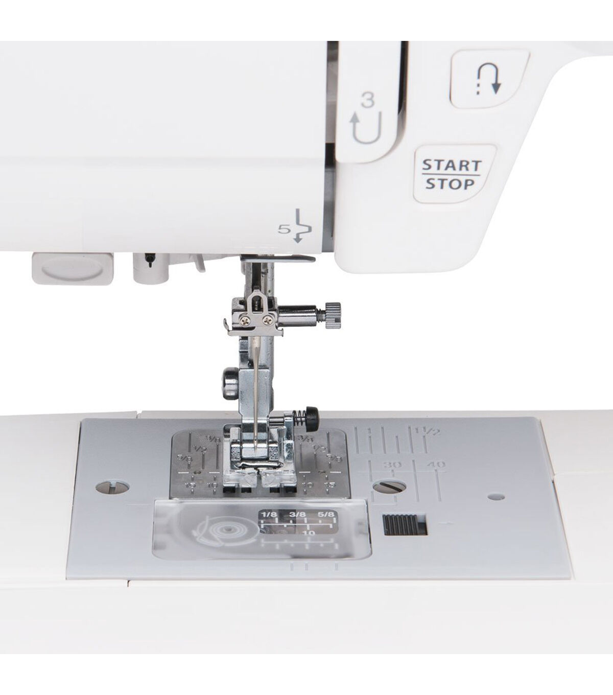 - Start/stop button: The start/stop button allows the machine to sew without using the foot pedal. This feature is great for sewing long seams or for quick mending.