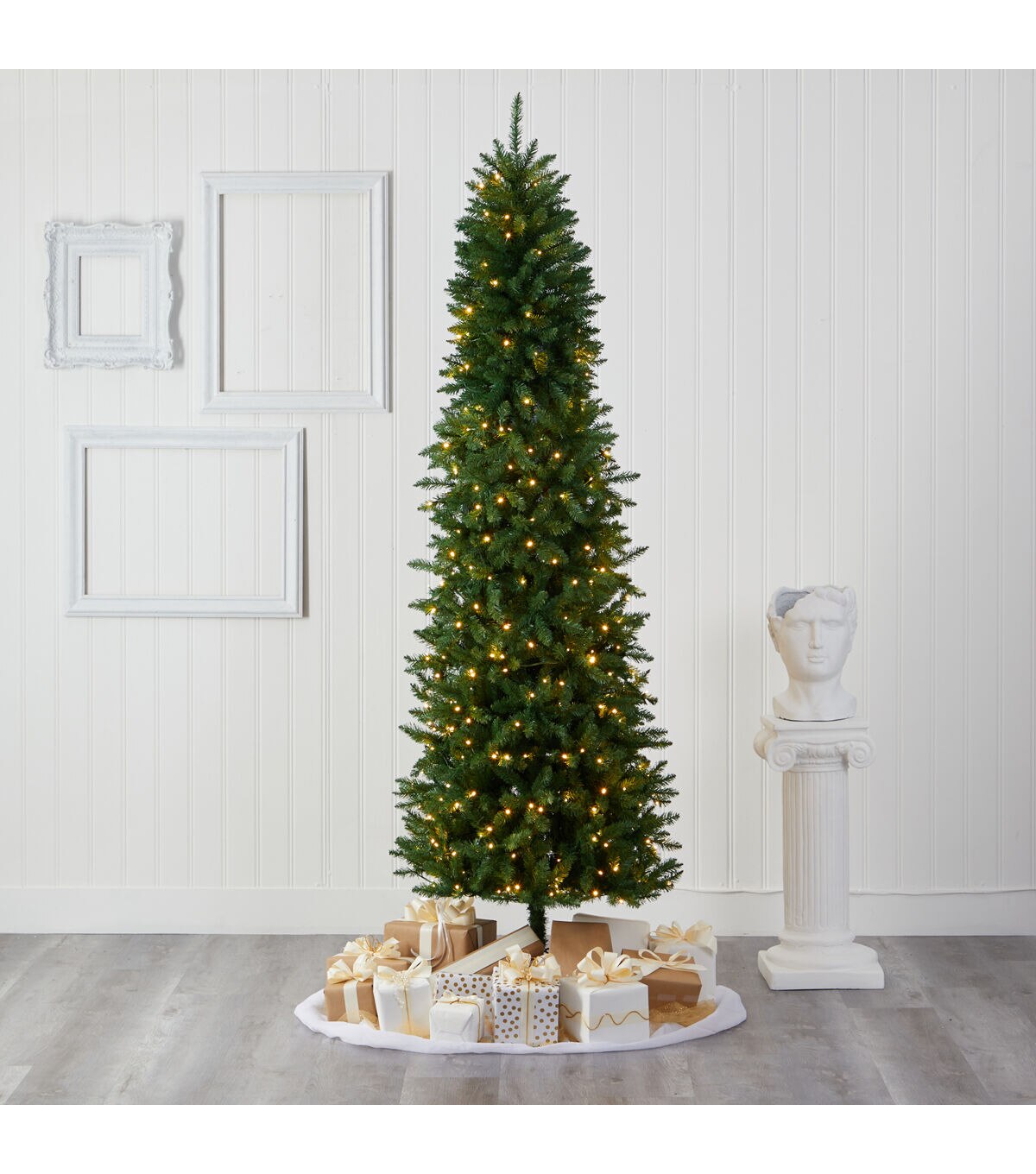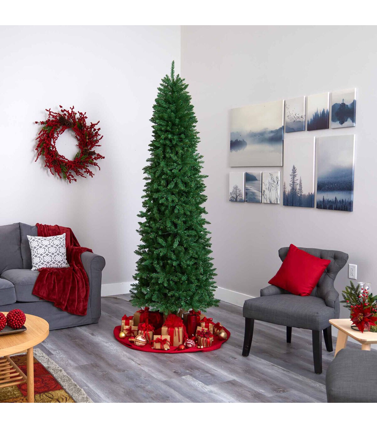 Incorporate seasonal evergreens into your decor scheme this holiday - even in the tightest spaces! - with the help of this artificial Christmas tree. Entirely maintenance free, it features a slim, tight silhouette made up of mountain pine greenery with 1348 easy-to-bend branches for showcasing all your holiday ornaments and arrives pre-strung with 400 clear LED lights to help eliminate the hassle of tangles or knots. Guaranteed to make holiday decorating stress-free, this slim-fitting artificial Christmas tree stands tall and proud at 8’, stabilized on a metal stand for effortless display all season long. About Nearly Natural Inc. - For over 75 years, Nearly Natural Inc. has been providing conscientious consumers with beautiful alternatives to natural decorations. Employing and advised by naturalists who understand the live plant world, Nearly Natural is able to recreate the most realistic-looking decorative items for homes, offices, and businesses. Driven by a true commitment to customer service, attention to detail, and natural philosophy, Nearly Natural strives to bring customers the most beautiful, unique, and striking faux plants and floral on the market.