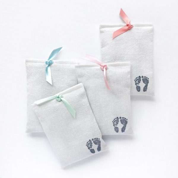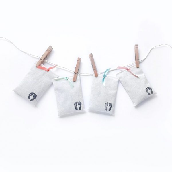 Each Dryer Sachet features a tiny footprint pattern graphic and is trimmed with a pastel color ribbon.
