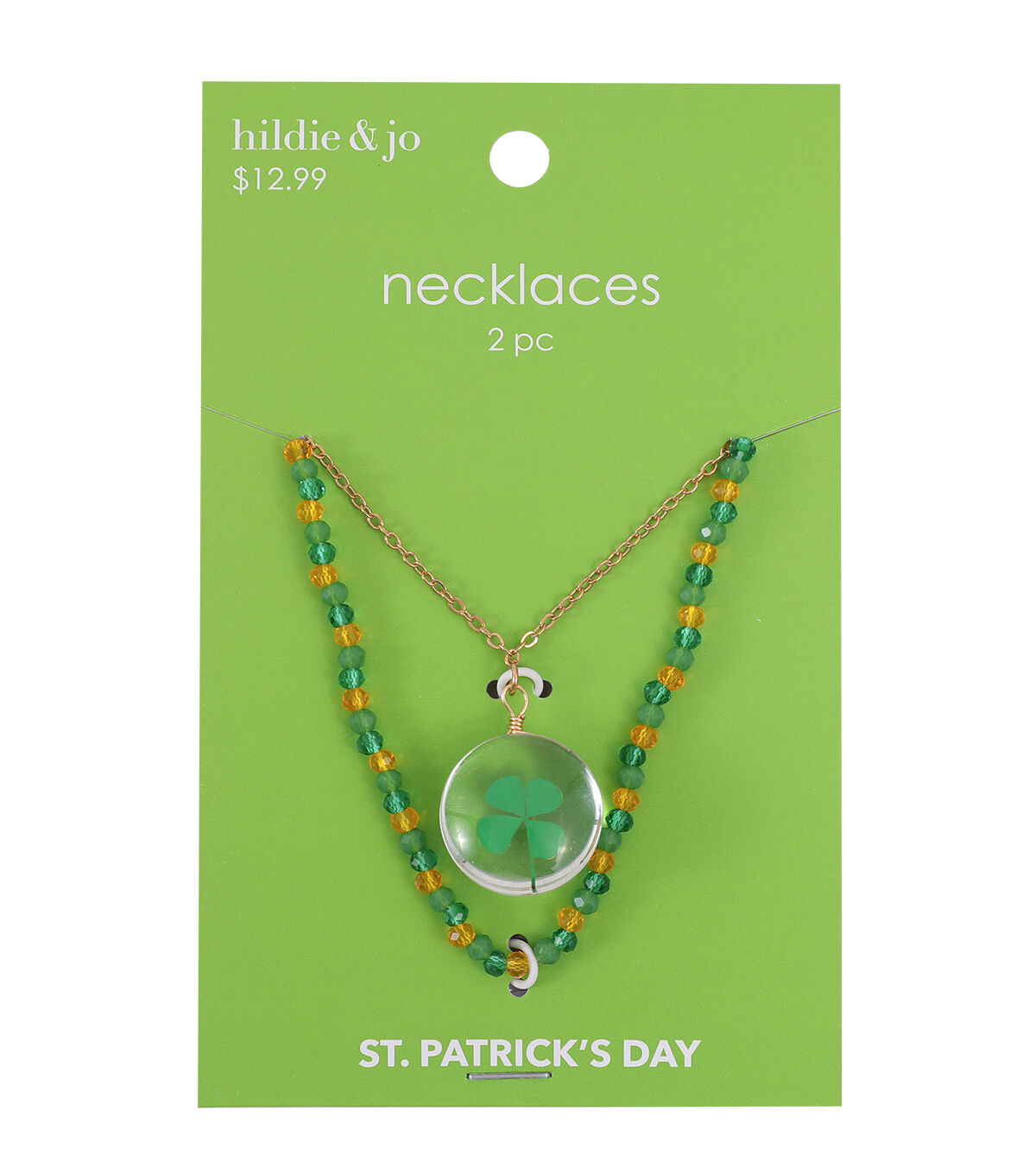Show off your unique sense of style at the next St. Patrick’s Day party by wearing the St. Patrick's Day Shamrock Charm Beaded Necklaces by hildie & jo. This pack includes a gold-toned chain-link necklace and a beaded necklace in shades of green and gold. The chain-link necklace is designed with a clear circular pendant with a shamrock leaf accent in it. You can also team them with coordinating shamrock-leaf earrings, sold separately, for the complete look.