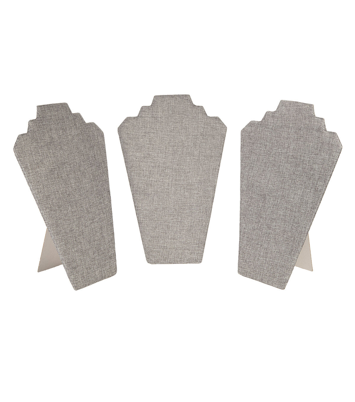 Flaunt your precious jewelry on a mounted glass shelf using the Get Organized Large Flat Back Burlap Necklace Easel-Gray. This burlap easel sports tiered edges with two different hanging points for displaying multiple necklaces without any hassle. It has a flat back with a fold-away style that allows for easy storage.