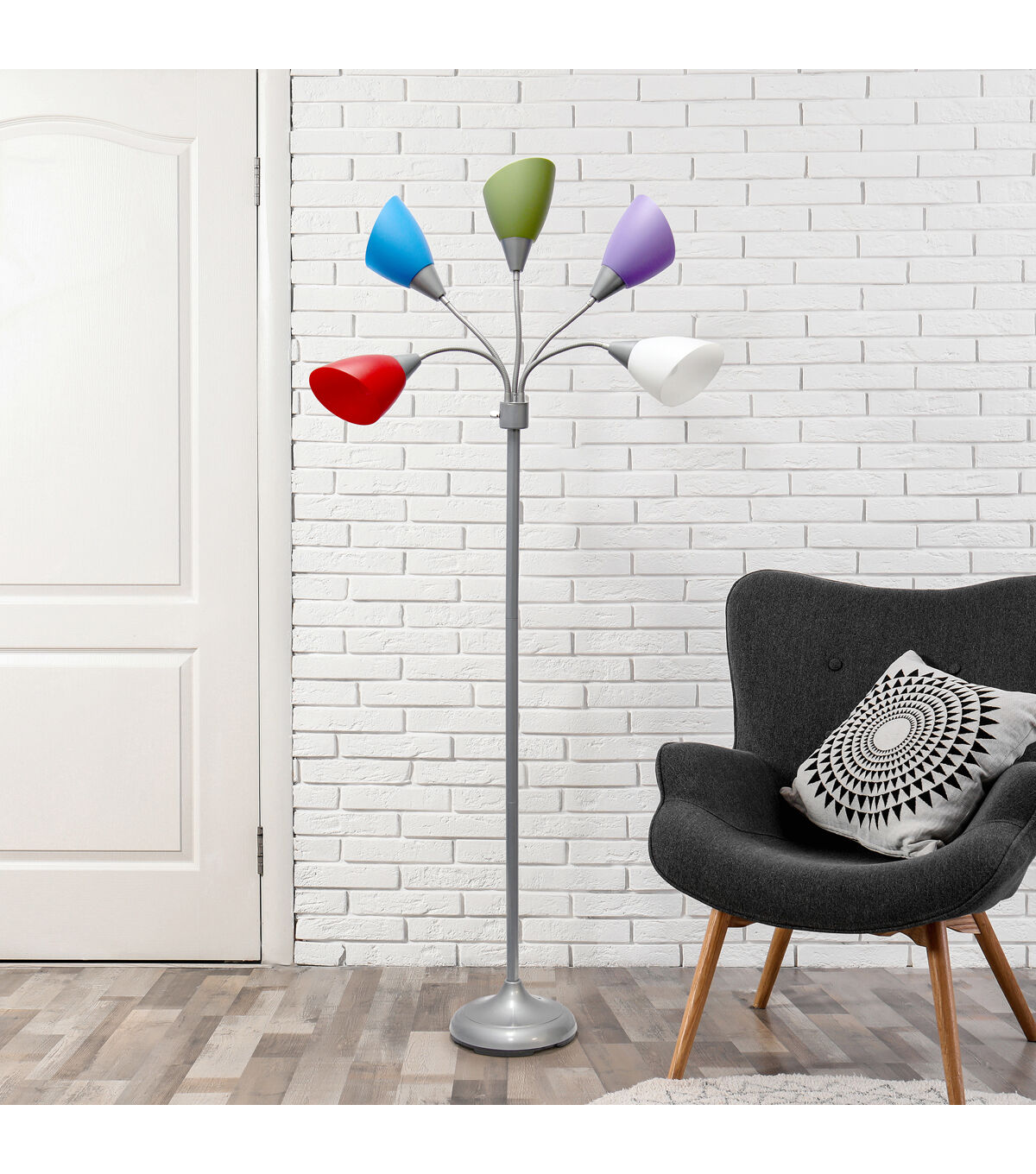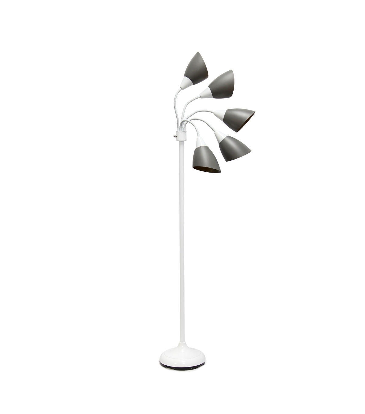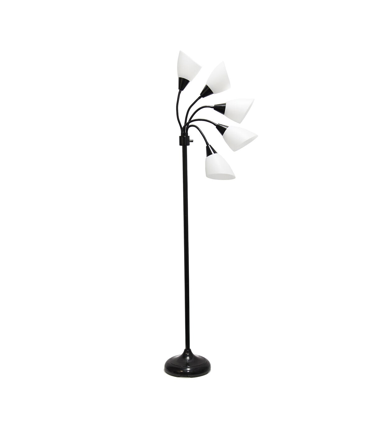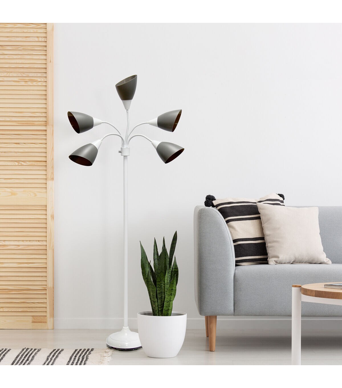 What a fun and trendy floor lamp this is! With a tall sturdy base below 5 flexible goosenecks extending to a plastic sloping shade, this metal lamp is ideal for environments requiring different directions of light as needed. The extensions are easy to maneuver to provide light up, down, sideways, etc. without having to move your lamp from its location. Check out all of the available base finish/shade color options available to suit your needs.
