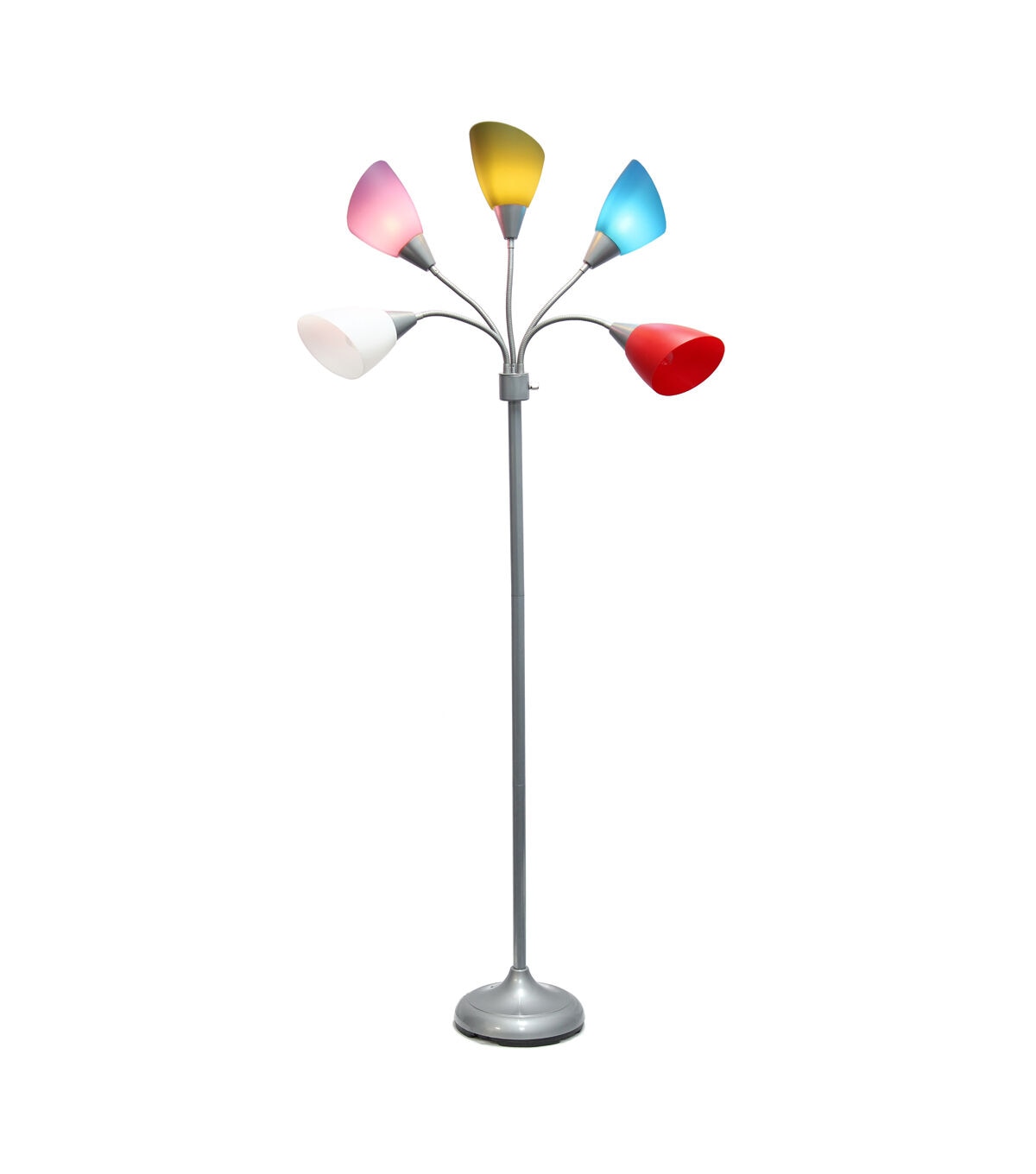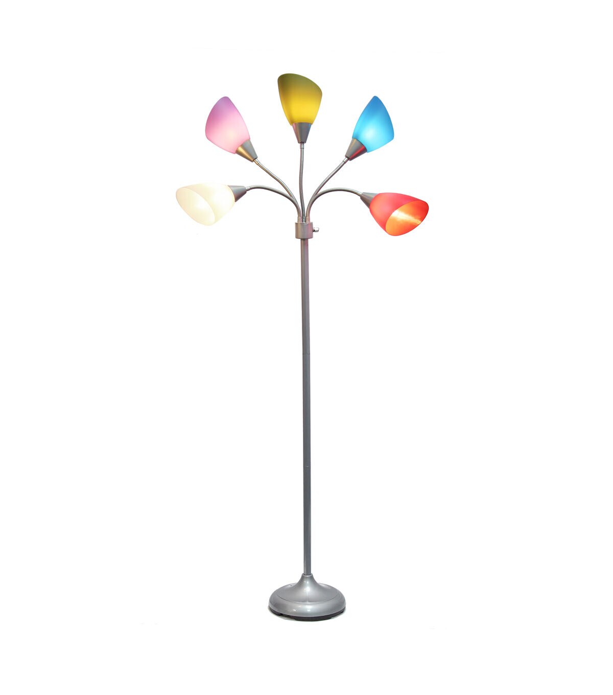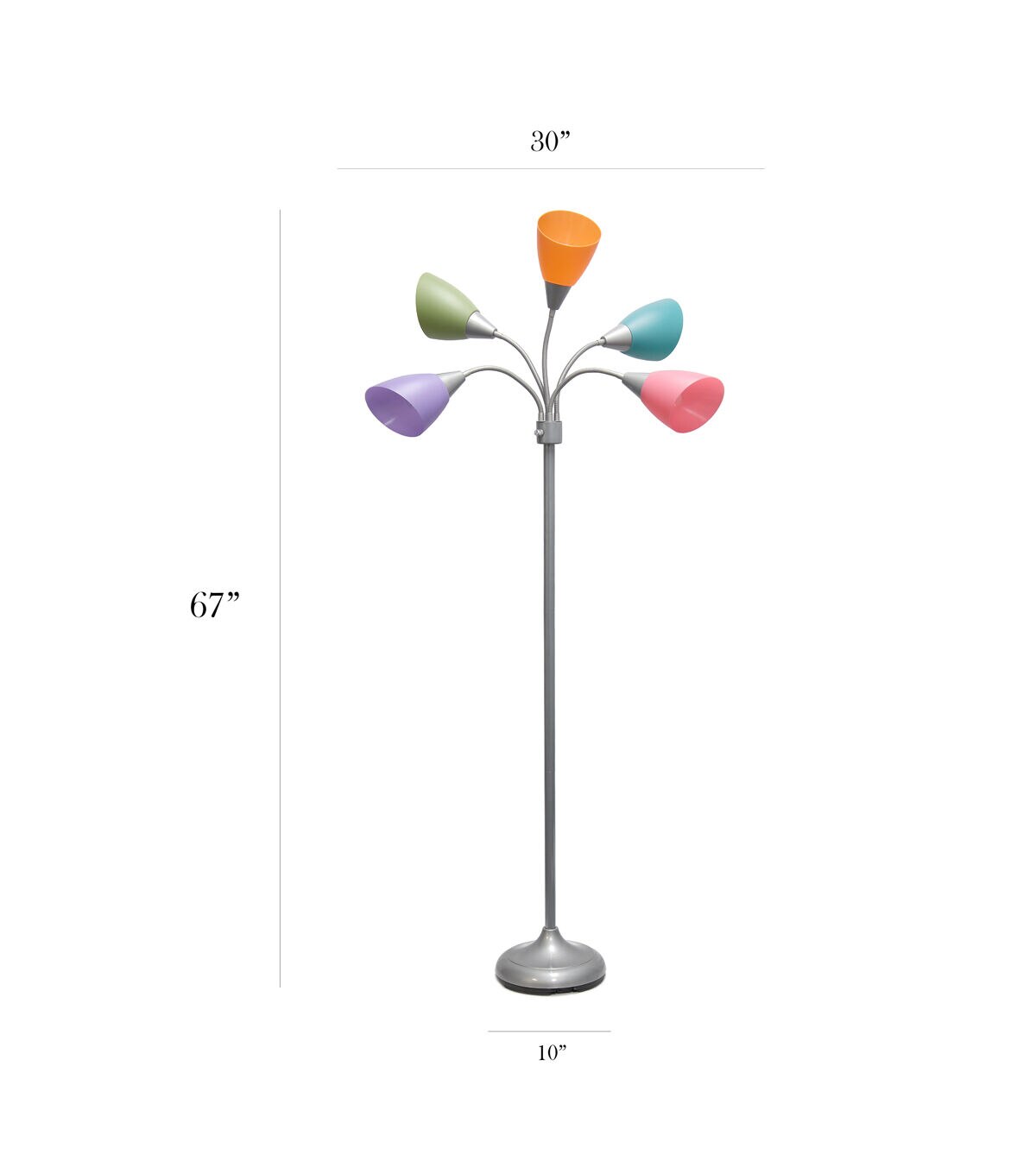 What a fun and trendy floor lamp this is! With a tall sturdy base below 5 flexible goosenecks extending to a plastic sloping shade, this metal lamp is ideal for environments requiring different directions of light as needed. The extensions are easy to maneuver to provide light up, down, sideways, etc. without having to move your lamp from its location. Check out all of the available base finish/shade color options available to suit your needs.