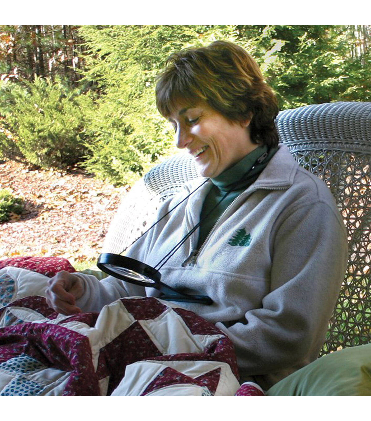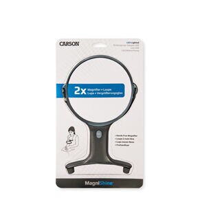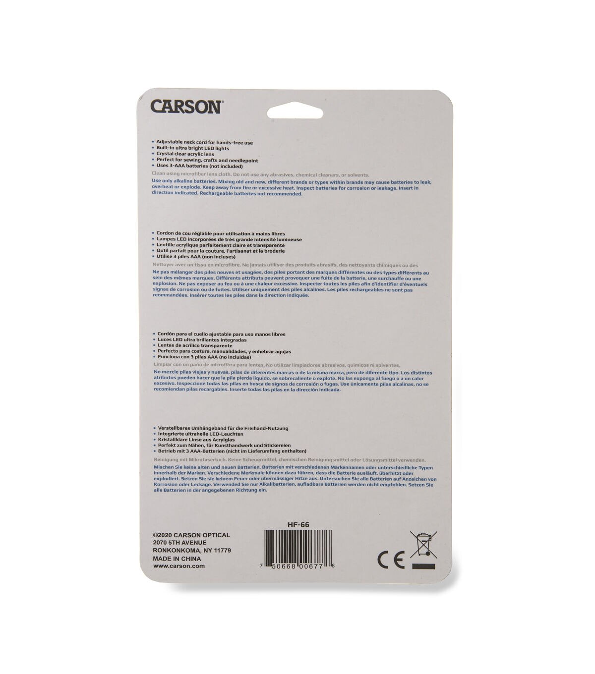 The MagniShine (HF-66) from CARSON is an LED Lighted 2x power neck worn handsfree magnifier that is popular with crafters and sewers. The wide 5 inch acrylic lens allows for greater viewing flexibility without adding undue stress to your neck. It’s equipped with a bright light dual-LED, making viewing easy in any light condition. The wide bridge and adjustable neck strap are designed to be used at various angles to accommodate a wide range of visual needs and comfort. Simply hang it around your neck, adjust the bridge and strap to a comfortable viewing distance and enjoy hours of hands free use. This magnifying glass is perfect for hobbies, crafts, needlepoint, crochet, and cross-stitch. Uses 3-AAA Batteries (not included). At Carson, we are so confident in our magnifiers that we back them with a Lifetime Limited Warranty!