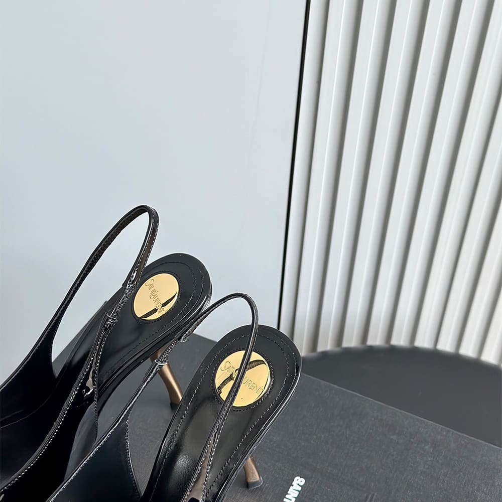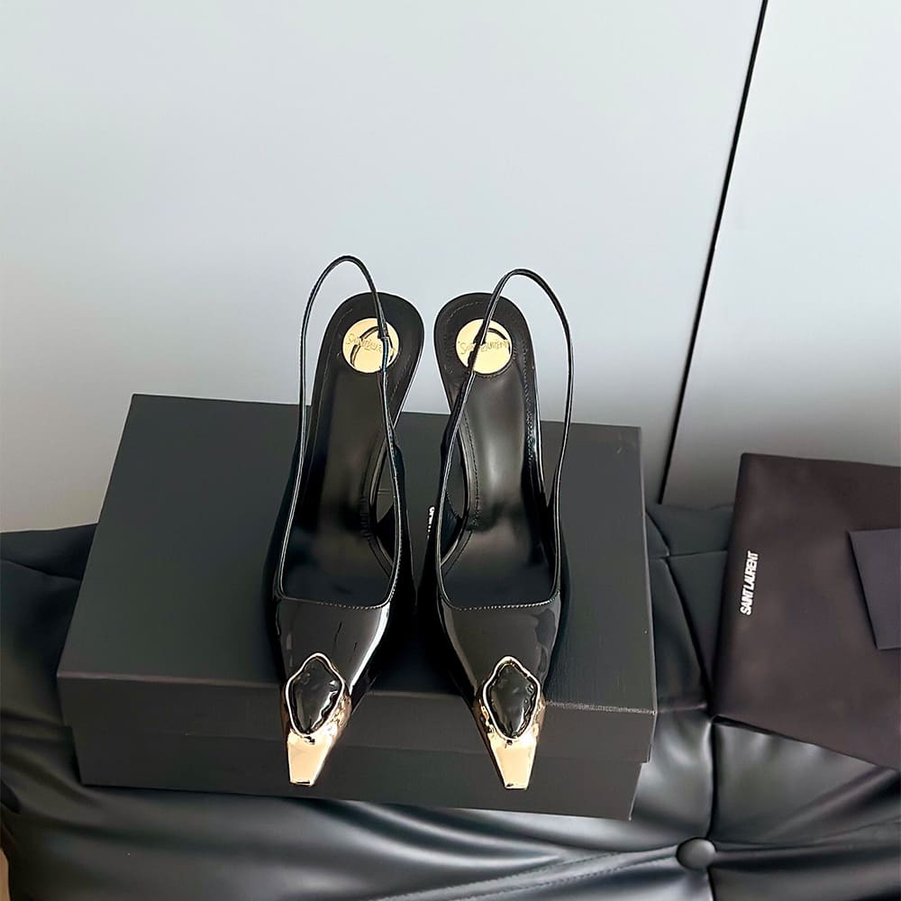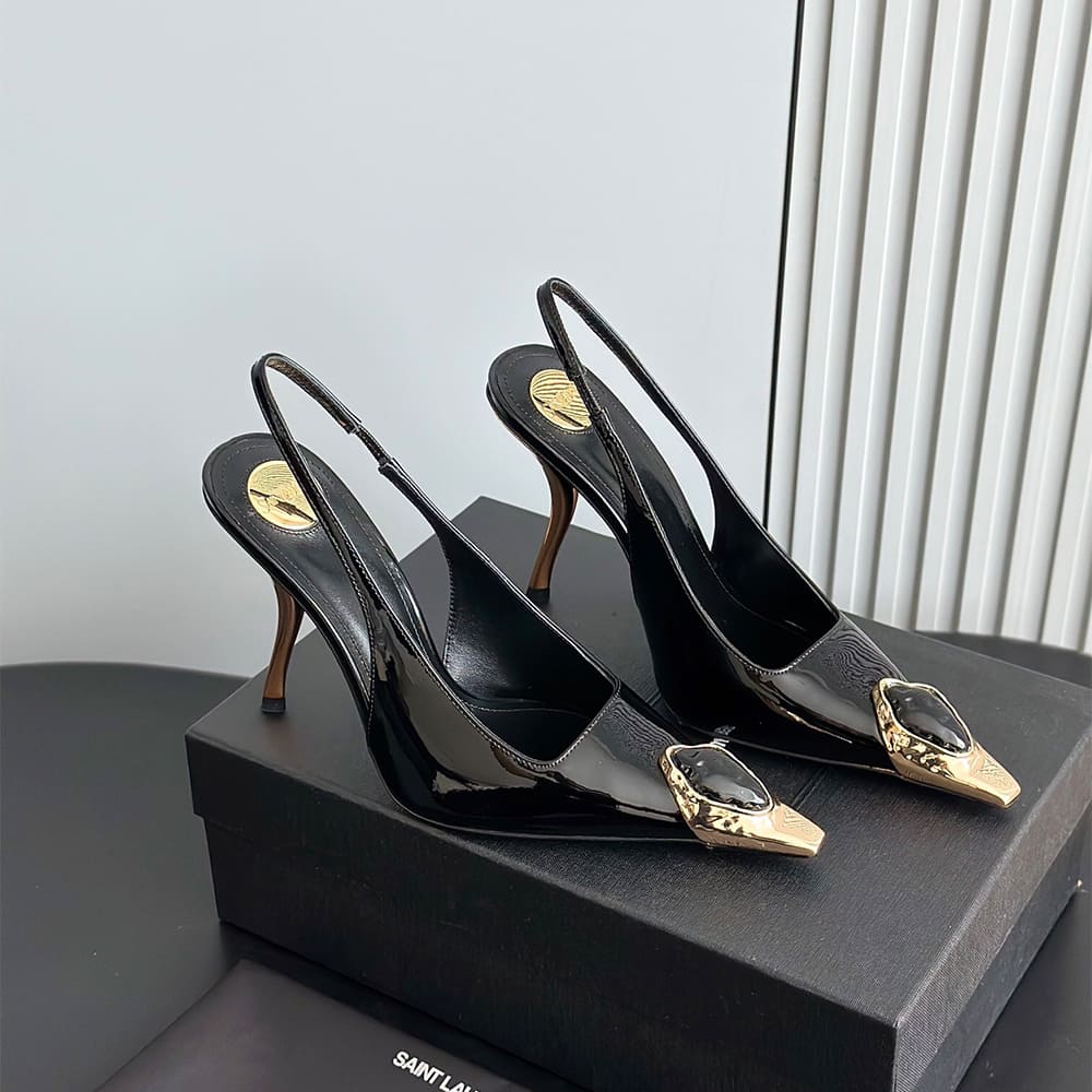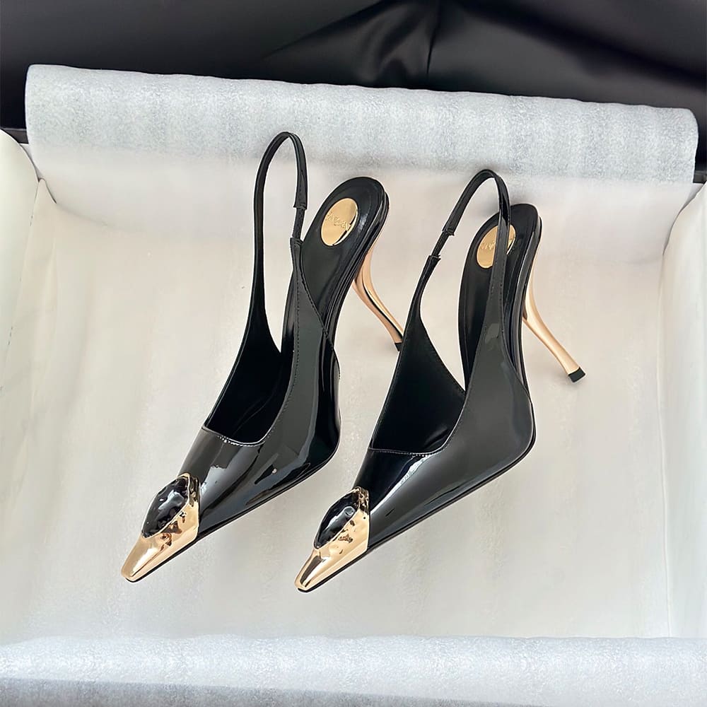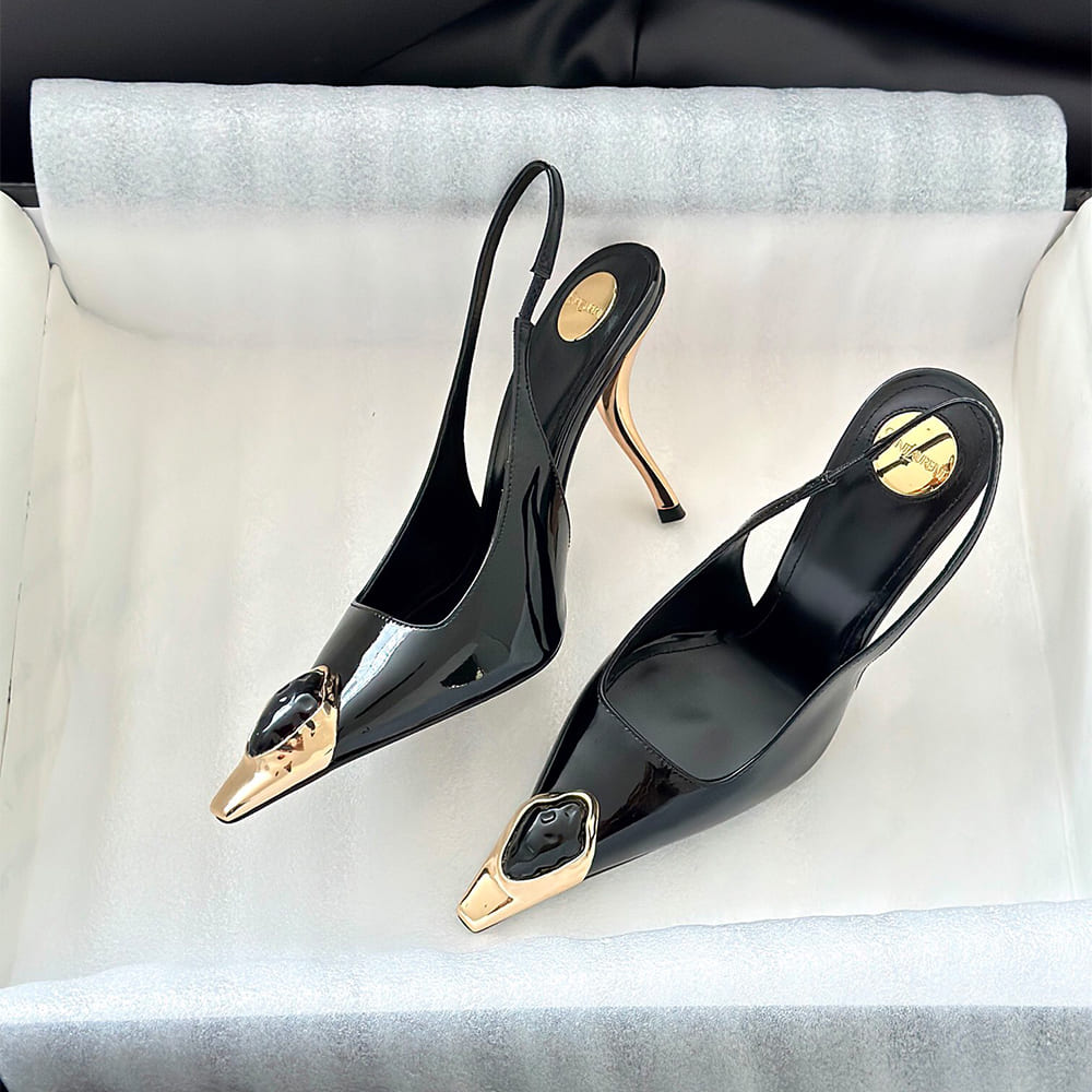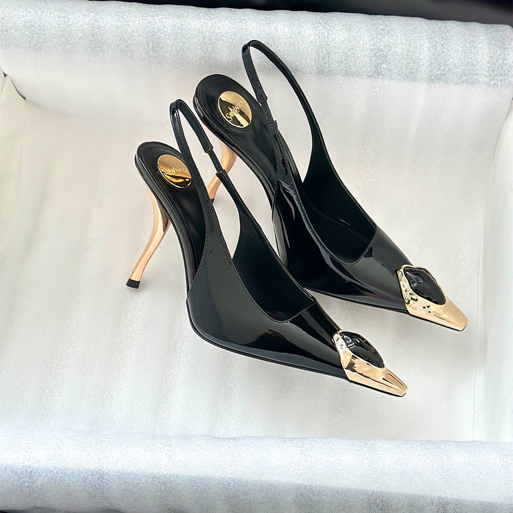 Slingback pumps featuring a curved stiletto heel in gold-plated solid metal and an elongated pointed toe with a resin cabochon steel toe cap.