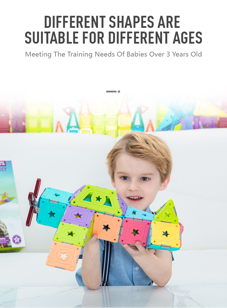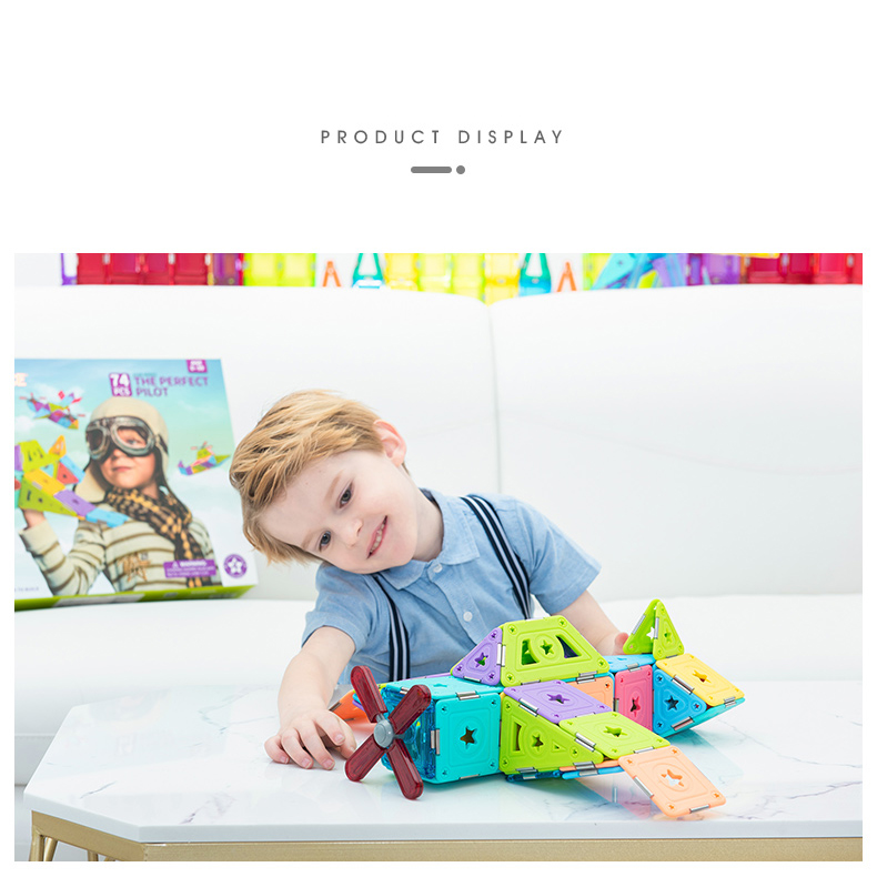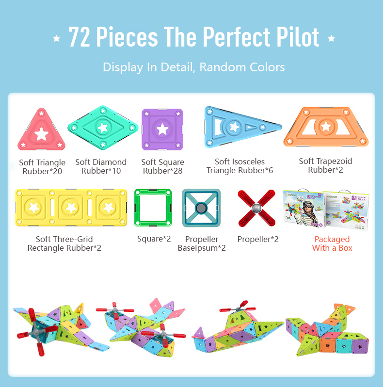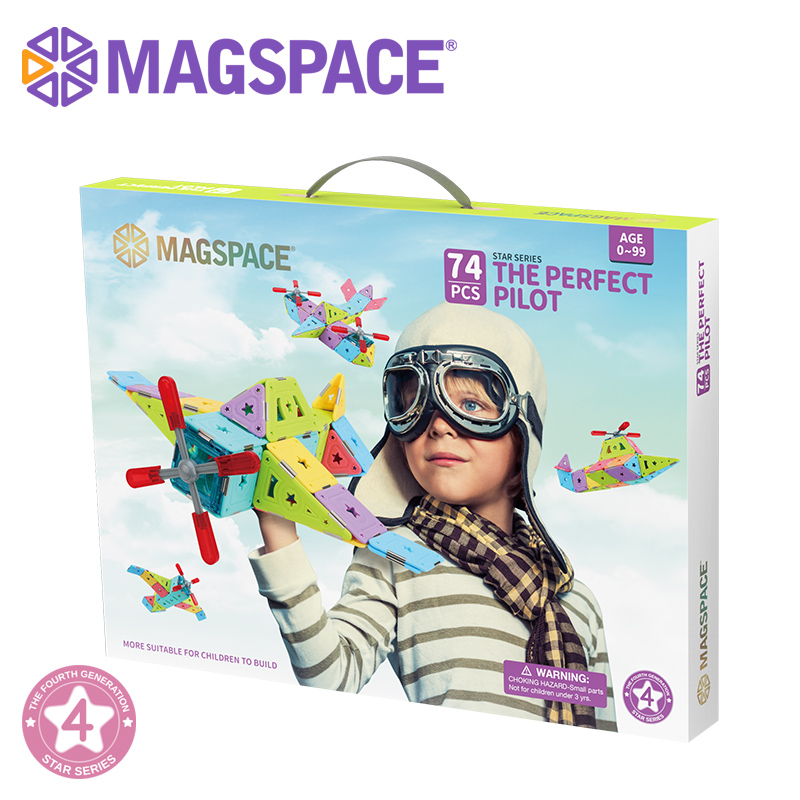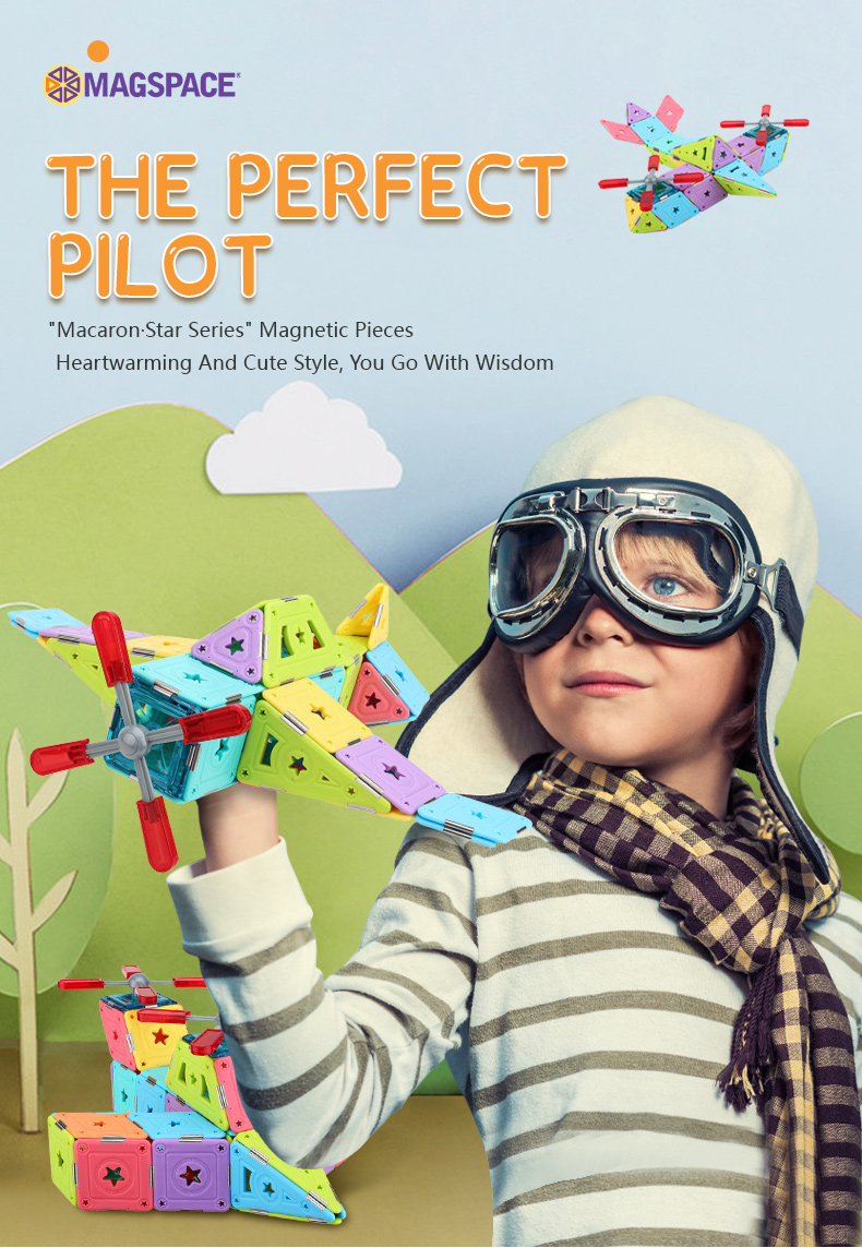 Let your child be a little pilot in his own world! These pure magnetic pieces can help children's dreams come true. The dreamy hollow-star decoration makes the model more exquisite. The finished product is colorful and will be the most dazzling airplane in the blue sky. We will provide some template guide books for children to help them put the pieces together. What's more, this MAGSPACE piece has been patented and won many awards. It is a very good choice for cultivating children's color cognition, creativity, and practical ability!