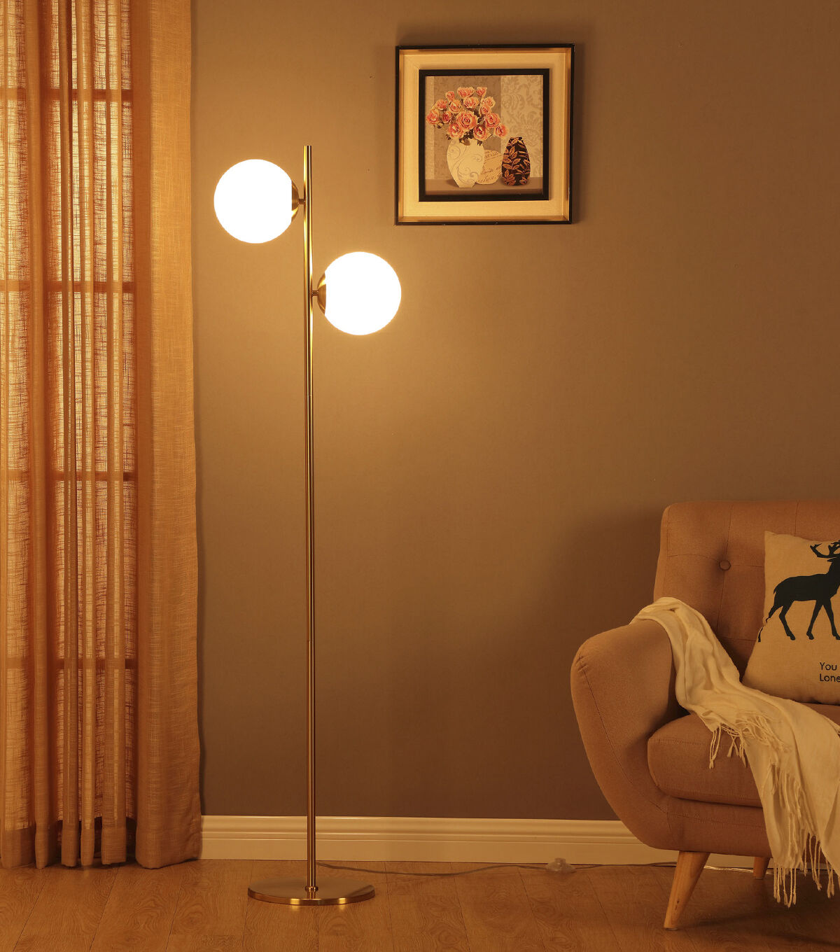 With breathtaking looks, Brightech's Sphere Floor Lamp was made to turn heads. The convenient pedal switch allows you to tap the lamp on or off with your foot. With its beautiful brass finish, frosted white glass globes, and two included LED bulbs, the Sphere will always keep you illuminated in style.