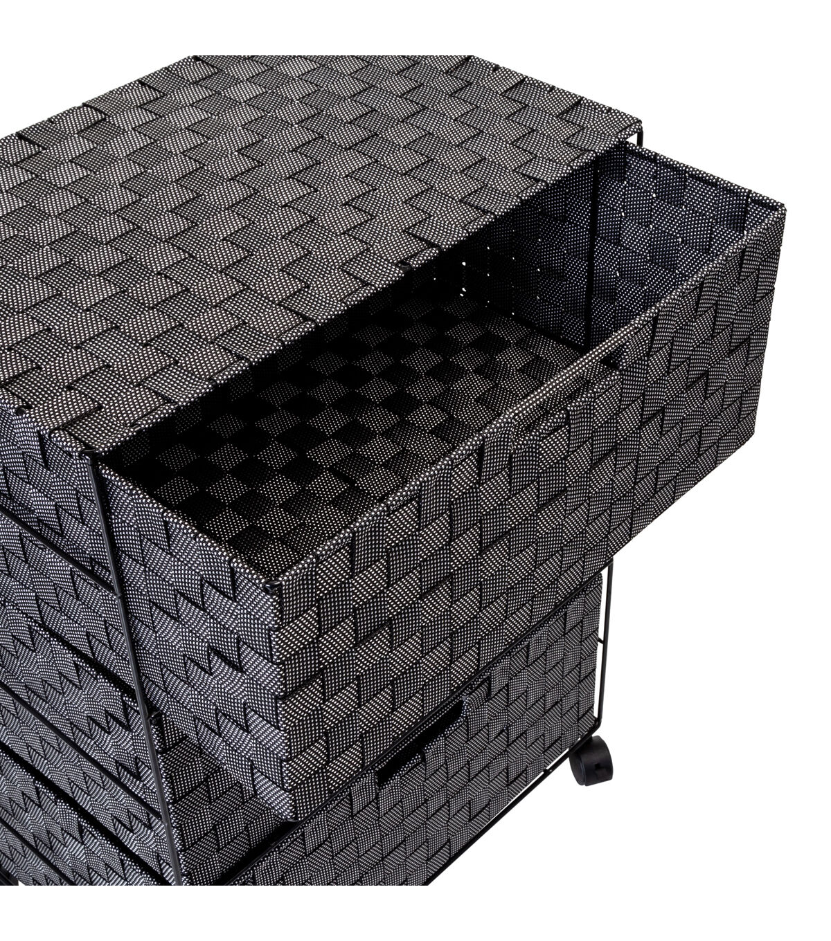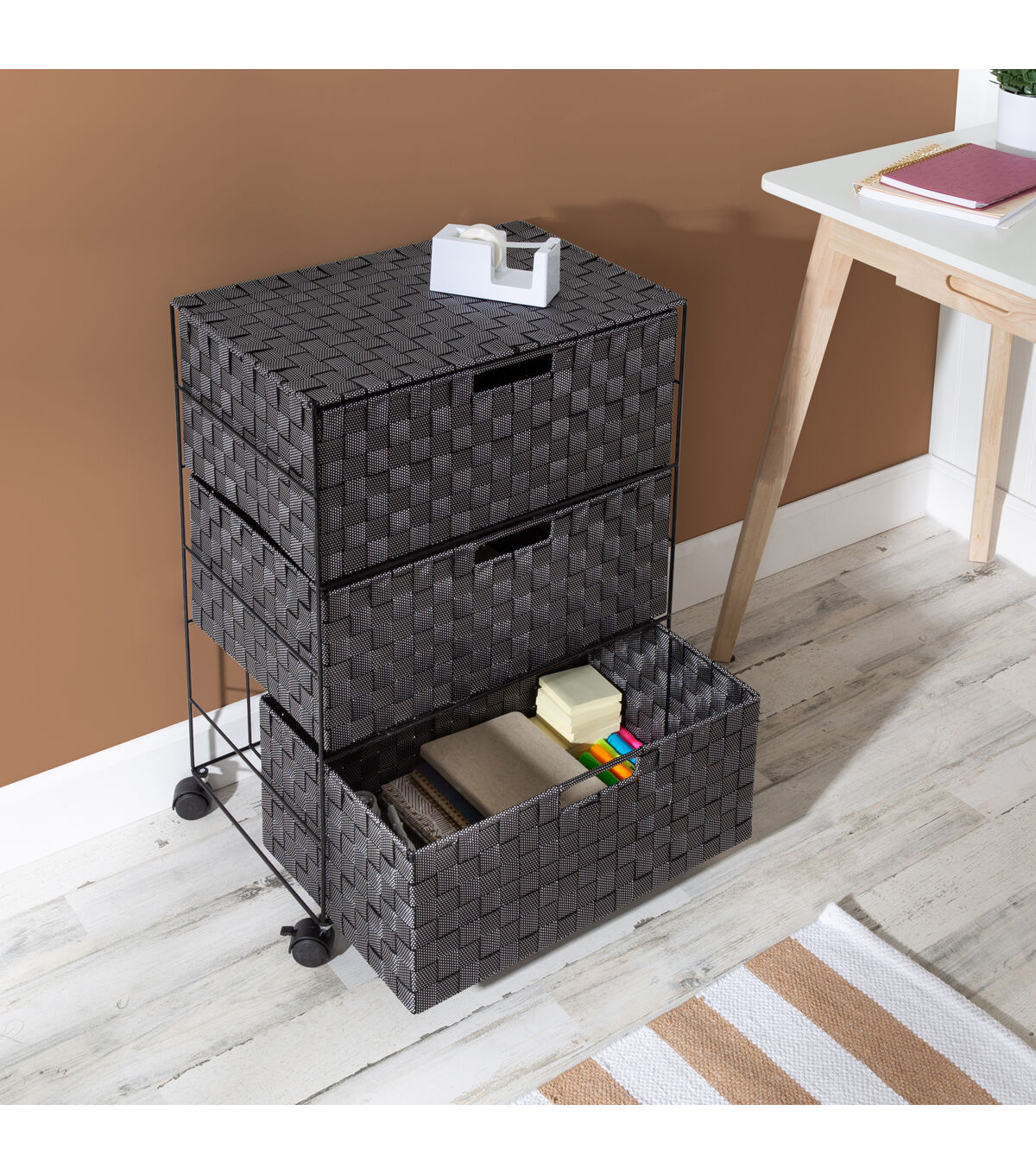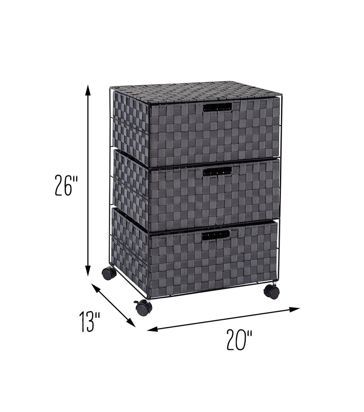 Getting organized has never looked better with this impressive double woven storage unit. This storage unit has three spacious drawers with handles to hold all your home office accessories, or roll it around the bathroom or your closet for any room-specific needs. Smooth rolling casters make moving the chest a breeze, and a soft top surface provides even more storage space.