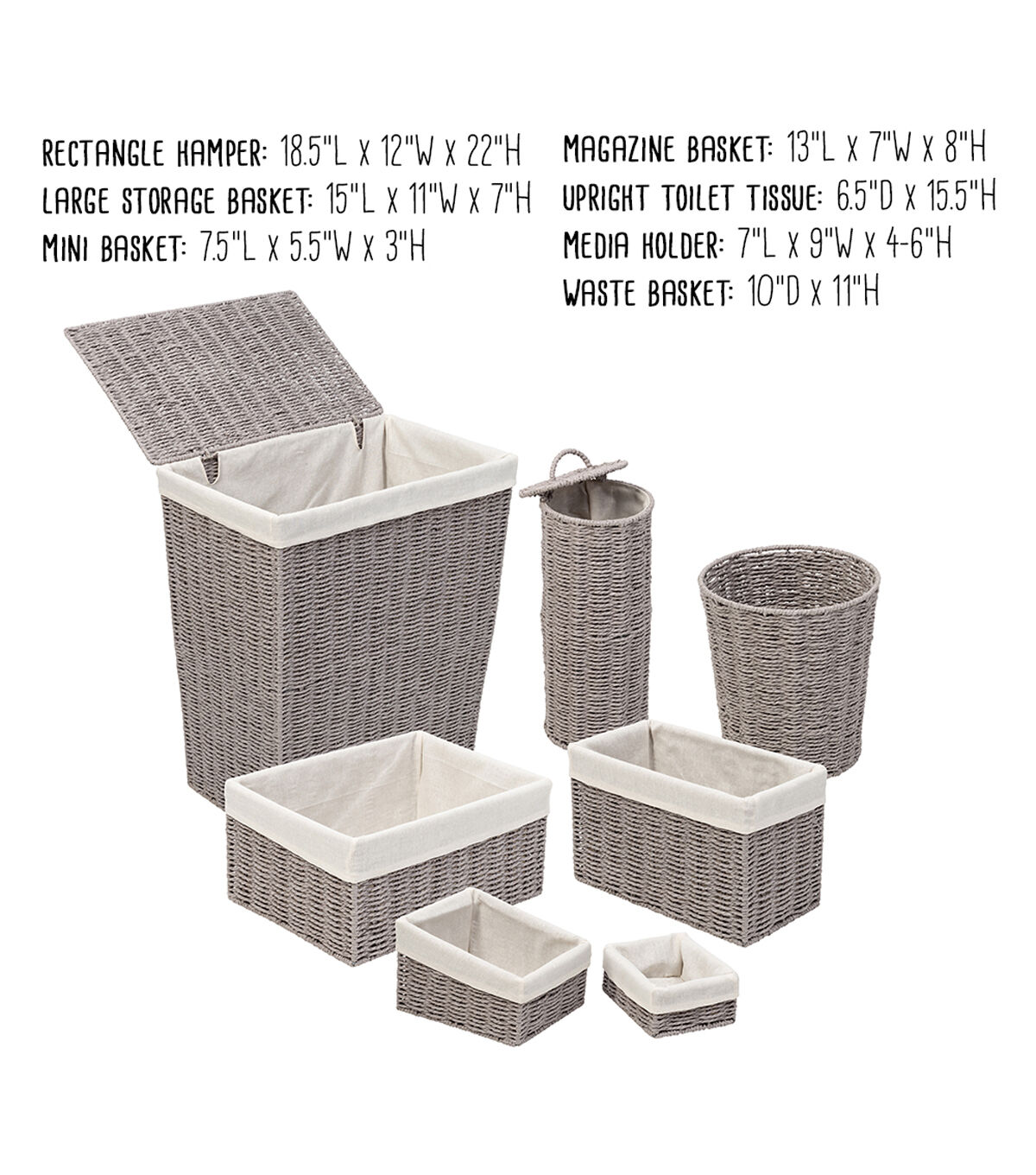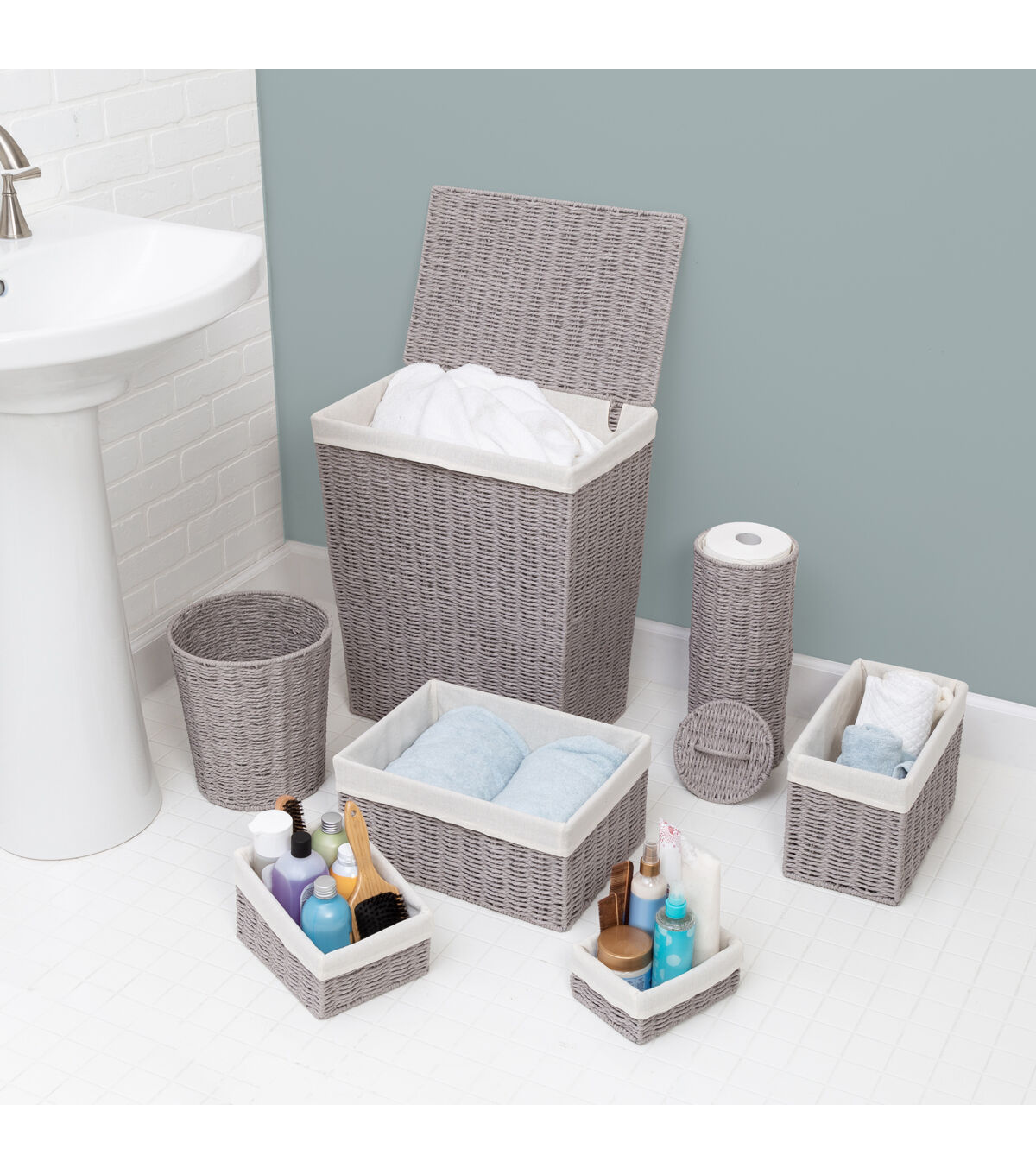 Baskets are a bathroom’s best friend. And when there are seven in a set of woven paper rope baskets? Consider it a storage squad, ready to organize and coordinate a bathroom in need of both. A clothes hamper keeps floors free of dirty laundry, while a toilet tissue holder keeps essentials close at hand. There is a large and mini catch-all storage baskets, perfect for holding bottles of lotion, skincare supplies, or hair styling accessories. The natural texture and neutral gray finish of the paper rope lend a subtle cohesion to a space while tidying it up in the process.