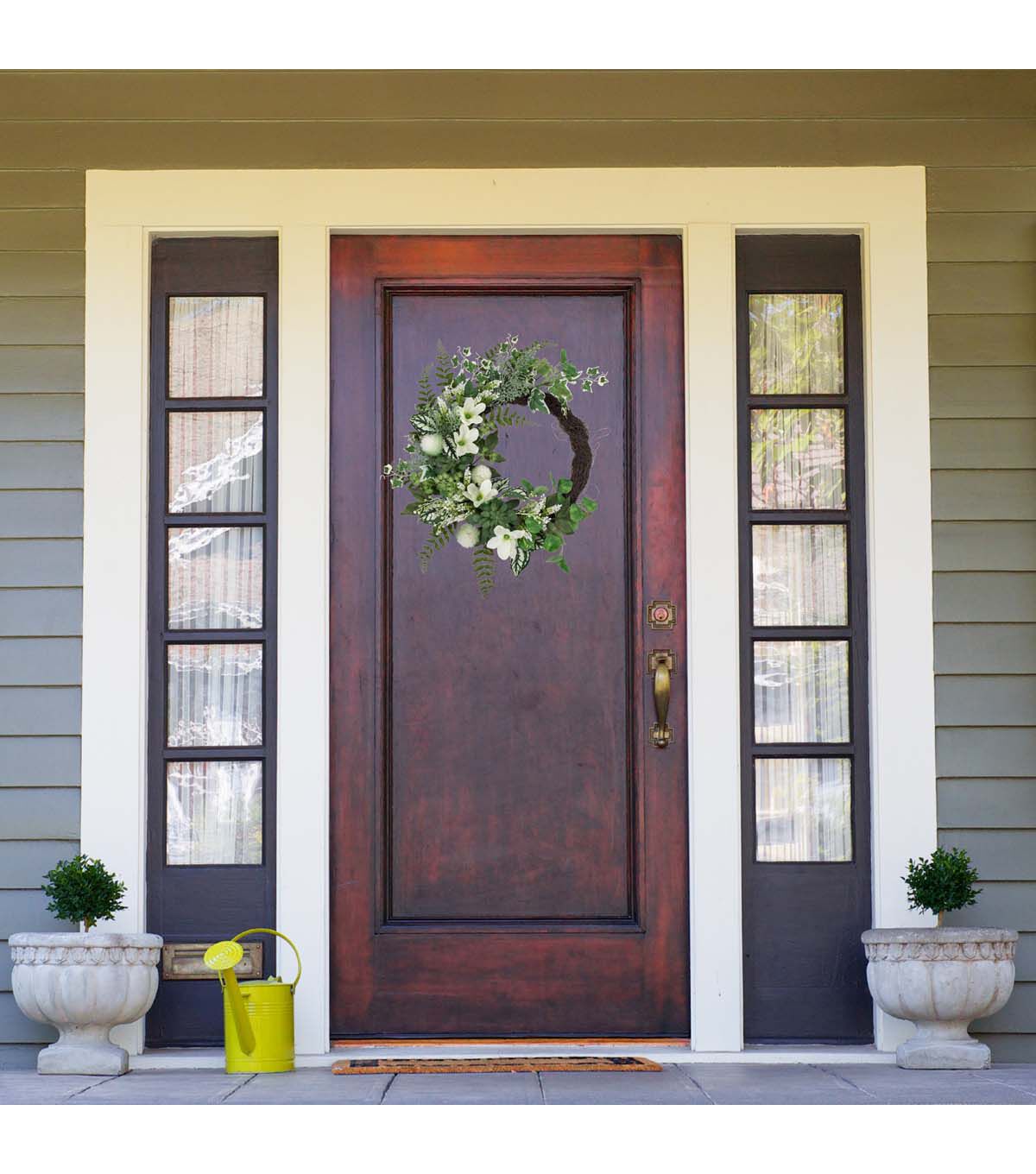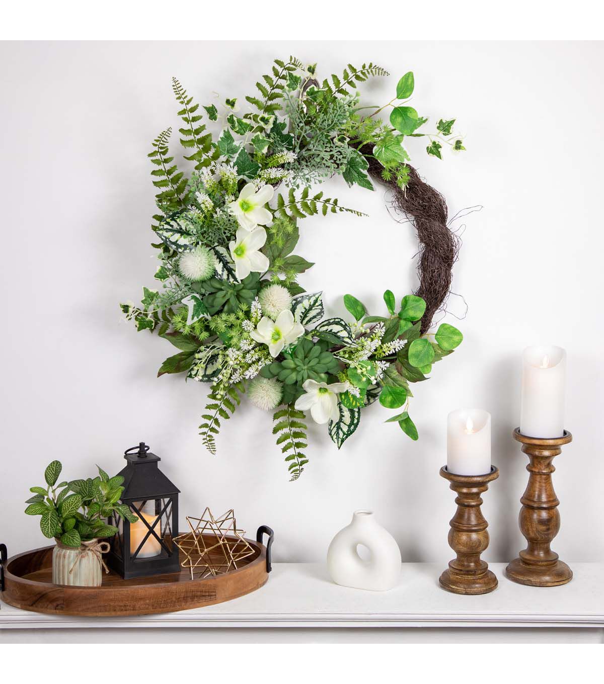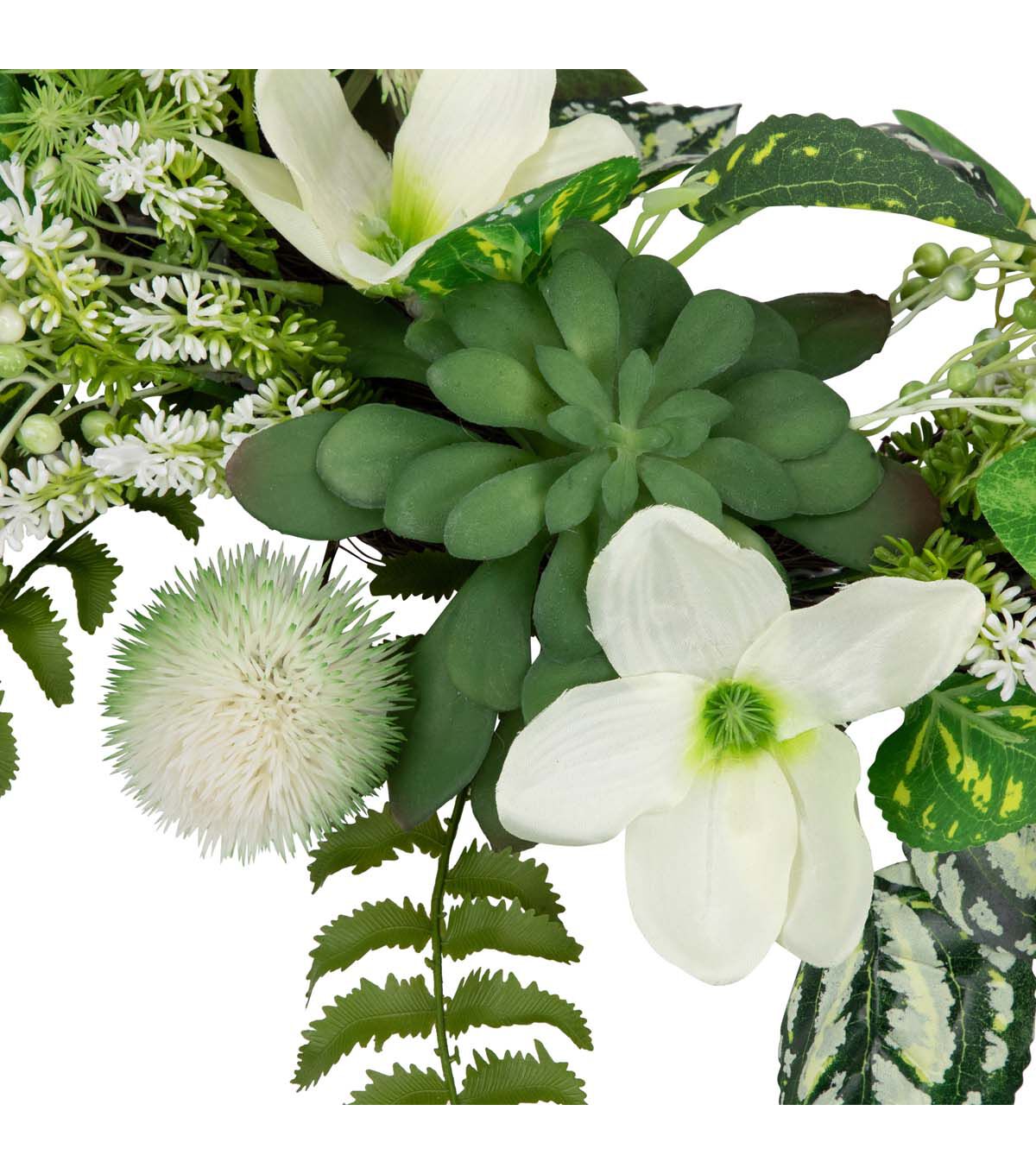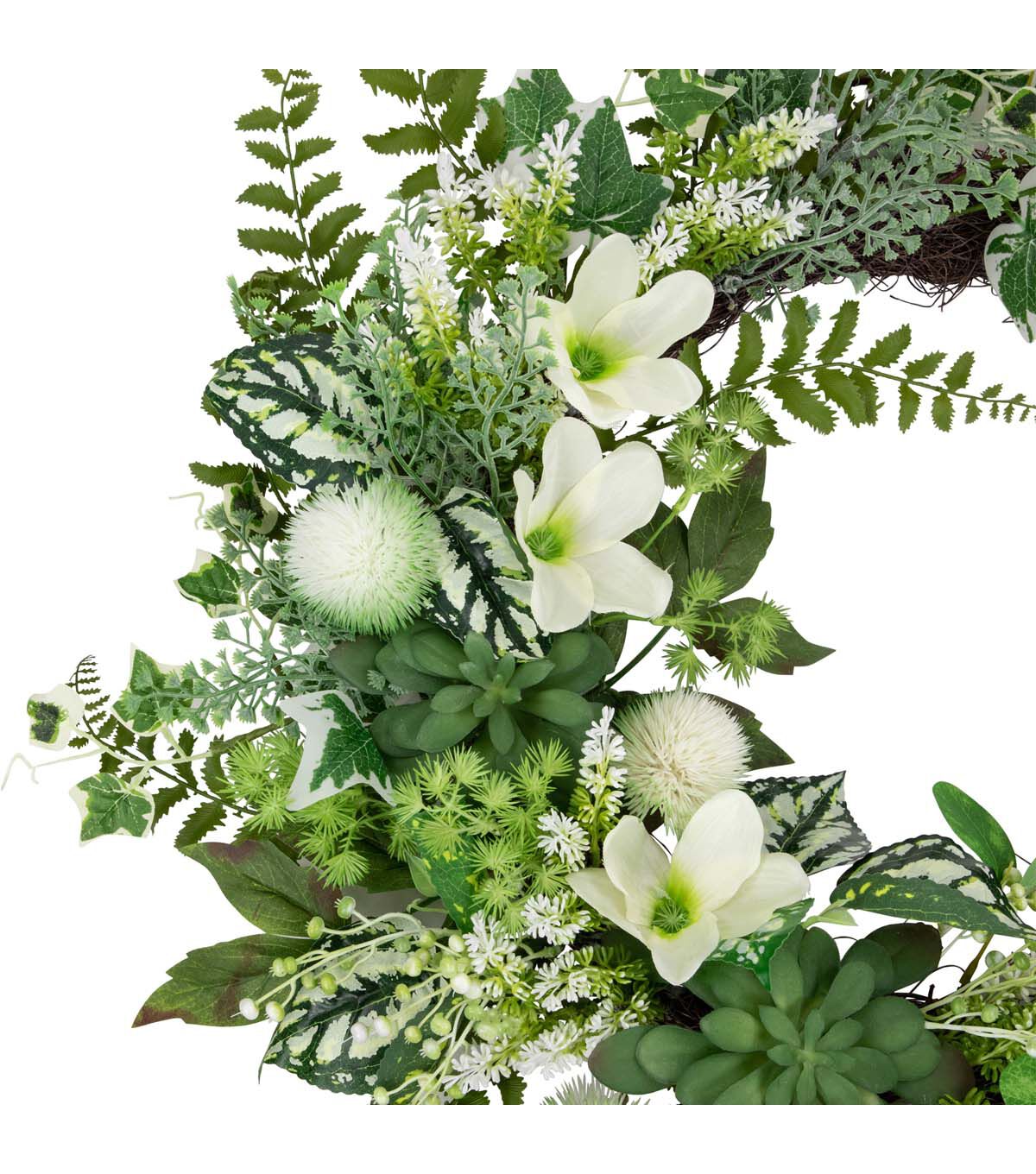 Add a touch of timeless beauty to your front door with this artificial wreath. Constructed of hellebores also known as a Christmas rose astilbe and succulents. A mixture of fern variegated ivy leaves and white berries adds just the right amount of depth and dimension. The foliage rests upon a sturdy grapevine base that comes with a ring for easy hanging. The mix of whites and greens are the perfect spring decor piece.