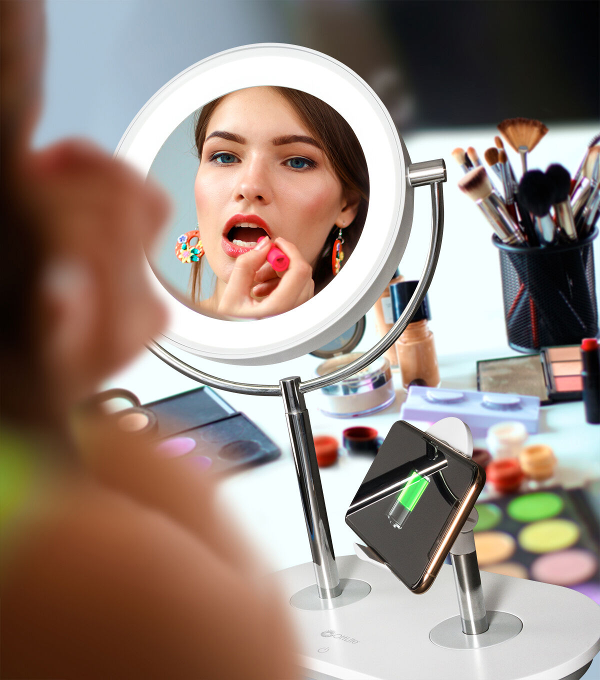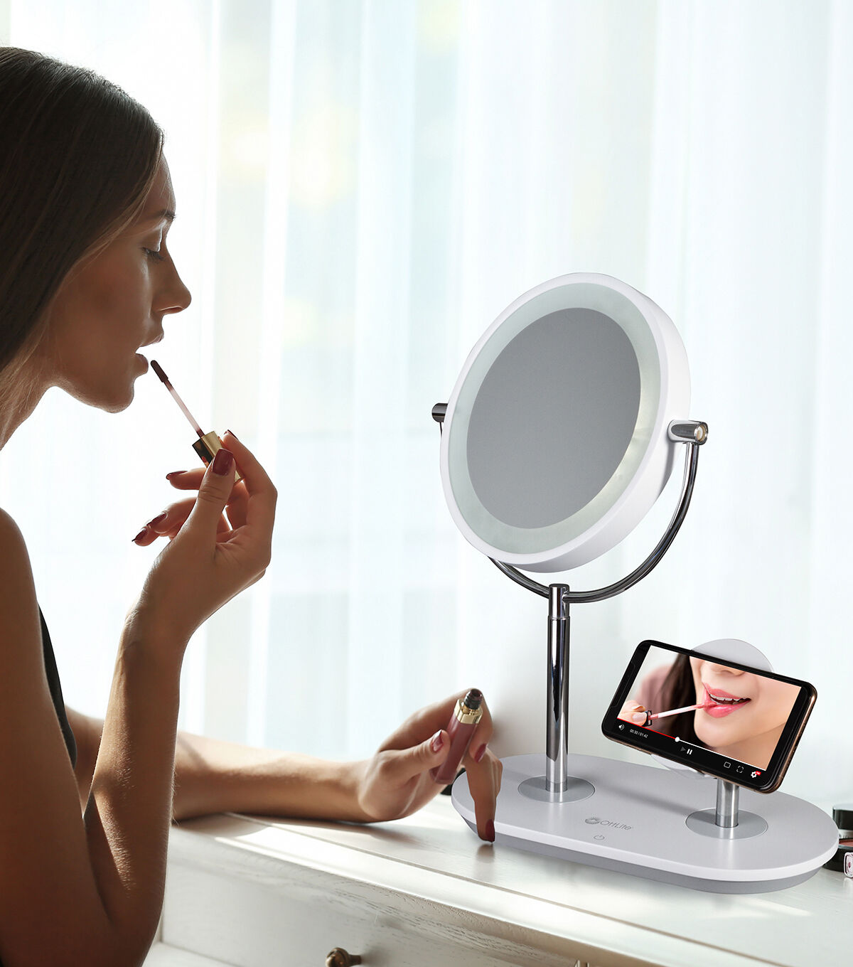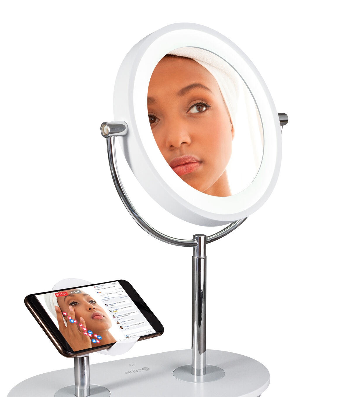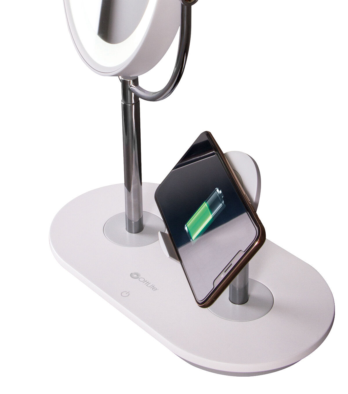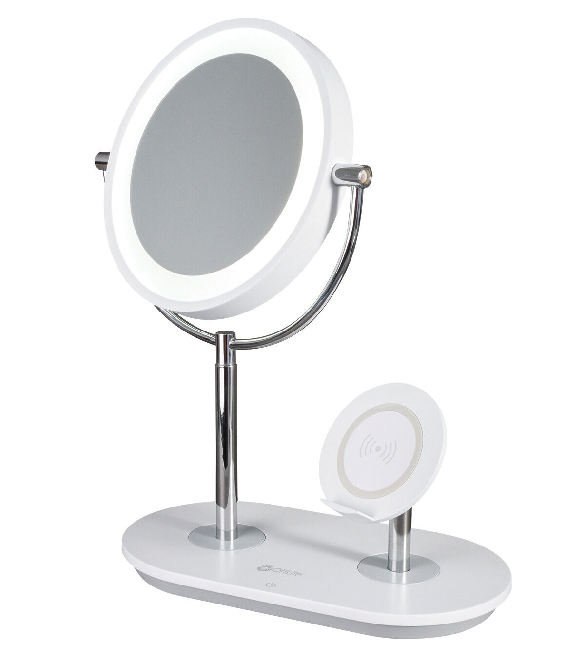 Watch tutorials, charge your phone, chat with friends – all while enjoying the crisp natural daylight illumination of OttLite’s ClearSun® LED technology. The innovative OttLite Wireless Charging LED Makeup Mirror features an adjustable stand with integrated wireless charging. Simply place your Qi-compatible phone on the stand or charge phones and tablets with the 5V, 2.1A USB port. Plus, you can chat with friends while getting ready or watch your favorite beauty influencers teach you the latest techniques and trends while you try them out in the mirror. Select from three brightness settings and easily adjust and rotate both mirror and stand up to the angle you need. With the incredibly accurate ClearSun LED illumination, you’ll know you’re seeing skin tones and make up true to life. For tweezing and precise techniques, just rotate the mirror to reveal 5x magnification.