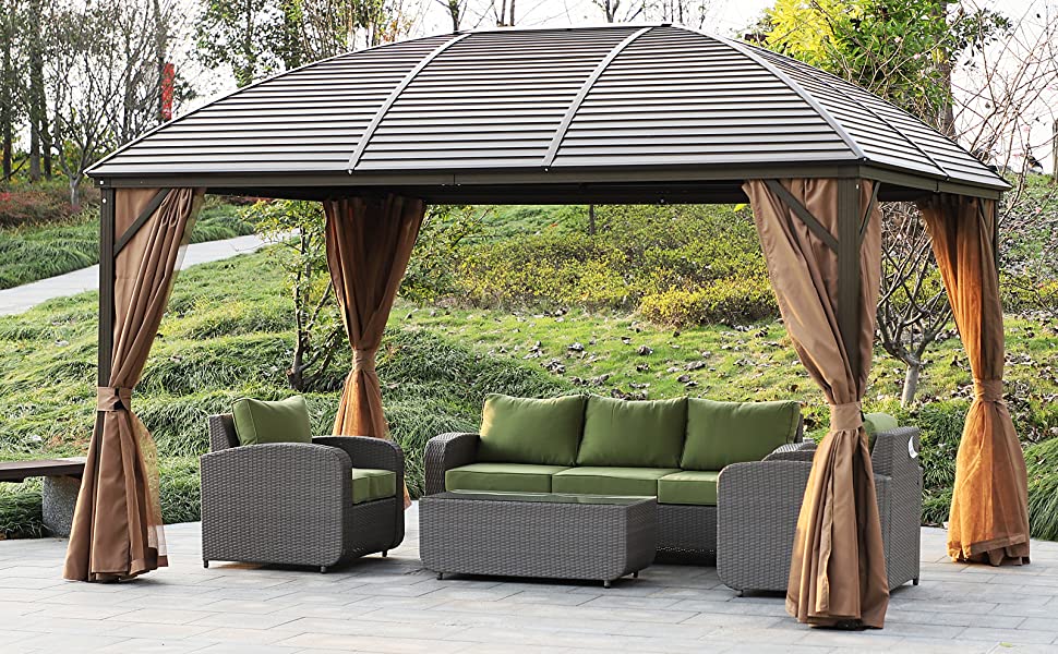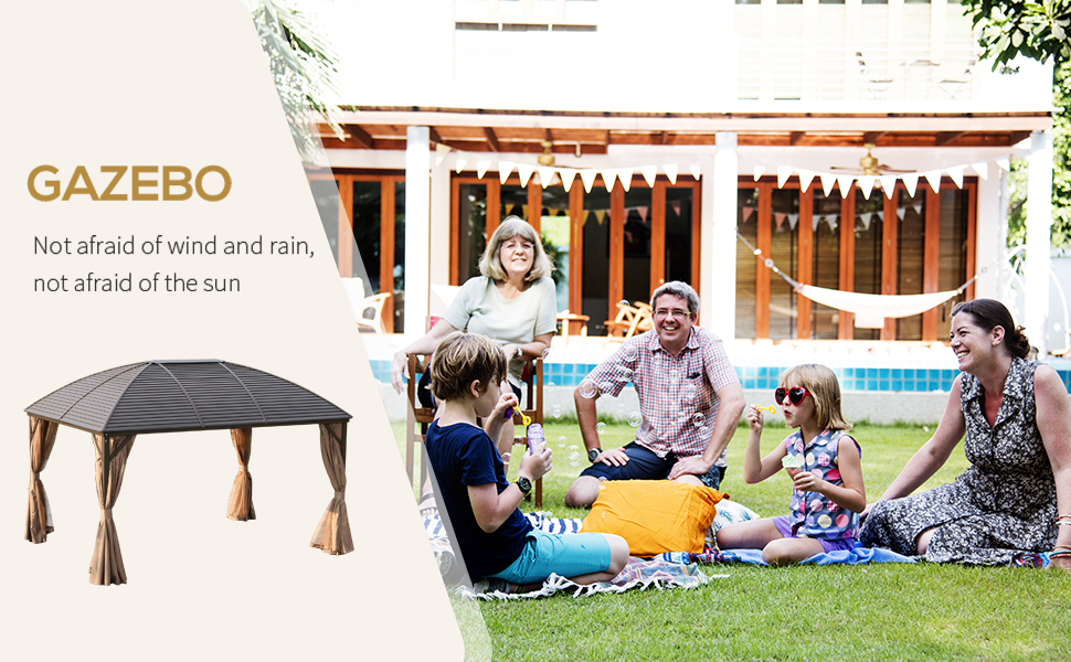 AN OUTDOOR CANOPY GAZEBO THAT'S GOT YOU COVERED: Our hardtop gazebo's galvanized steel roof provides you and your patio furniture with needed shelter from rain and UV radiation. Its rust-resistant aluminum frame makes it lightweight enough for easy teardown.