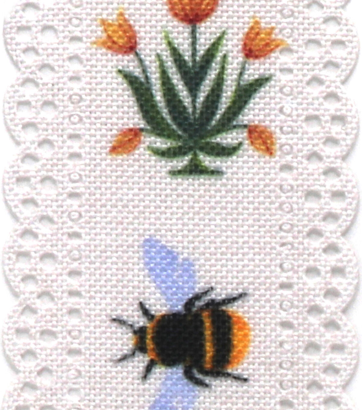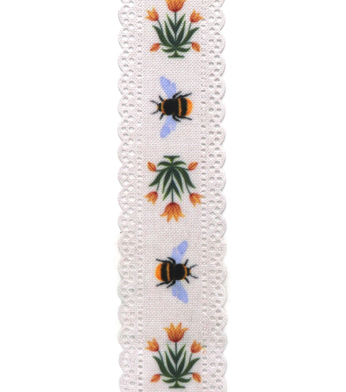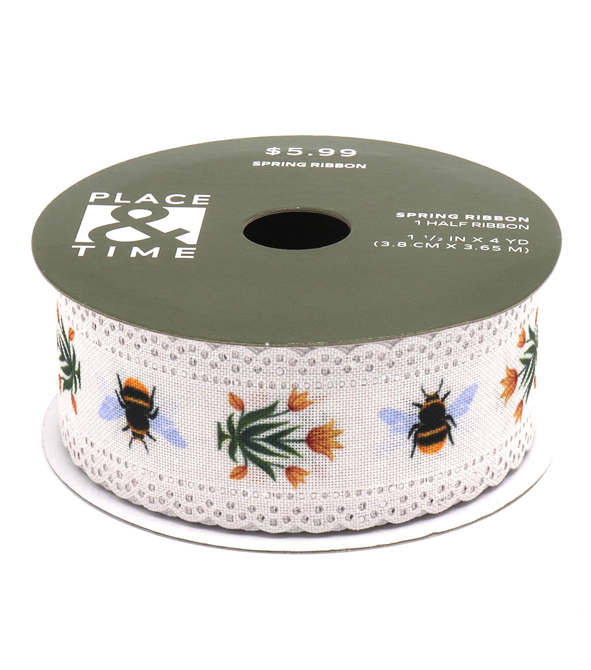 Take your seasonal centerpiece to the next level by decorating it with the Spring Scalloped Edge Floral & Bees Ribbon by Place & Time. This linen ribbon in white displays a print of flowers and bees. It is designed with a scalloped edge for visual appeal. You can also wrap this spring ribbon around candles, flower vases, wall hangings and more.