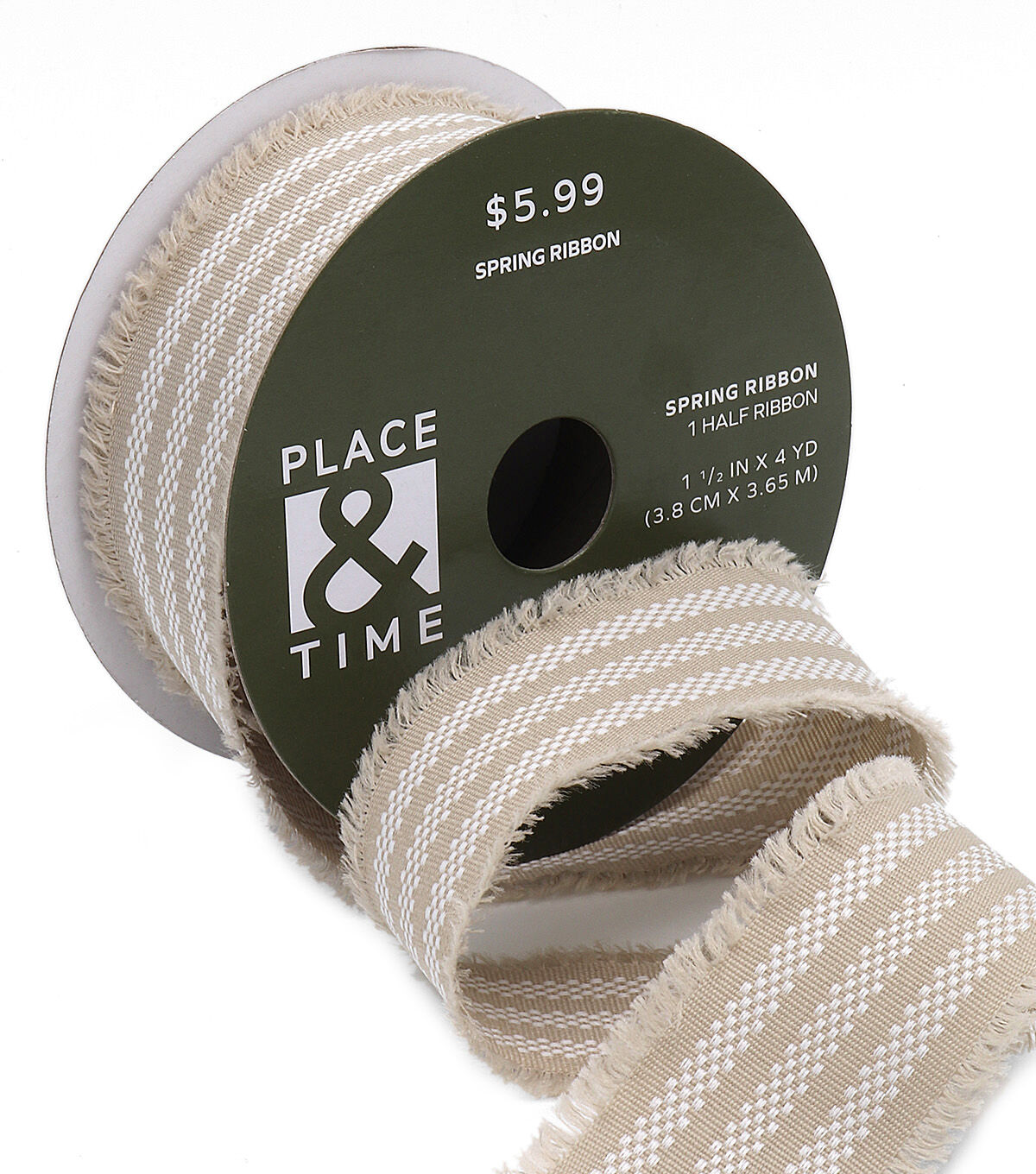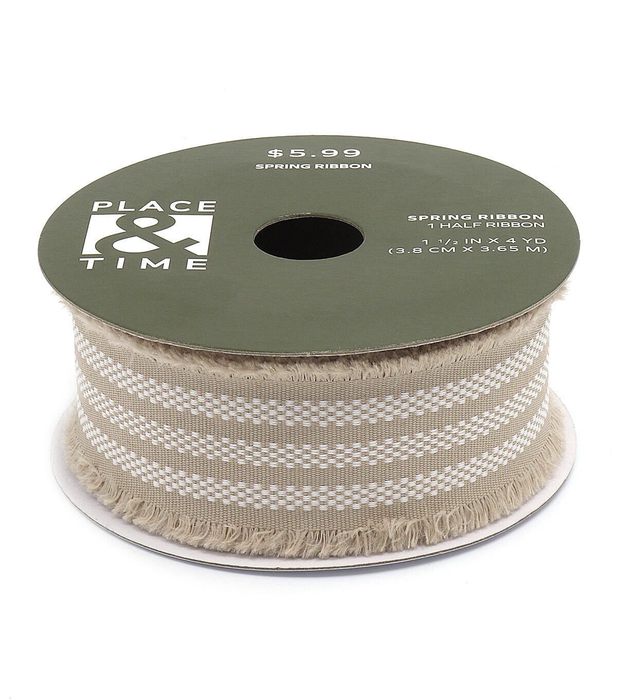 Add a lovely finishing touch to your spring home decor accents with the Spring Tan Striped Fringe Ribbon by Place & Time. It displays a striped pattern in white and tan shades. Use this fringe ribbon to trim wreaths, vases, wicker baskets and more. You can also team it with linen ribbons in colorful hues to create a stunning ribbon chandelier for the front porch.