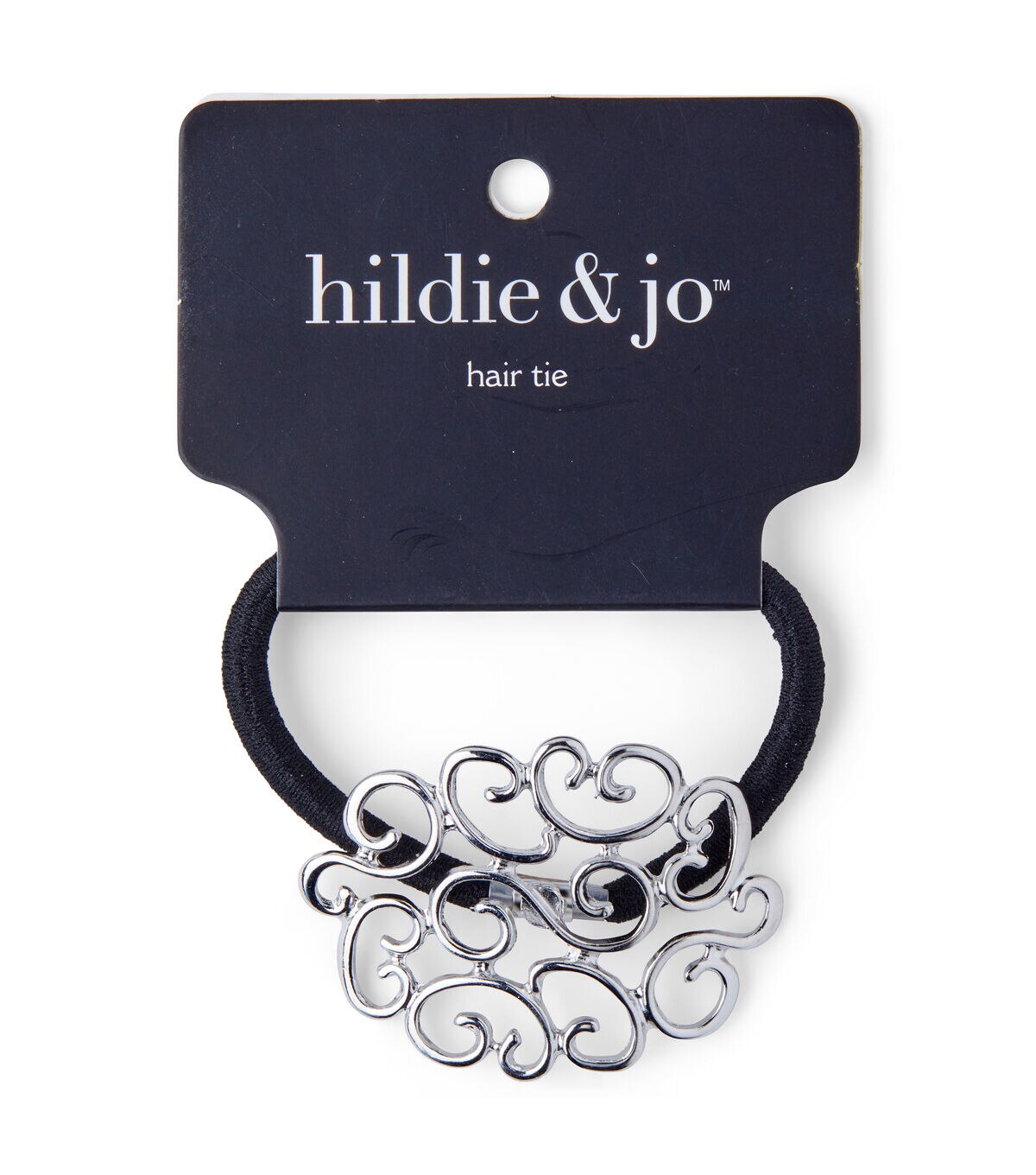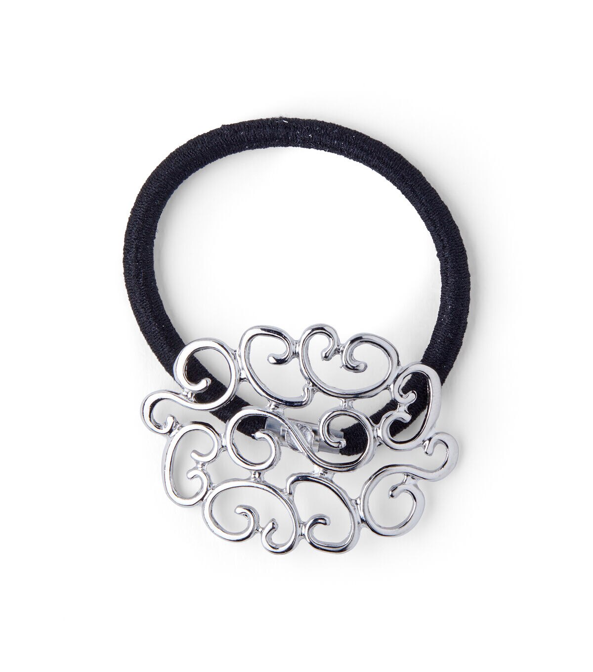 Infuse a charming effect into your low-side ponytail with trendy accessories like the hildie & jo Black Ponytail Hair Tie with Silver Open Scroll. This hair accessory features a smooth silver open scroll pattern. Completing the look is its black elastic. Use this lovely hair-tie to give your ponytail a glam touch.