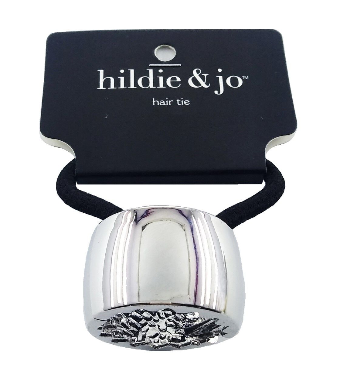 Bring instant glamour to any updo, using the hildie & jo Pony Tail Silver Cuff. Designed with black elastic, this pony tail accessory is easy to wear. It's got a smooth silver curved cuff that's perfect for any look. The pack contains one hair tie made of nylon, iron and zinc alloy.