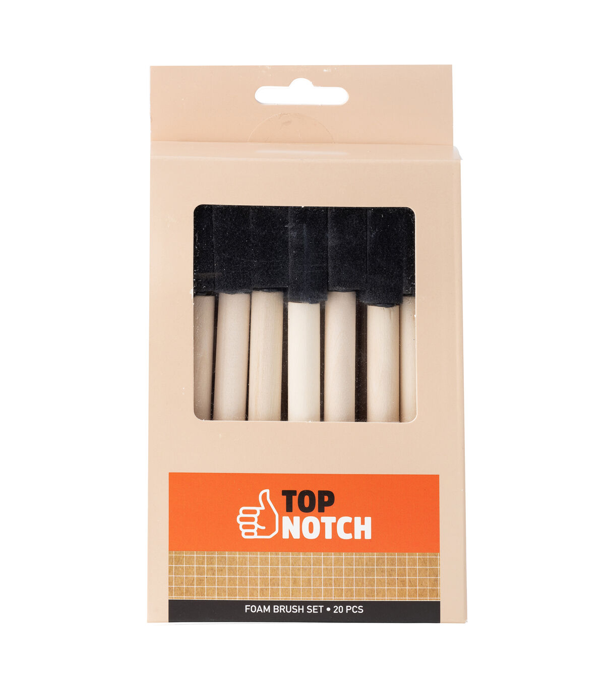 Economical foam brushes are ideal for paint, enamel, latex, stain and tempera application.This set contains twenty 1" foam brushes with wood handles.