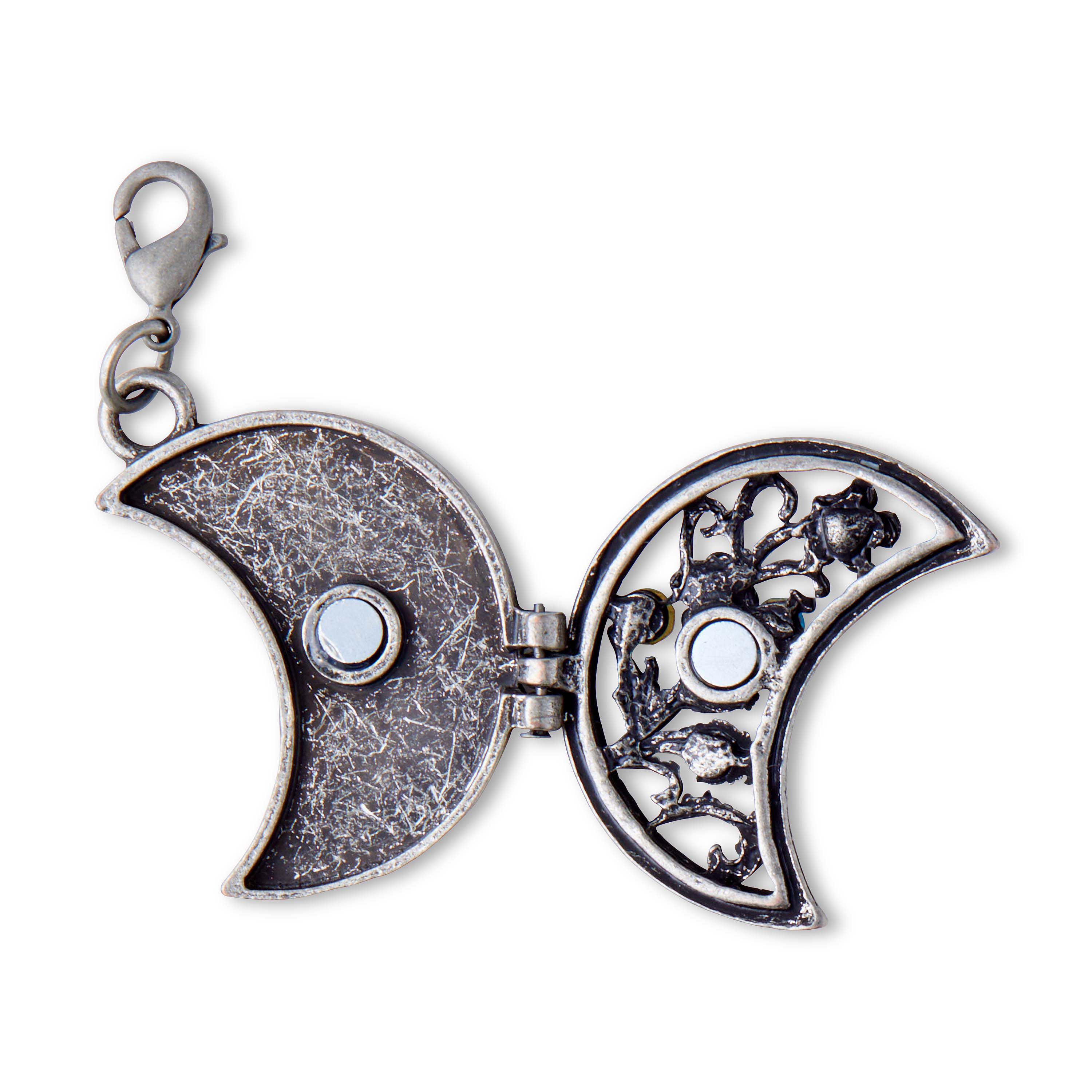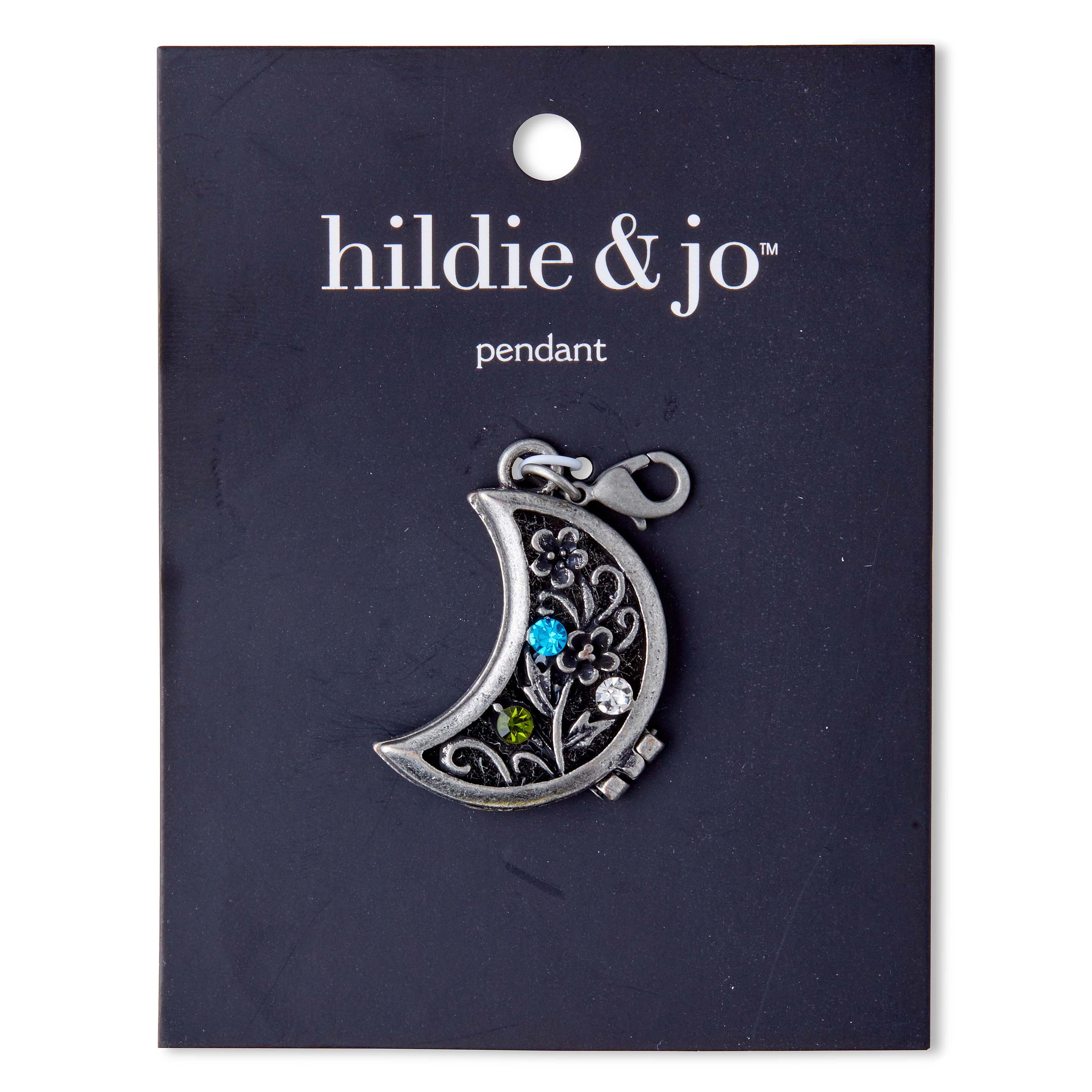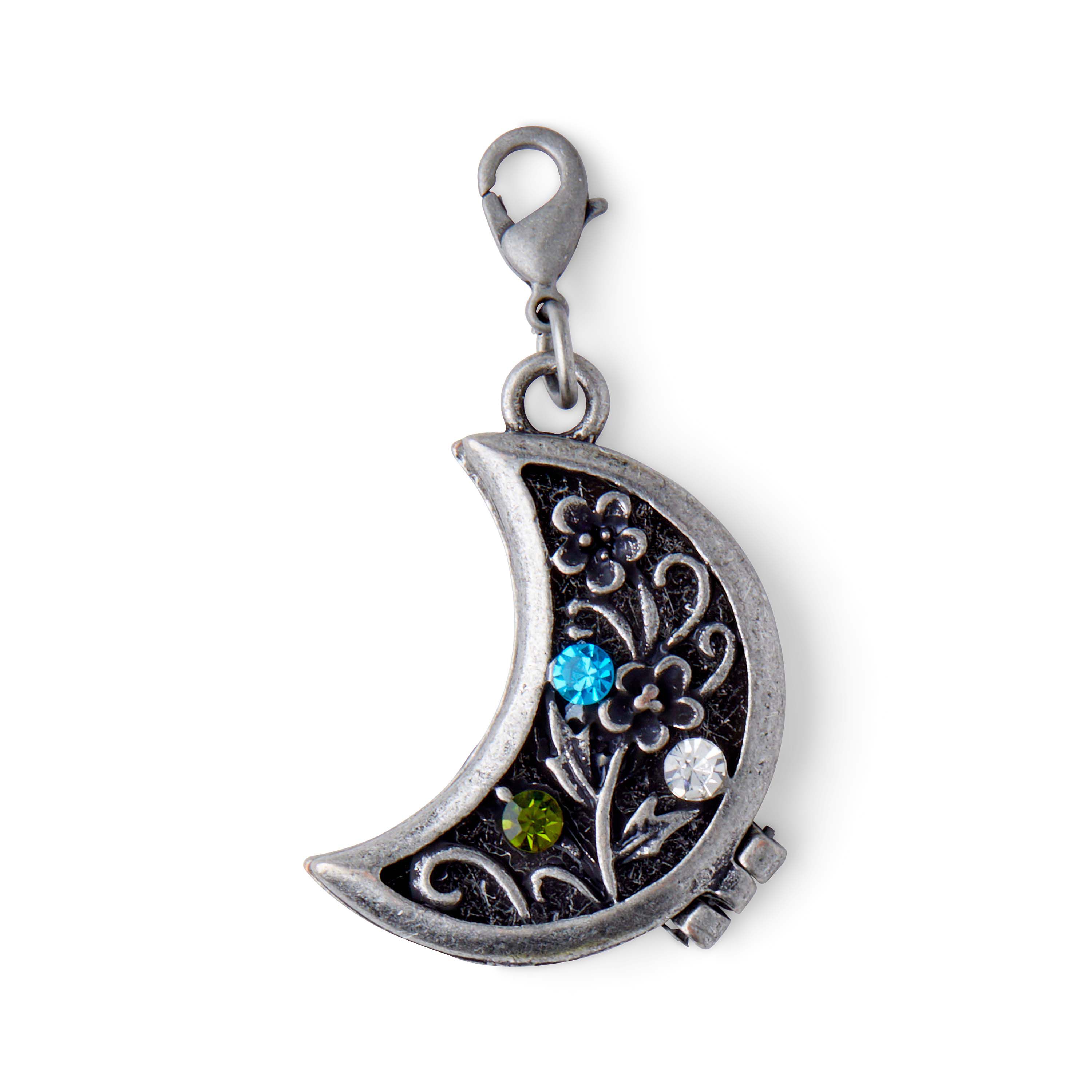 Enliven the charm of your neck piece with this one-of-a-kind hildie & jo Boulevard Moon Locket Antique Silver Pendant. This pendant locket features a crescent moon that’s accented with an antique silver finish for visual charm. On the front of the crescent displays a floral, scroll pattern, while three round crystals are artfully inserted inside the silver pattern. Add this pendant to bracelets, necklaces, key chains and more.