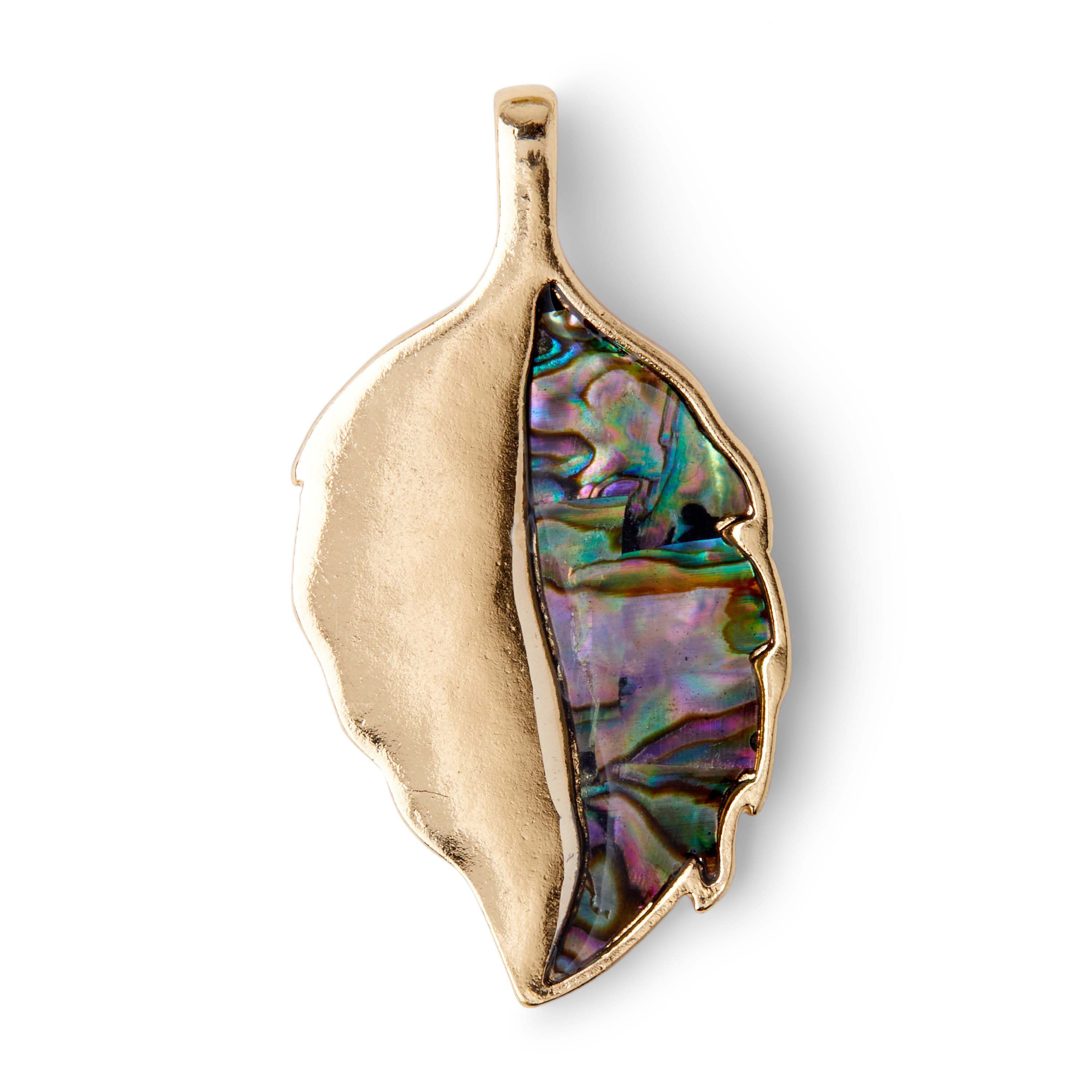 Give your jewelry projects a personalized touch using the hildie & jo Natural Abalone Shell Leaf Pendant - Multi. This attractive metal pendant is shaped like a leaf with one half made of an abalone shell and the other sporting a gold tone. It has a jump ring for easy attachment. Make a lovely necklace using this pendant and wear it to parties or on special occasions.