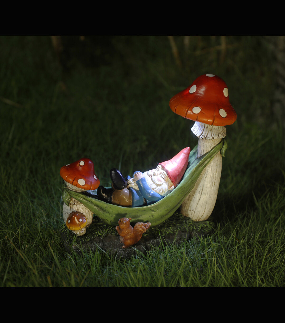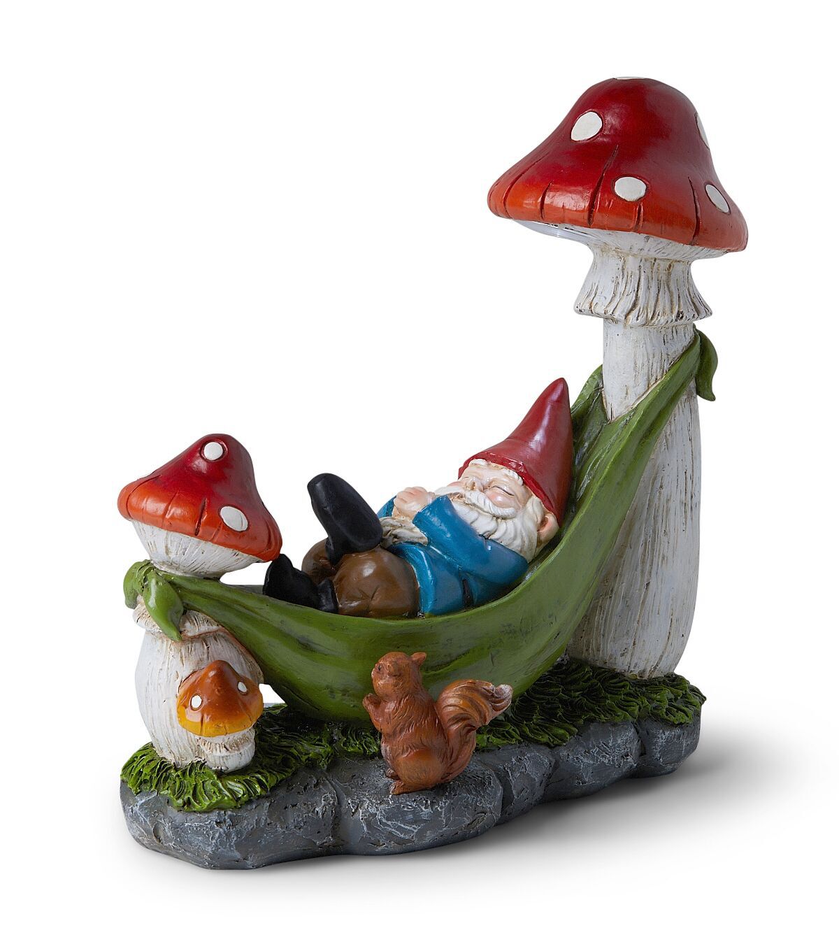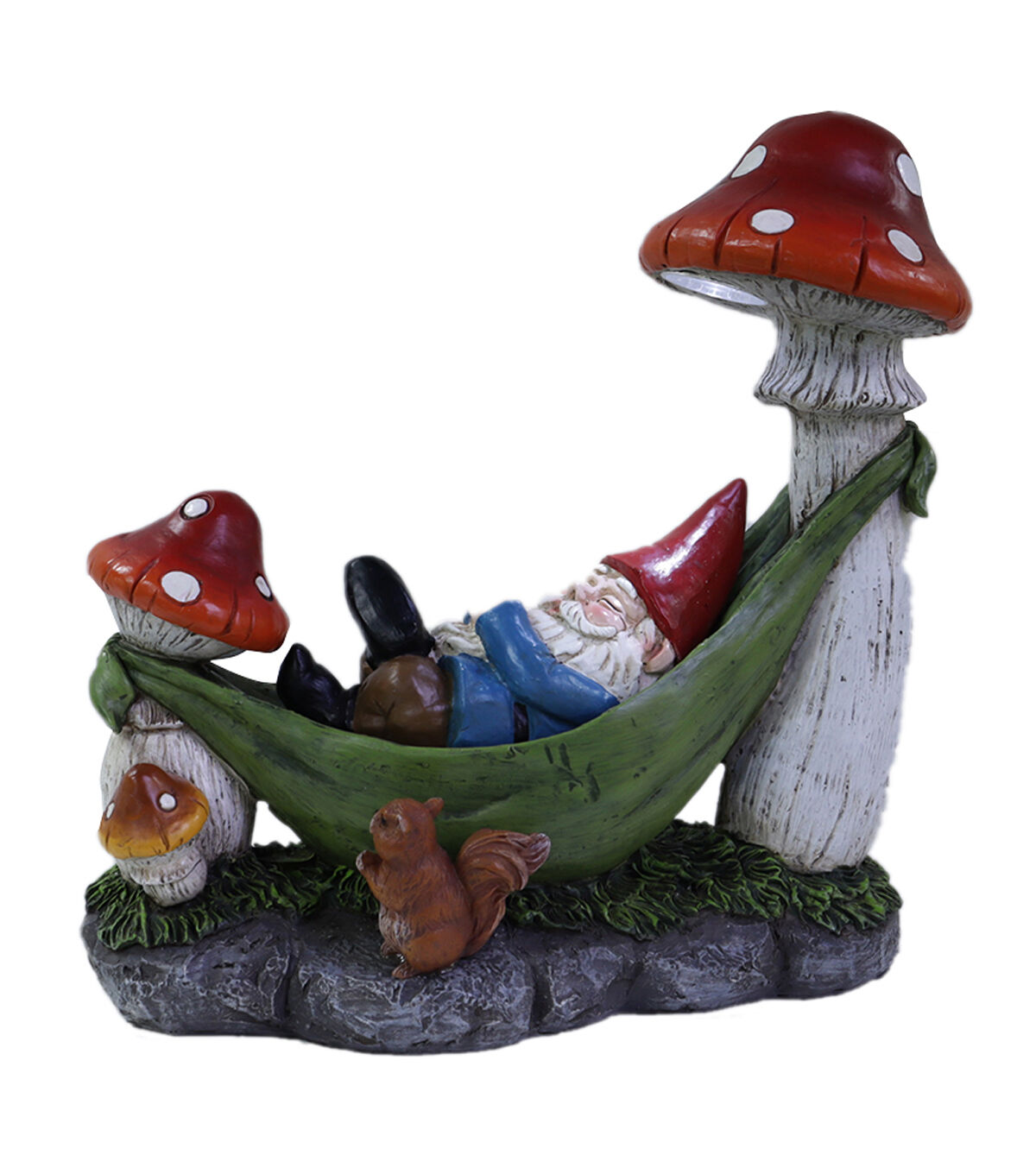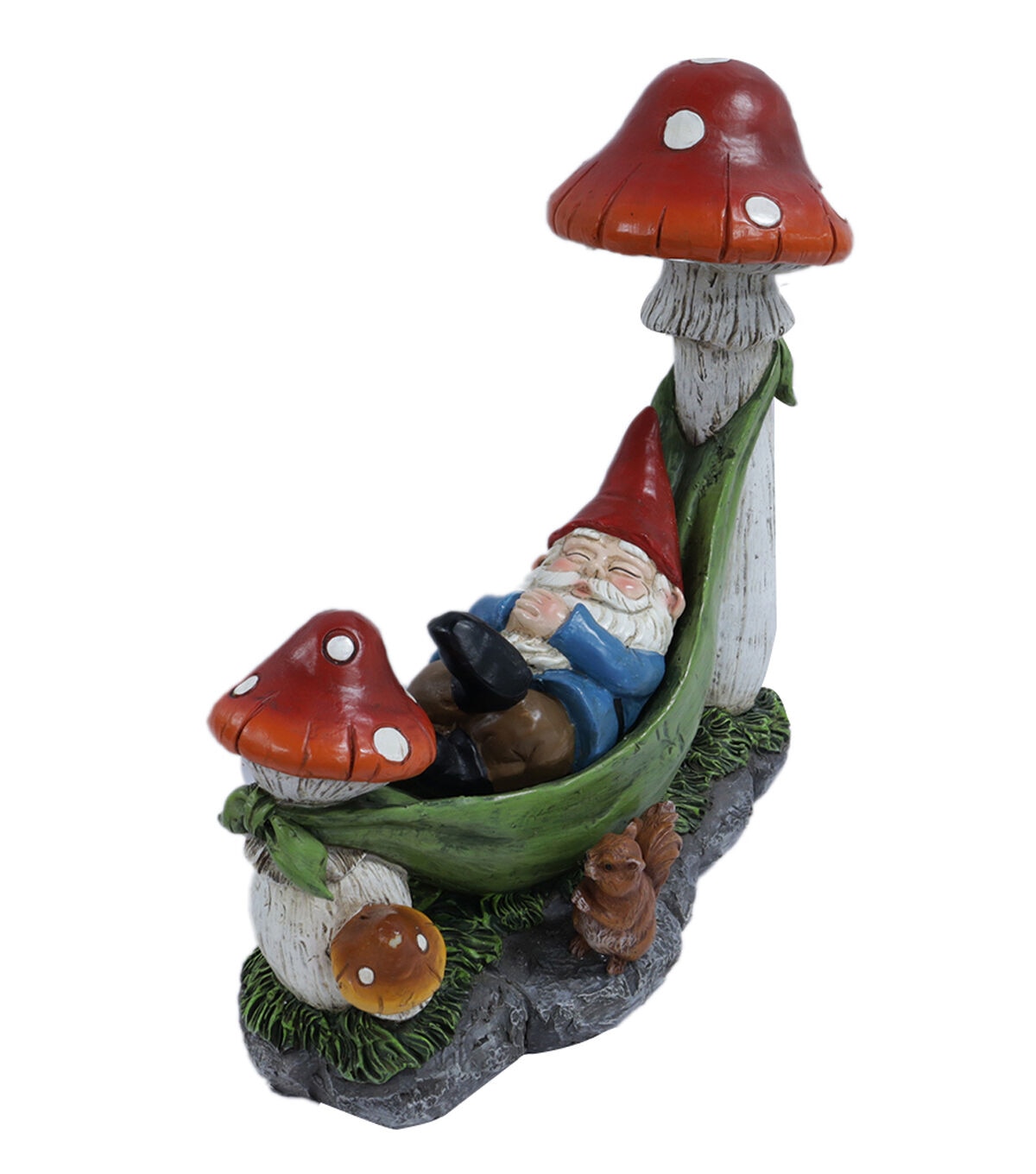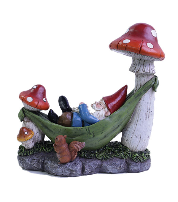 Give your garden an adorable upgrade with the Gnome in Hammock Outdoor Solar Garden Statue by Place & Time. This colorful statue is shaped like a gnome relaxing in a hammock tied to mushrooms. A squirrel accent adds to its charm. You can also display it on the patio, porch or balcony for a delightful sight.
