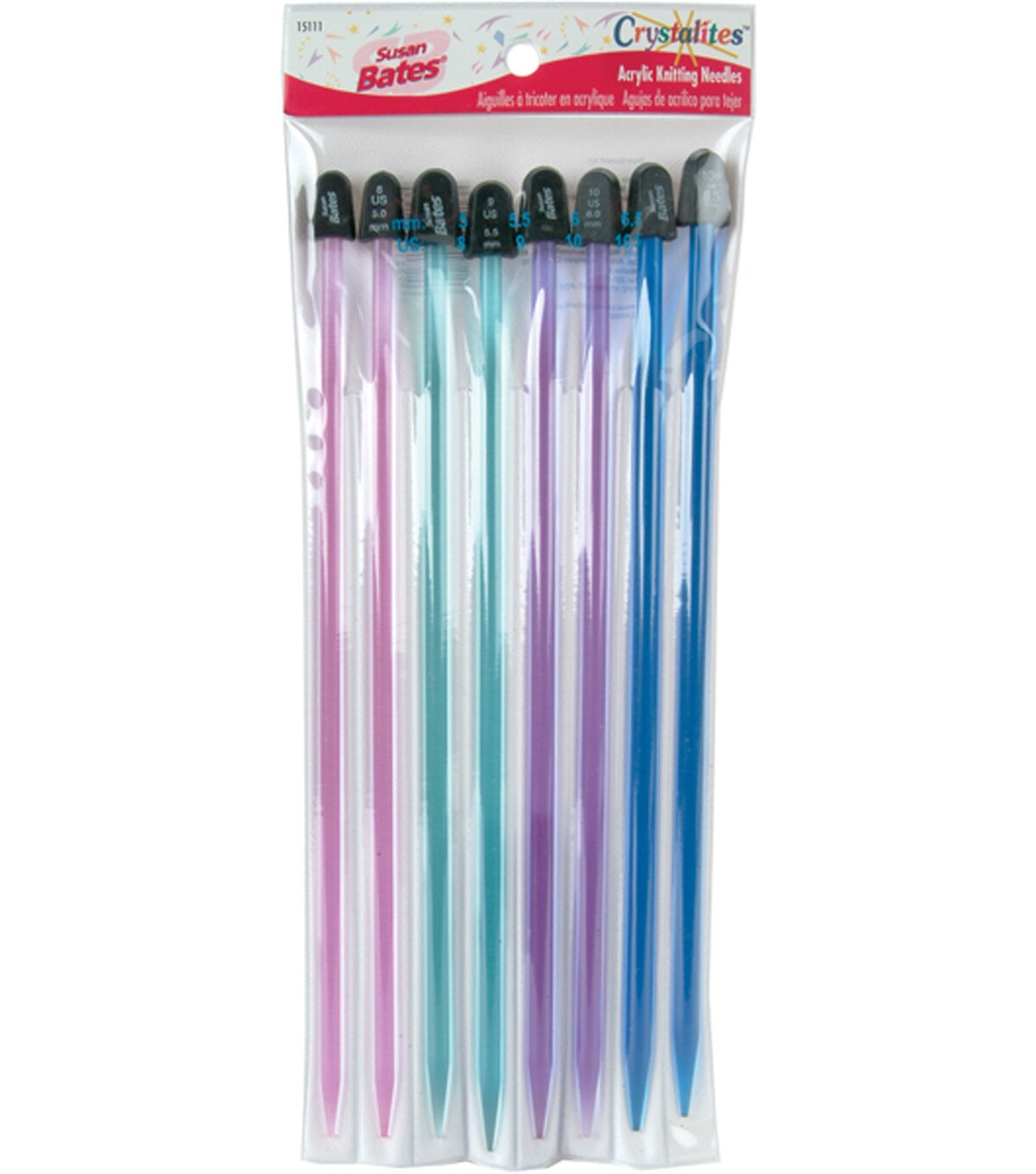 SUSAN BATES-Crystalites Acrylic Knitting Needle Assortment. Susan Bates Crystalites are beautifully colored translucent plastic knitting needles. They are lightweight with a warm hand and a smooth finish for a light-as-air knitting experience. Each size is color coded so you can find the size you need at a glance. The knobs feature a no-roll design and the US and metric sizes are clearly printed on the knob. This gift set contains four pair of 10in needles in sizes 8 (5mm); 9 (5.5mm); 10 (6mm) and 10.5 (6.5mm). Imported.