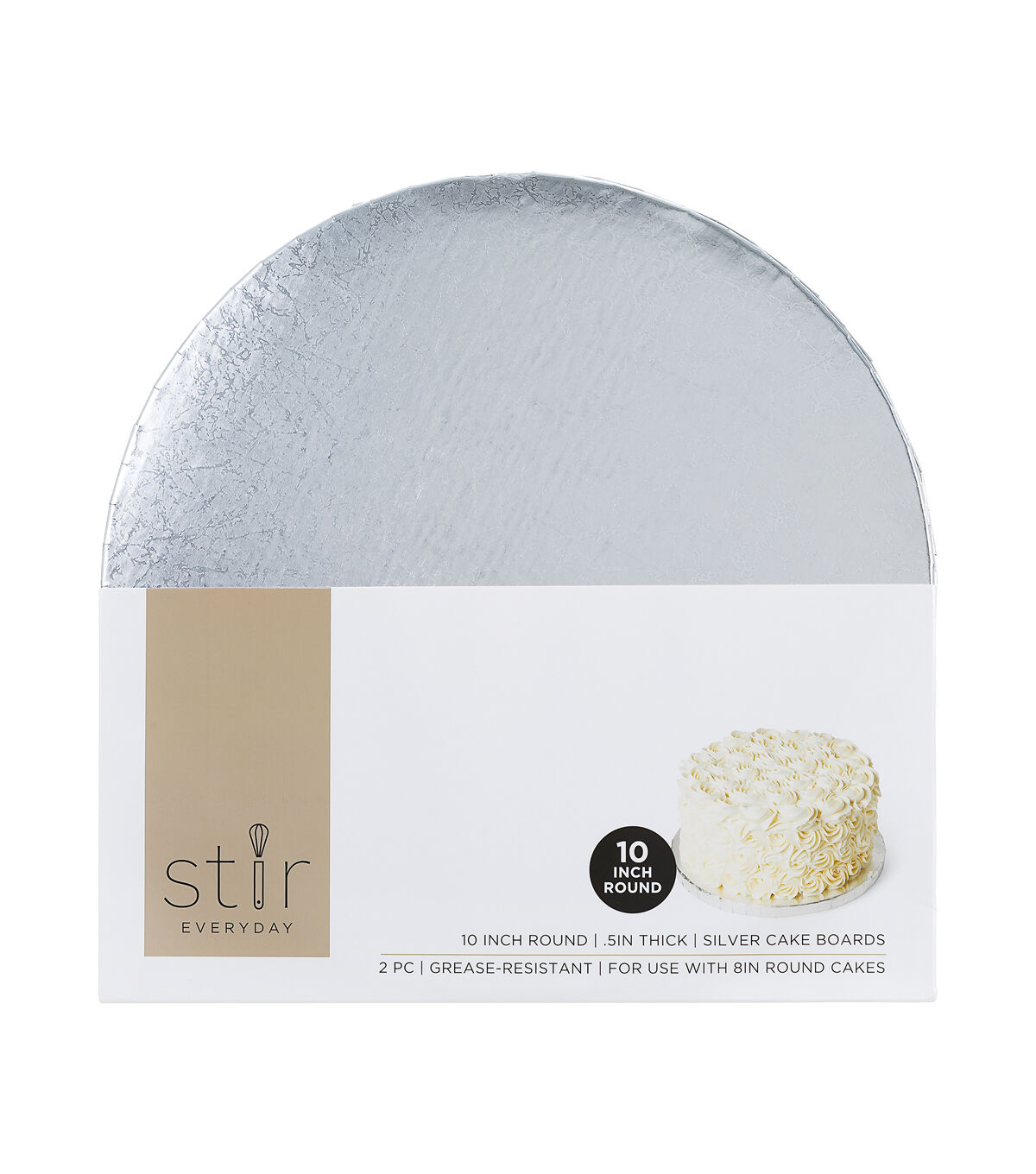 Display your handmade cake in style using the STIR Everyday Round Cake Boards - Silver. Sporting a silver tone, these grease-resistant cake bases will make your creation stand out. They are perfect for a 8-inch, round cake. You can also use them for all types of fondant cakes, stacked tiers, gingerbread houses and more.