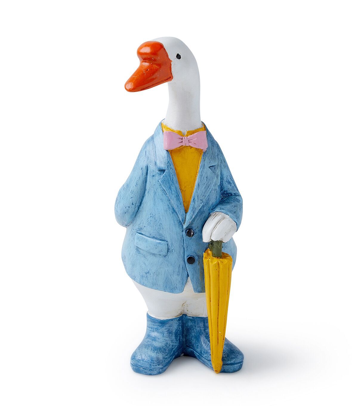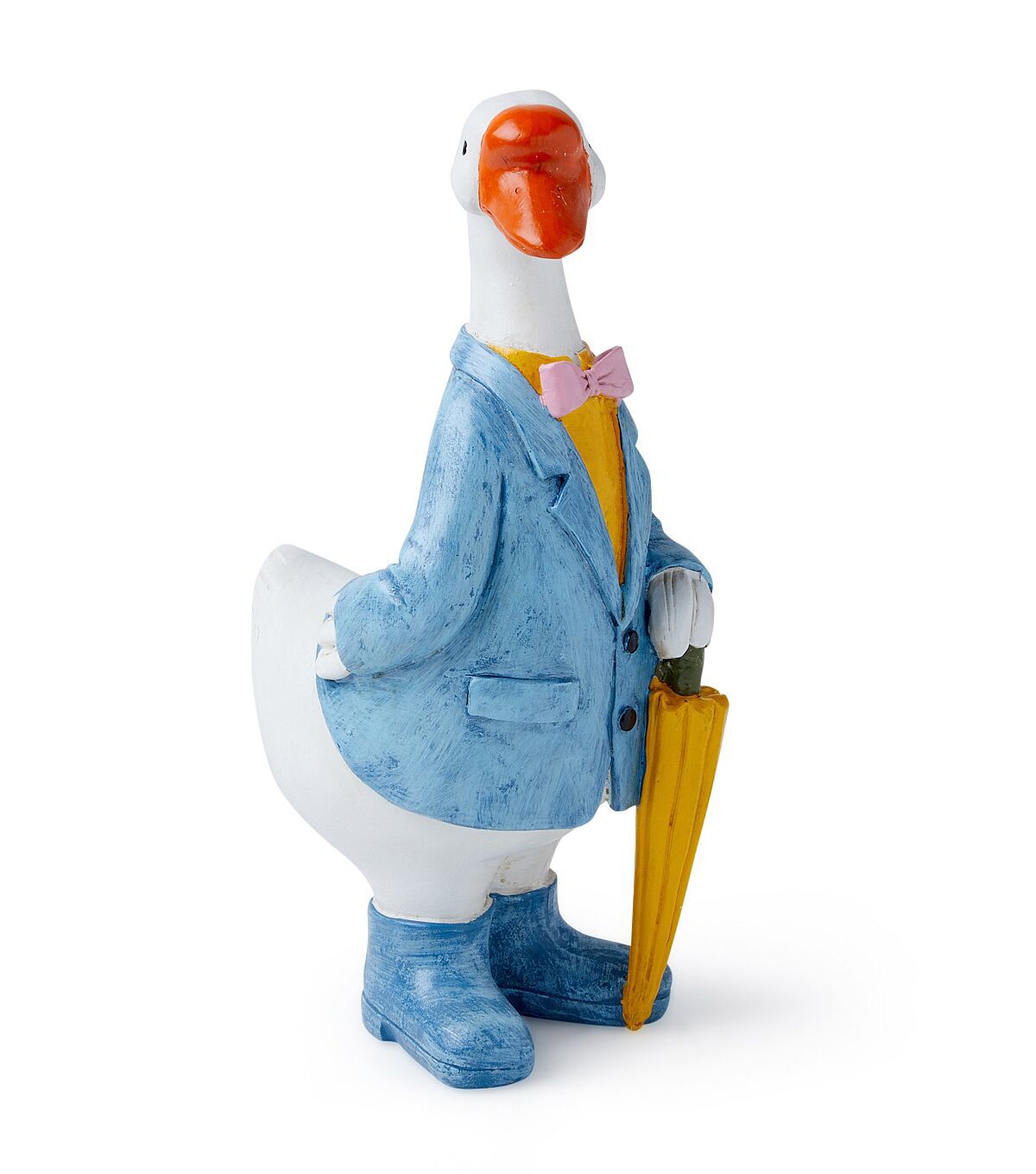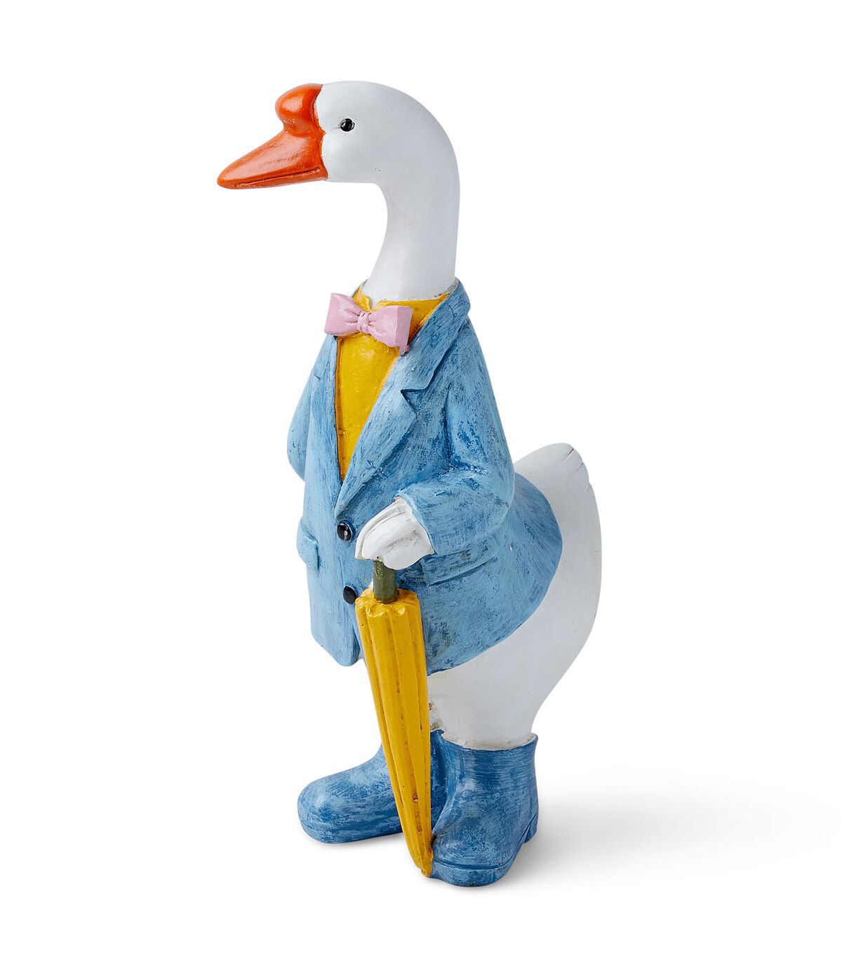 The Spring Goose in Sport Coat Outdoor Garden Statue by Place & Time is just what you need to decorate your garden this spring season. This goose garden statue holds a yellow umbrella and wears a pink bow tie and a blue coat. Team it with a gnome statue, sold separately, for added visual appeal.