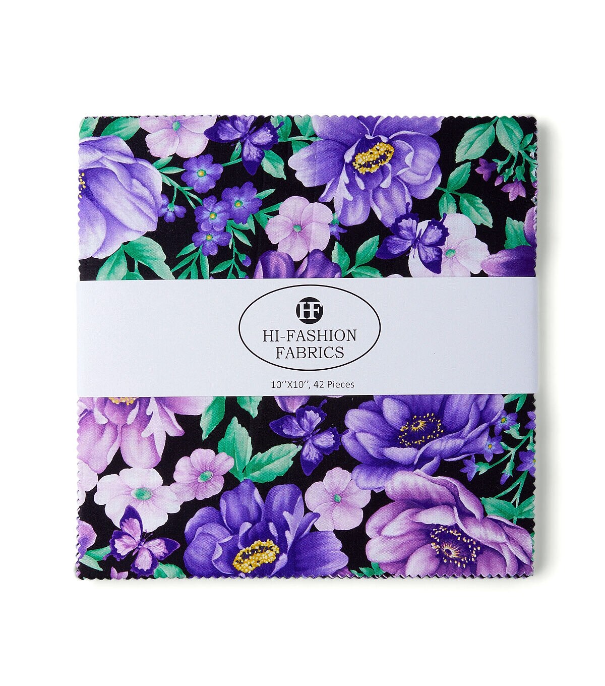 Upgrade Your Crafting Game with 10" x 10" Hi Fashion Batik Purple Floral Cotton Fabric Squares 42pc