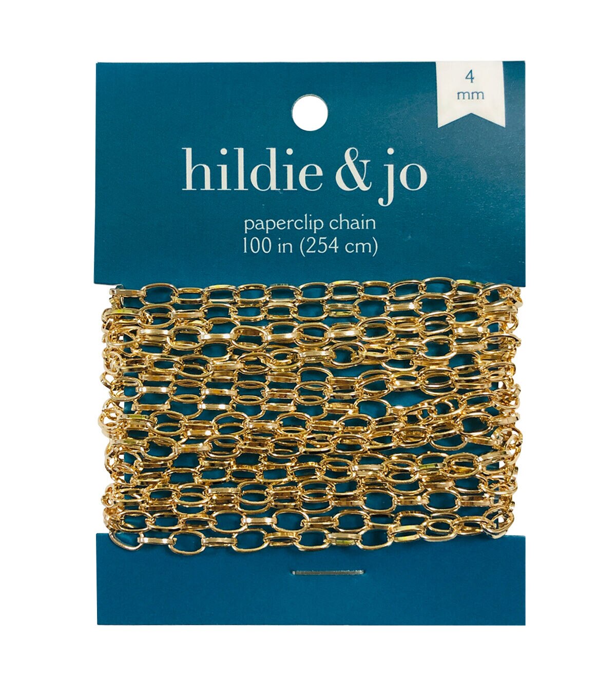 The hildie & jo Small Round Paperclip Chain - Gold is just what you need if you love creating your own jewelry. This pack includes a gold-toned chain that resembles interlocked paperclips. Cut it into desired lengths and add beads, charms and more to the pieces to make elegant necklaces, bracelets, keychains and so much more.