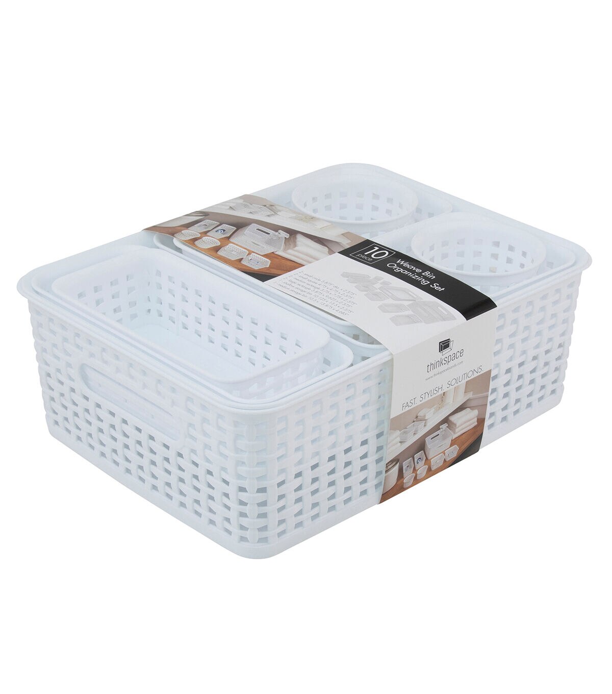 Make clutter disappear with the 10 Pack Weave Bins. This set of 10 weave bins comes in different shapes and sizes to help you utilize your space. You can use the bins separately or nest them to fit your needs. Keep yourself organized at home or in the office with the 10 Pack Weave Bin set.
