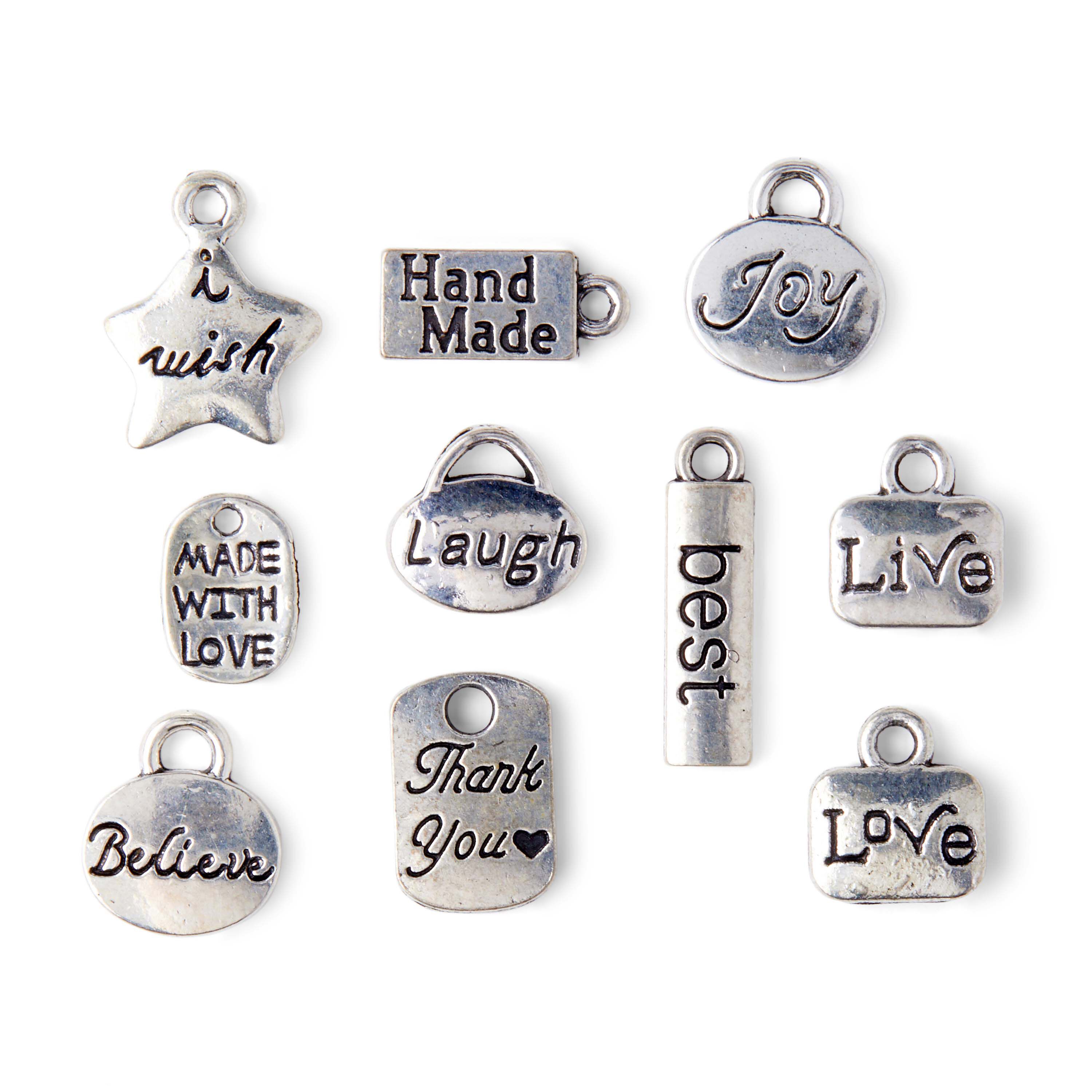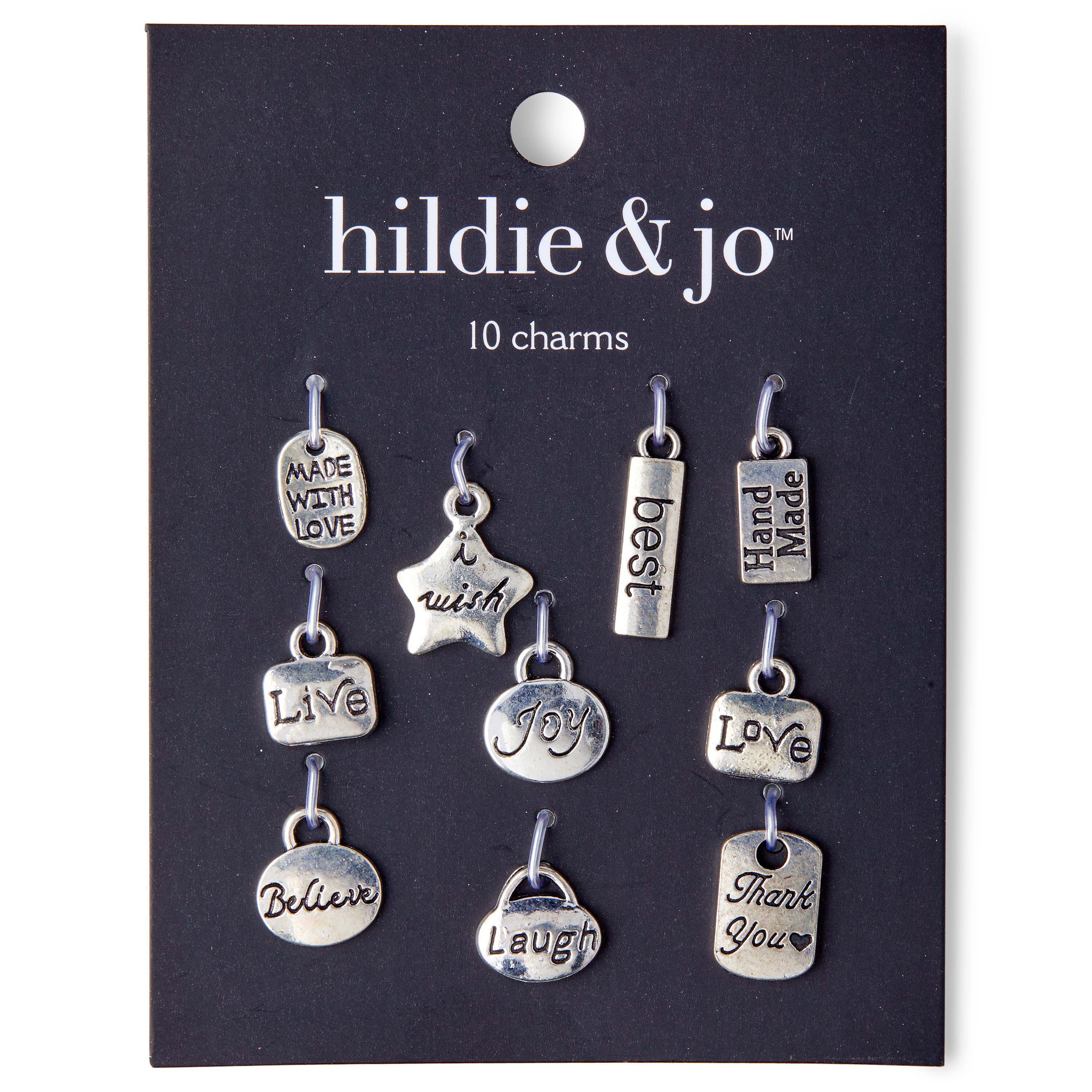 Add a dash of inspiration to your DIY jewelry projects with the hildie & jo Metal Words Charms. The 10 unique charms in this set have words like 'I Wish', 'Made with Love', 'Live', 'Joy', 'Love' and more written on them. Use them to design bracelets, necklaces and more.