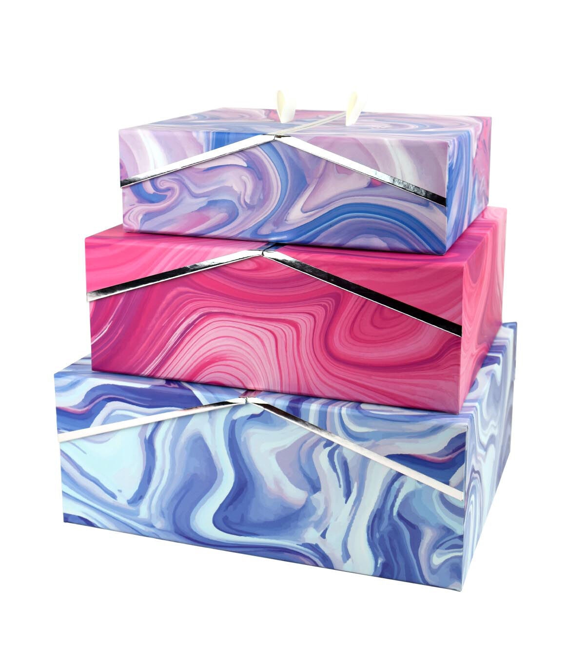 Store photos, small stuffed toys and more in the Medium French Door Storage Box with Metallic Trim - Marble Pattern. Sporting a marbleized pattern in a lovely hue, this storage box will lend a unique look to your home decor. It is designed with a French door-style lid for added appeal. You can also use it to store newspapers, books and craft supplies.