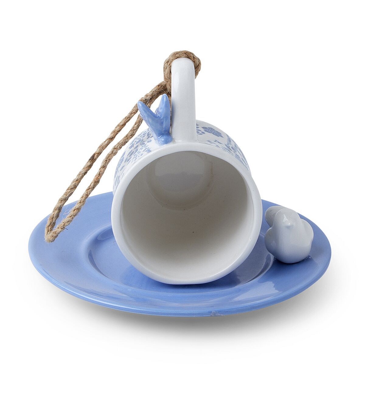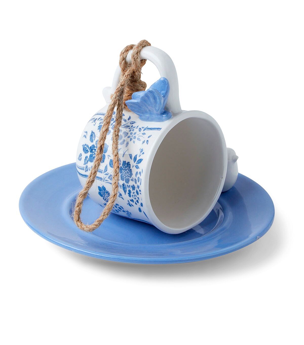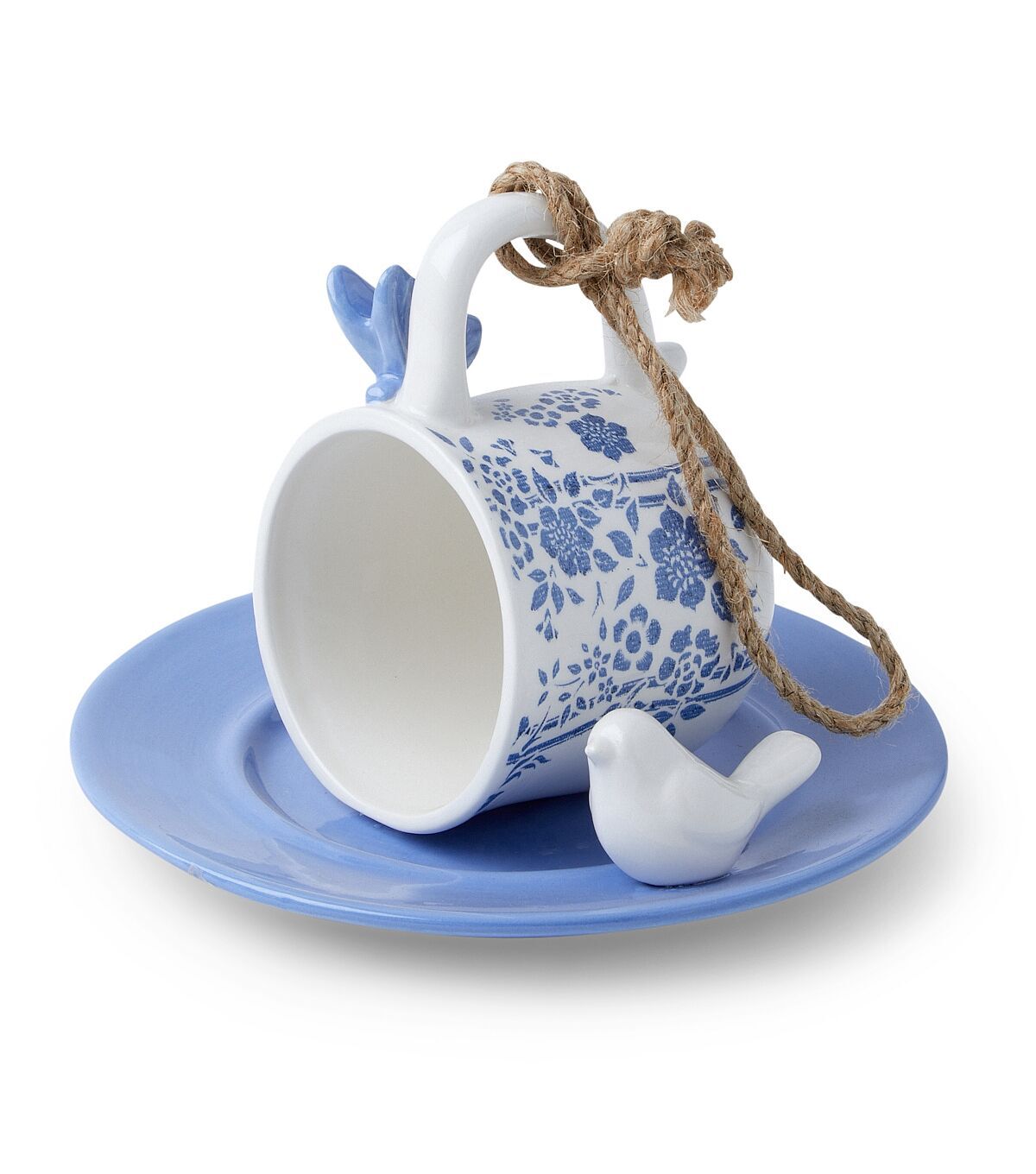 Welcome your feathered friends this spring by making the Spring Blue & White Ceramic Teacup Bird Feeder by Place & Time a part of your outdoor decor. This beautiful bird feeder resembles a cup placed on a saucer with a bird beside it. You can team it with a birdhouse and birdbath, and hang them from a bracket hook, sold separately, on your porch or balcony.
