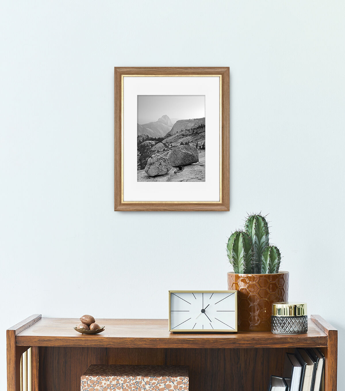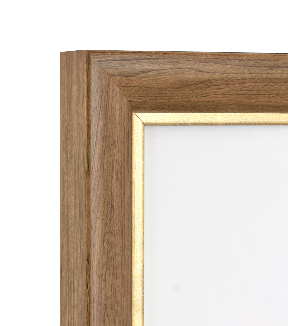 This classic matted picture frame features a walnut finish border with inner brass accent. The frame is constructed of sturdy MDF and features a white beveled mat. This frame holds one 8x10 inch photo displayed inside the mat opening or one 11x14 inch photo displayed without the mat.