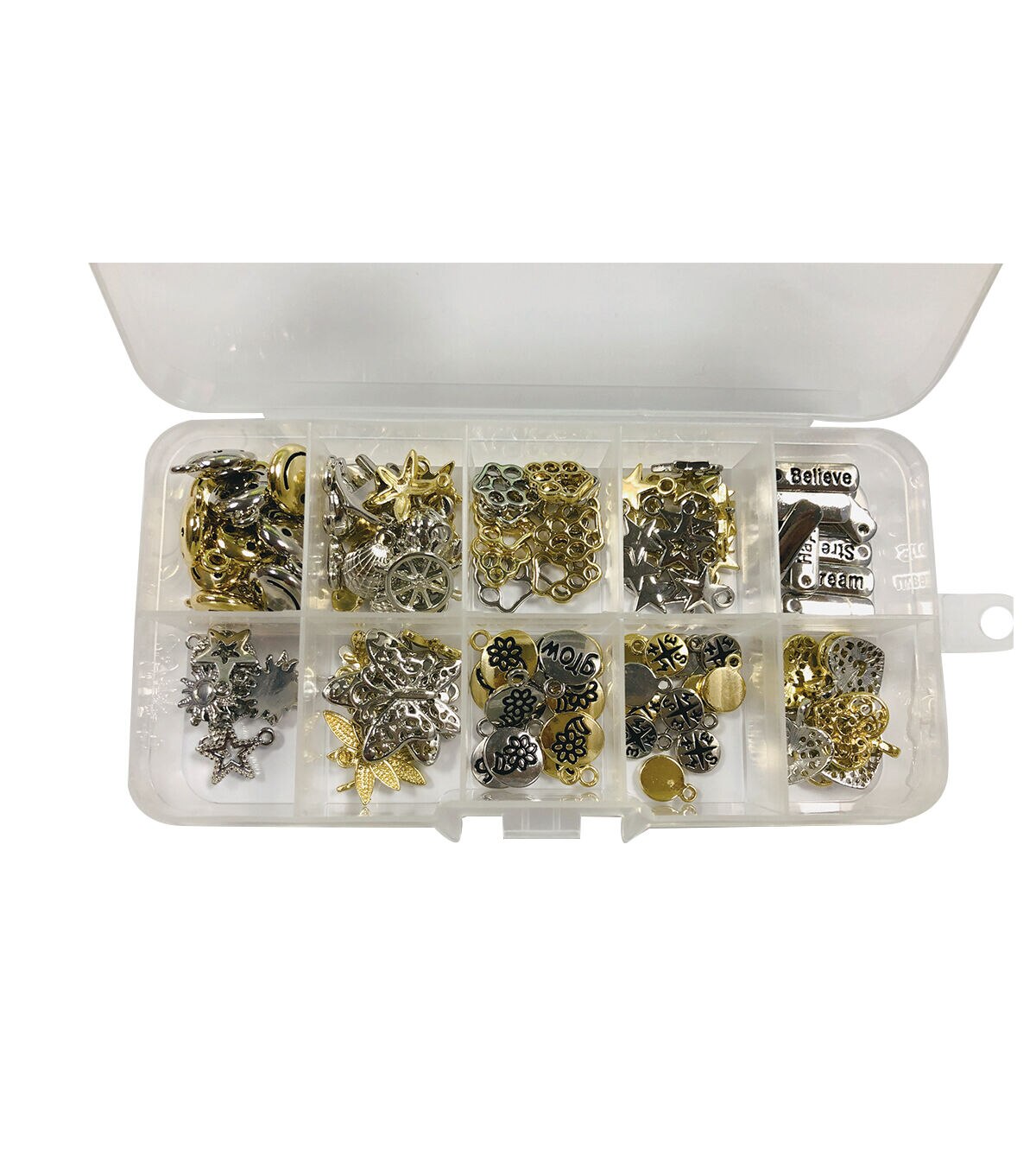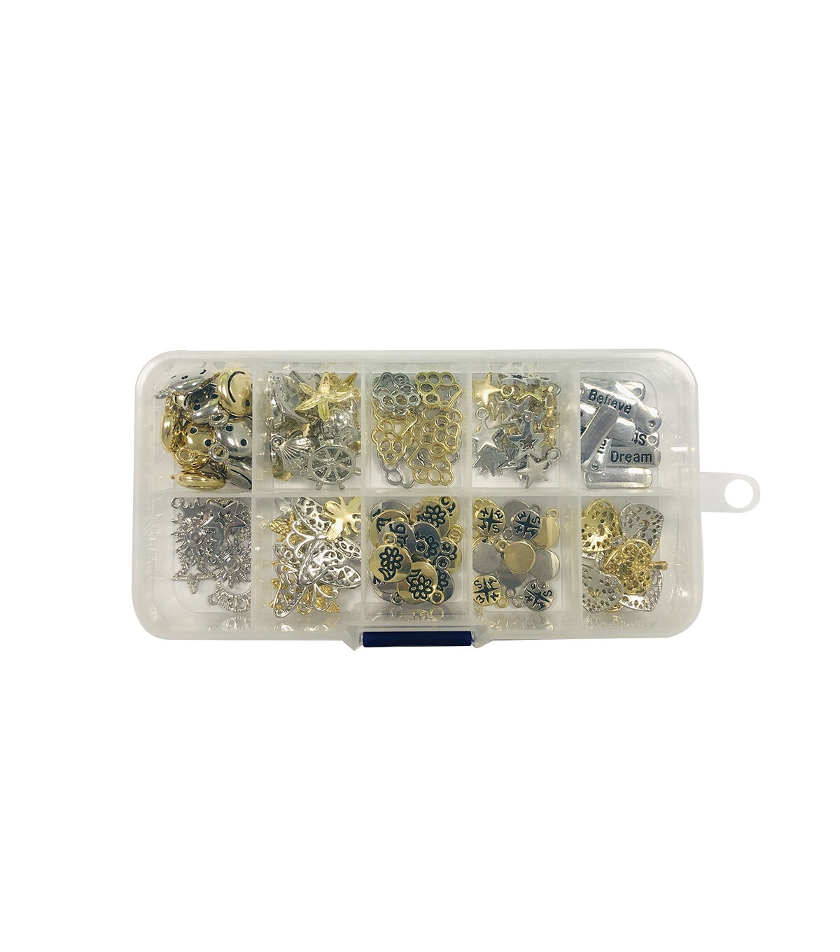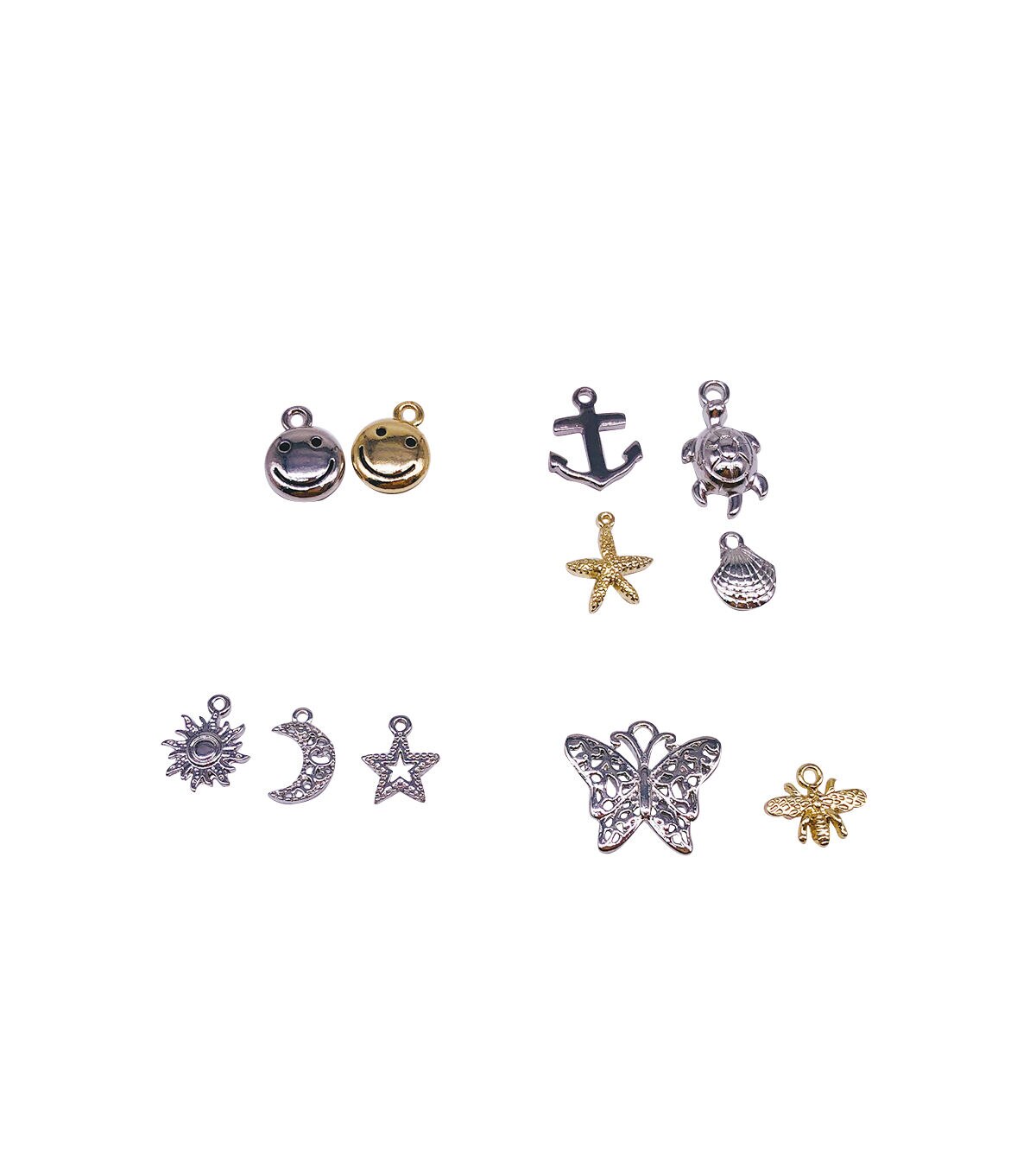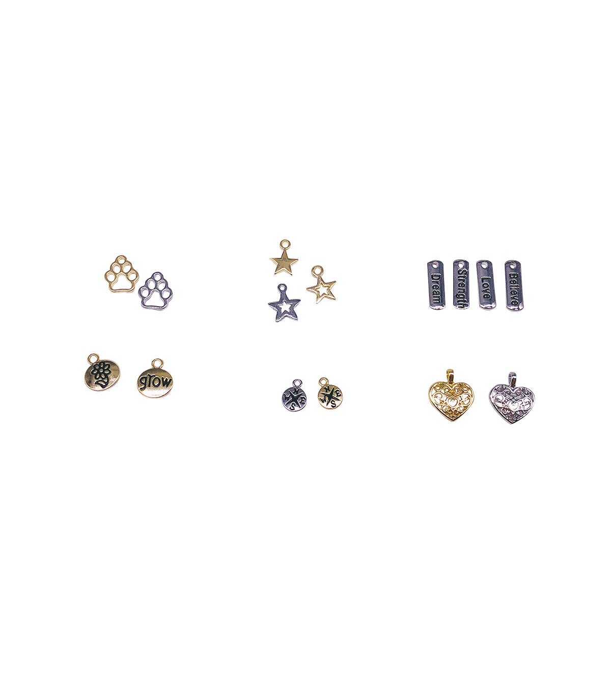 The hildie & jo Metal Charm Kit - Icons is sure to delight any jewelry designer. This box includes silver-and gold-toned charms in different shapes, with some sporting unique engravings and cutout patterns. You can use them to create personalized jewelry pieces such as necklaces, keychains, earrings, bracelets and more.