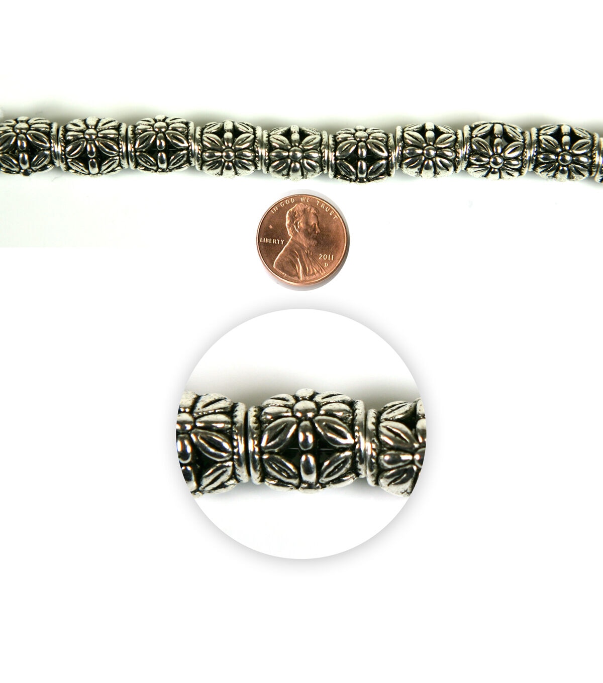 Create a lovely multi-strand bracelet with the hildie & jo Barrel with Flower Metal Strung Beads - Antique Silver. These barrel-shaped metal beads sport a silver tone with an antique finish. They flaunt a lovely flower pattern. You can use these beautiful beads to make bracelets, necklaces and other fashionable pieces in today's styles.