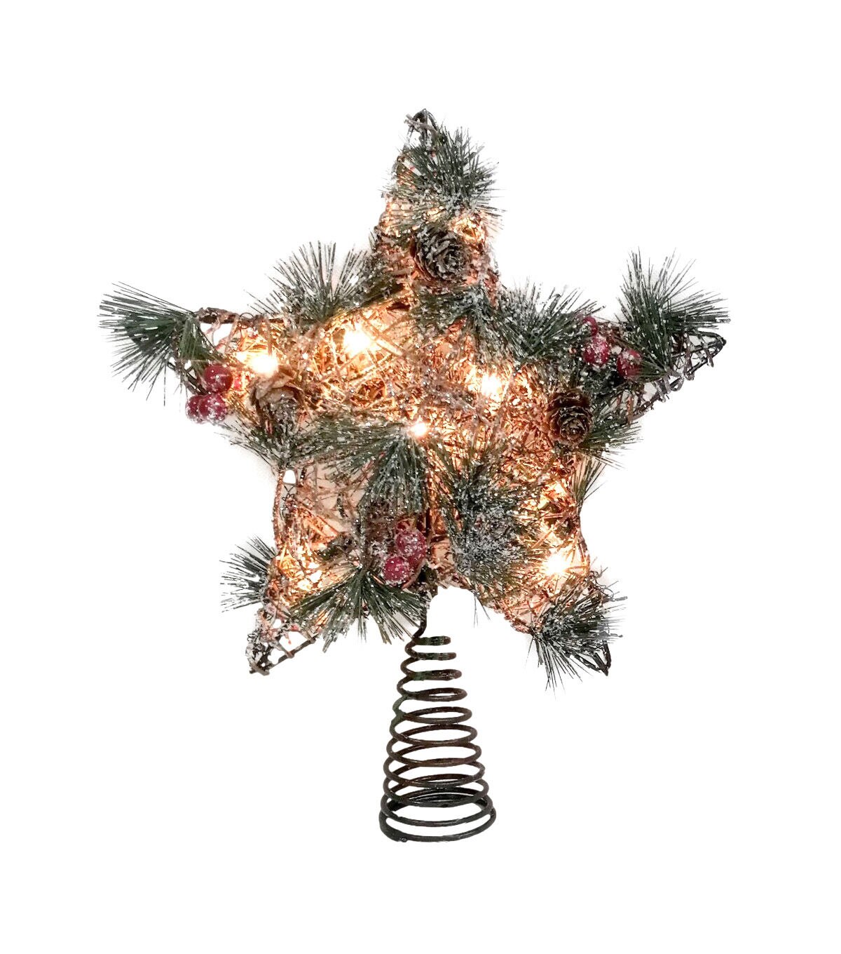 Lend the perfect finishing touch to your holiday tree with the Christmas LED Pine & Pinecone Star Tree Topper by Place & Time. This beautiful tree topper is shaped like a star and designed with faux pine needles, pinecones and berries. It is trimmed with fairy lights for added visual appeal. Elegant and shimmery, it is sure to make your Christmas tree display stand out.Brand: Place & Time Dimensions: 9.75 x 3.5 x 12 inches Content: 70% Iron, 20% Polyvinyl chloride, 5% Pinecone & 5% LED