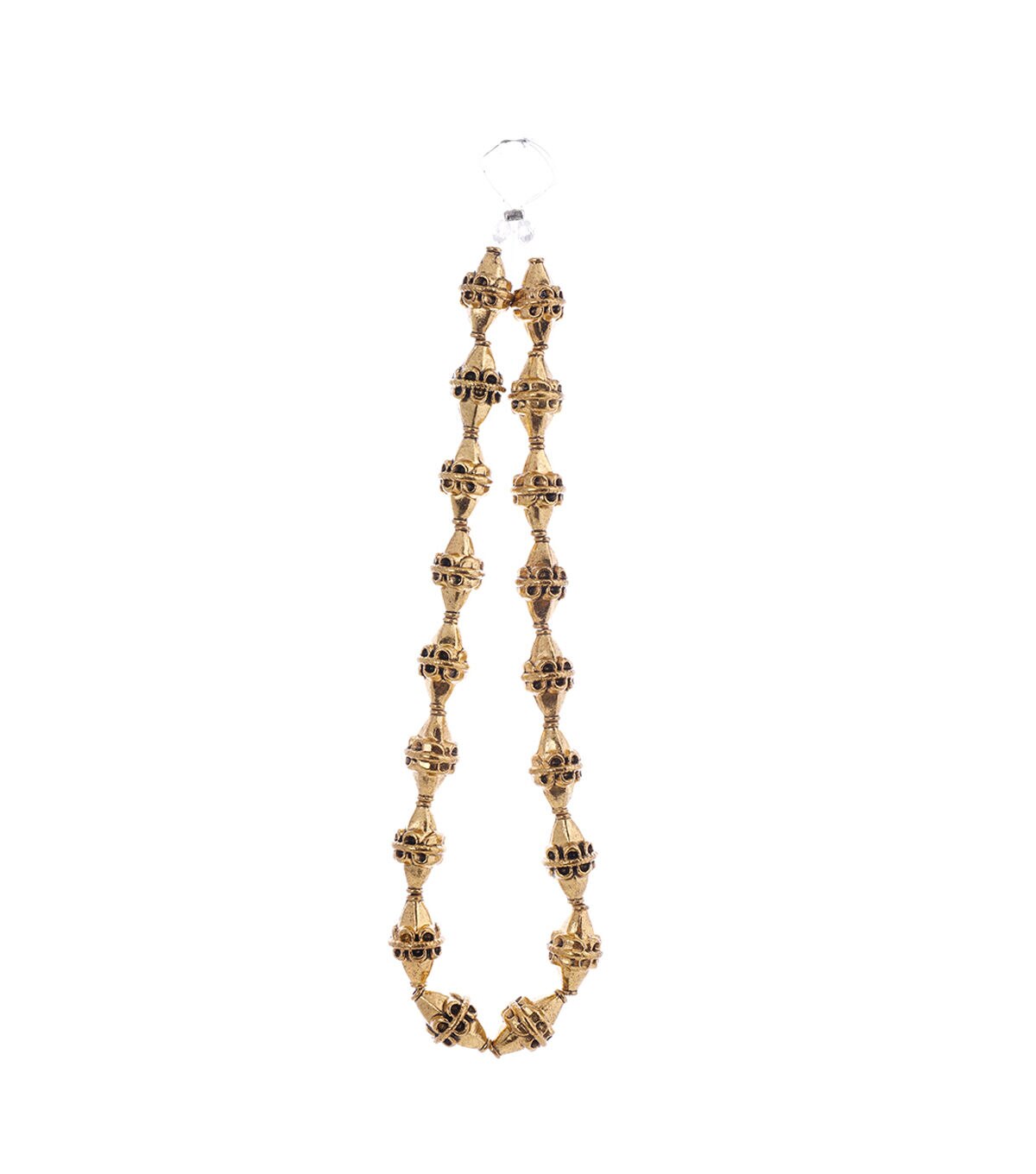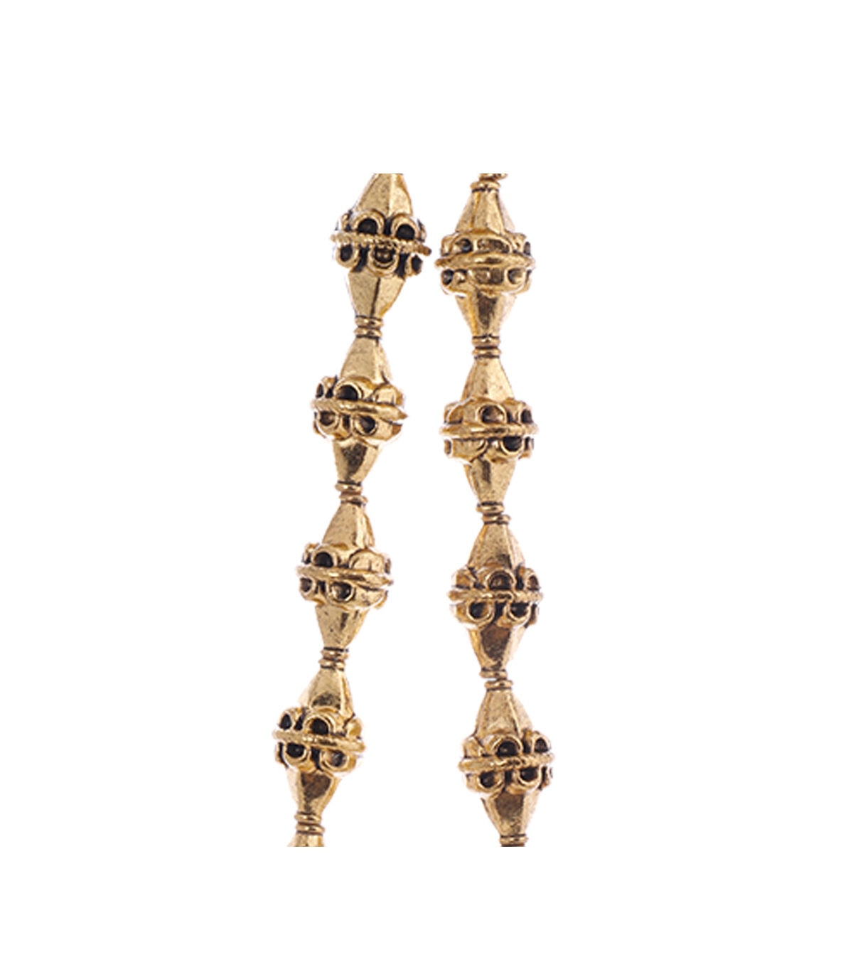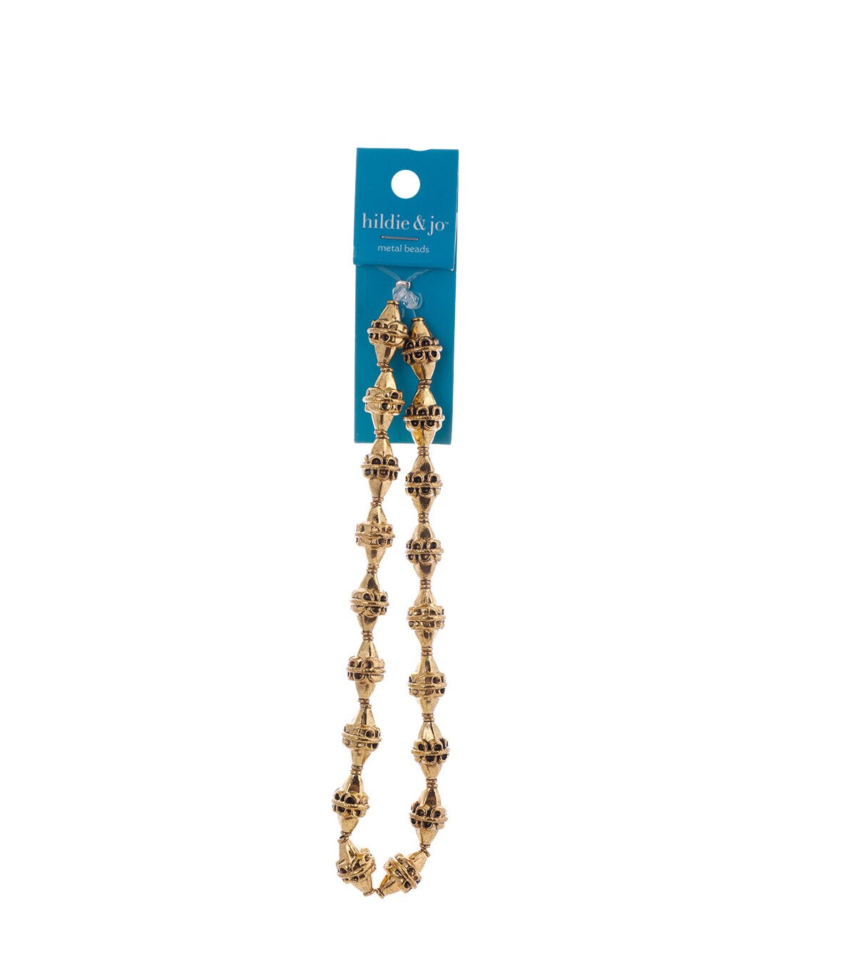 Add elegance to your jewelry designs using the hildie & jo Bicone Metal Strung Beads - Gold. These cone-shaped beads sport a gold-toned finish. Team them with spacer beads in coordinating hues to create stylish bracelets, necklaces, earrings and more. Choose from a range of exotic, handcrafted beads from hildie & jo to create trendy jewelry pieces.