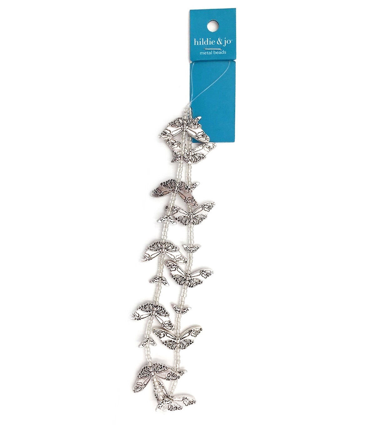 Add the hildie & jo Butterfly Metal Strung Beads - Silver to your jewelry-making supplies. These handcrafted exotic metal beads are shaped like a butterfly and sport a silver tone. You can use these beautiful beads to make bracelets, necklaces and other fashionable pieces in today's styles. They will also make a lovely addition to your handmade totes and wallets.