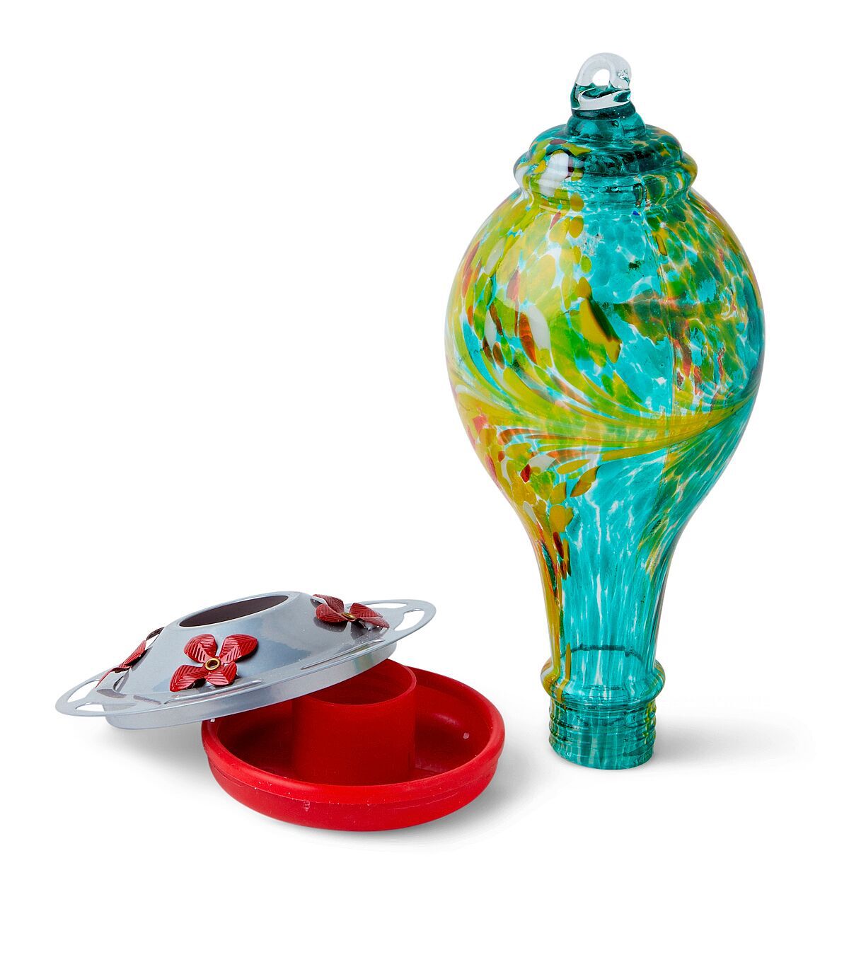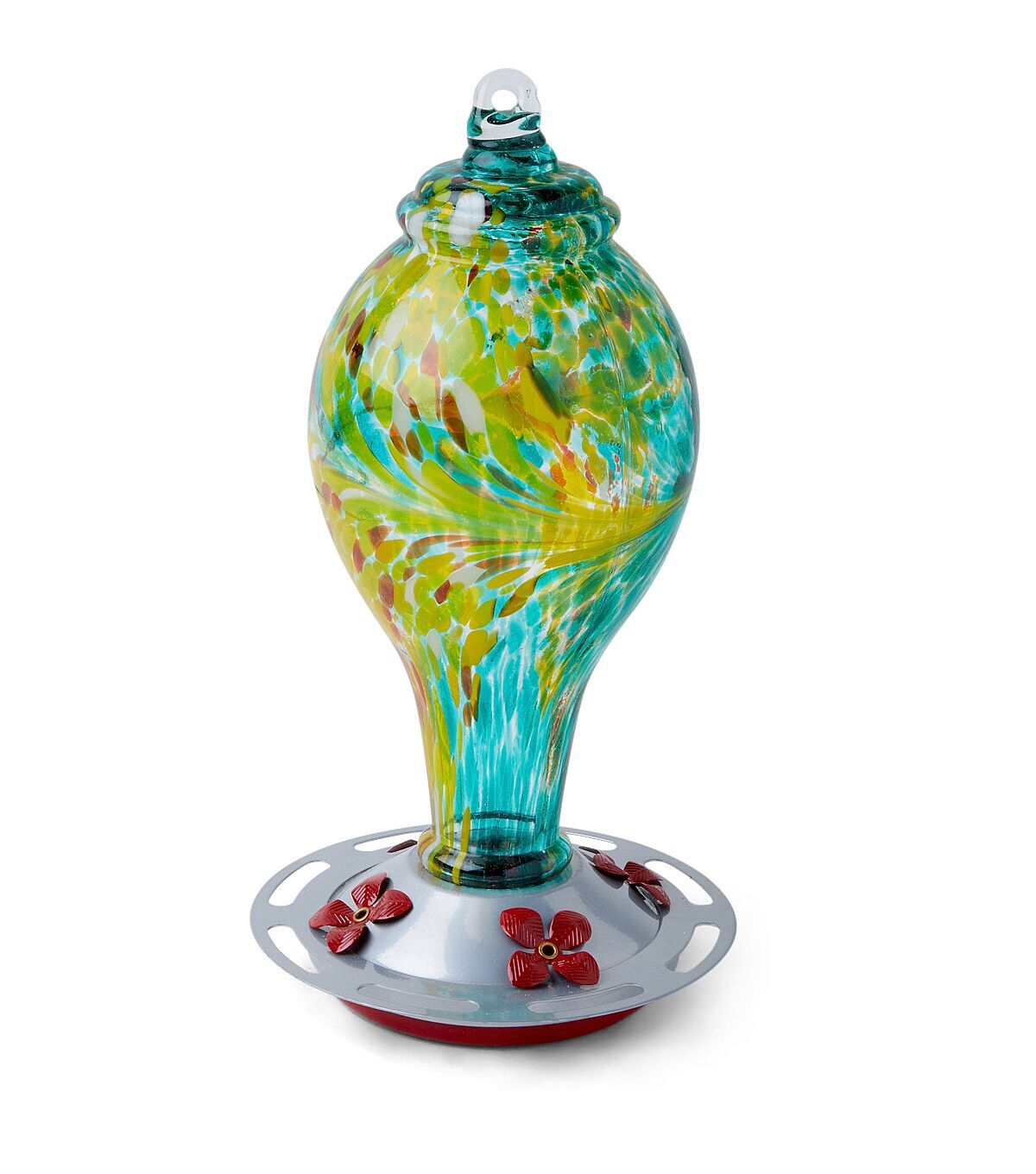 Enliven your outdoor decor with the fanciful Spring Blue & Yellow Glass Hummingbird Feeder by Place & Time. Chic and quirky, this hummingbird feeder is designed with a glass jar at the top flaunting vibrant yellow and blue hues. It is perfect to hang on your patio or porch. You can also team it with a birdhouse for the complete look.