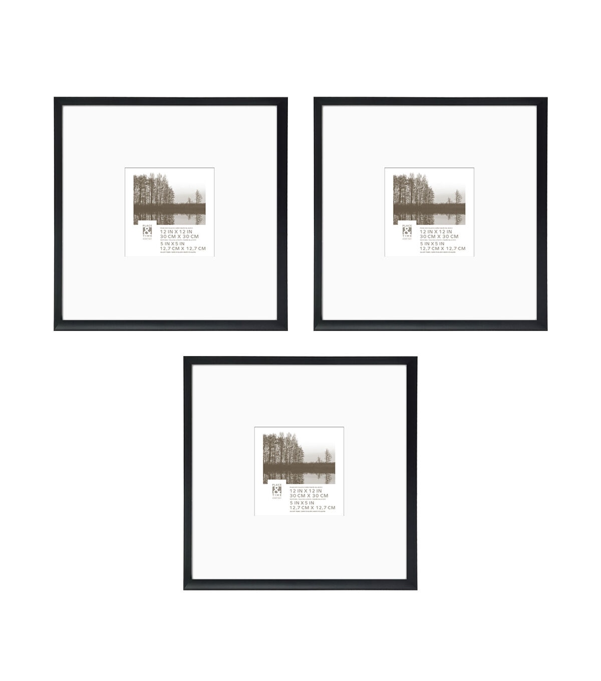 Elevate your home decor with this elegant set of three black aluminum frames from Place & Time. Crafted with precision, each 12x12 inch frame beautifully showcases photos sized 5x5 inches when using the provided mat. Whether it's cherished moments or fine art prints, these frames, complete with real glass protection, are a testament to timeless design. Their sawtooth hanger ensures easy wall mounting, making them perfect for creating a sleek gallery wall.