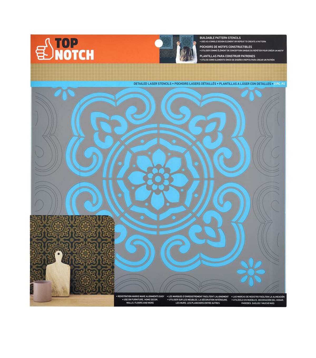 Accent your projects with the beauty of the Top Notch Buildable Traditional Stencil Sheet. This unique sheet features a large, classic pattern to elevate your crafts and DIY projects. This stencil pack comes with 2 sheets so you can easily repeat the design to create a pattern. Durable and reusable, this mylar stencil sheet is easy to clean up with mild soap and warm water. Customize your next project with the Top Notch Traditional Stencil Sheet.