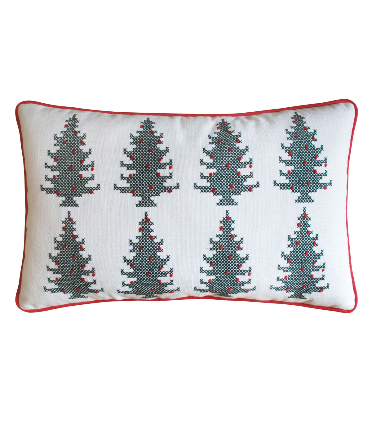 The Christmas Green Trees on White Lumbar Pillow by Place & Time will perfectly complement your holiday home decor. This lumbar pillow flaunts a cross-stitch embroidery of spruce trees in green with subtle details in red. Piping in red gives it a finishing touch. It will look perfect on a loveseat. You can also add it to an armchair teamed with a throw.