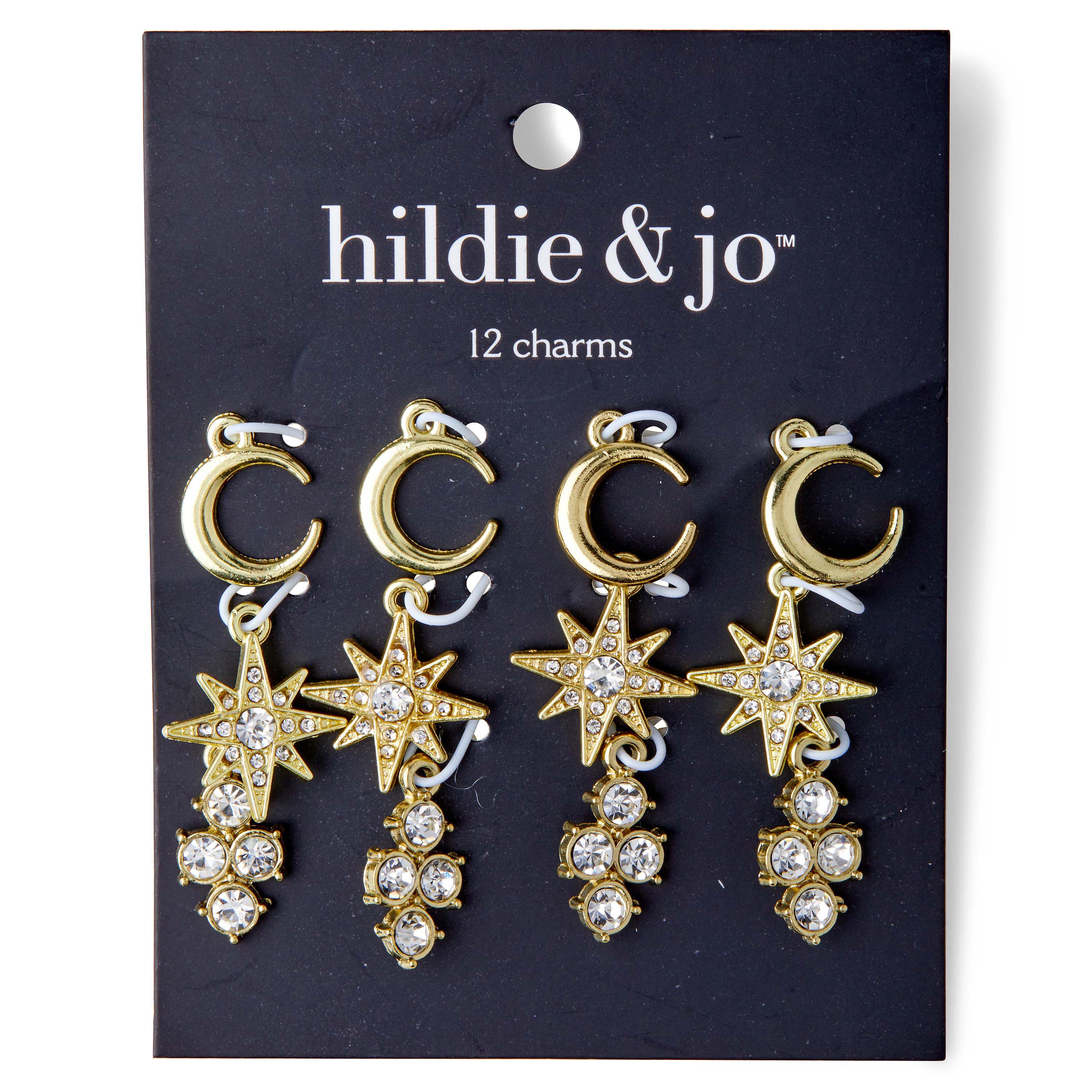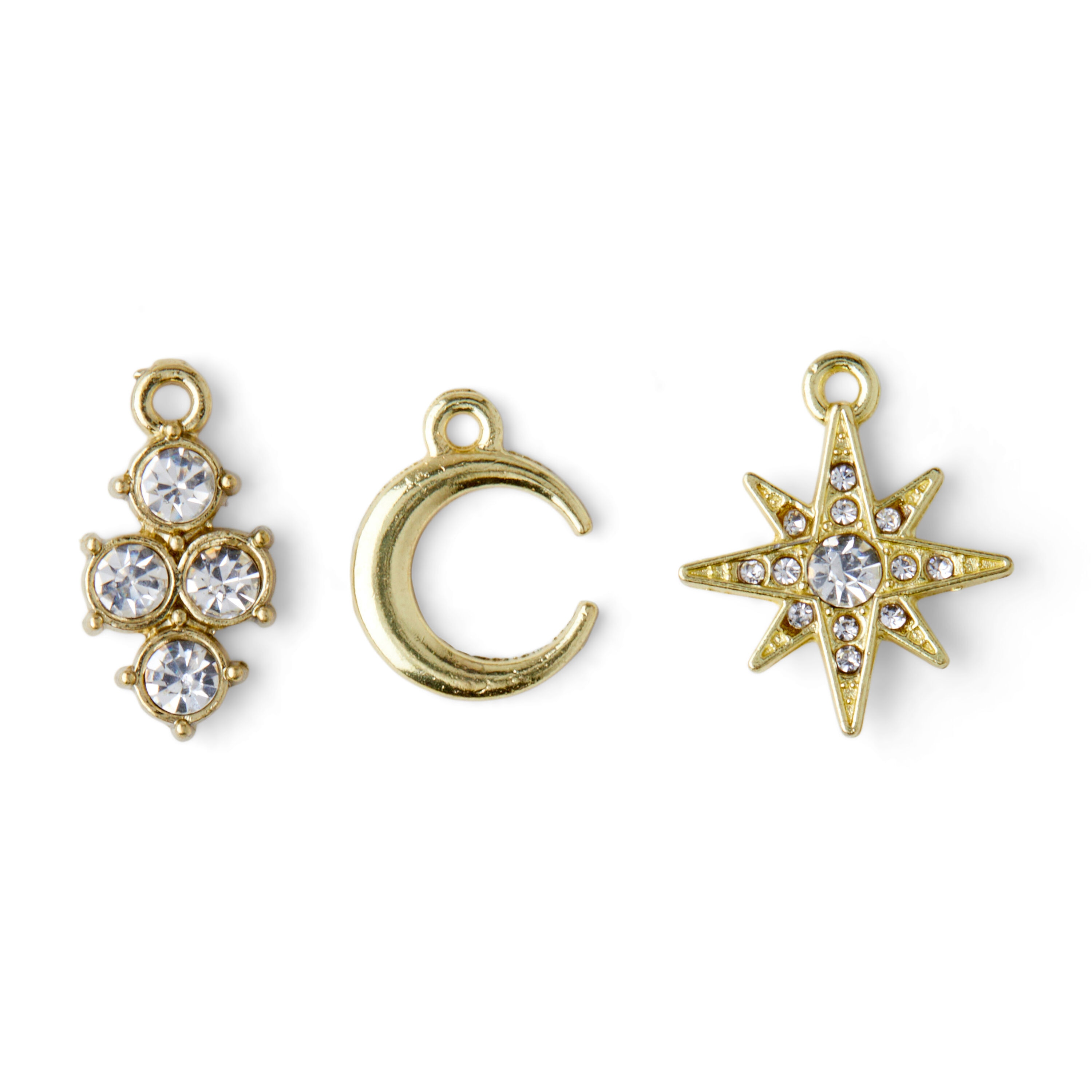 Lend a fancy look to your jewelry-making projects using these hildie & jo Boulevard Moon & Star Gold Charms-Crystals. Visually aesthetic, these charms feature a smooth gold polish and are accentuated with a six point star charm, which comes craftily encrusted in crystals. Perfect for any DIY project these moon charms come in a pack of 12. Add them to your bracelets, chokers, keychains and more to create a delightful impression.